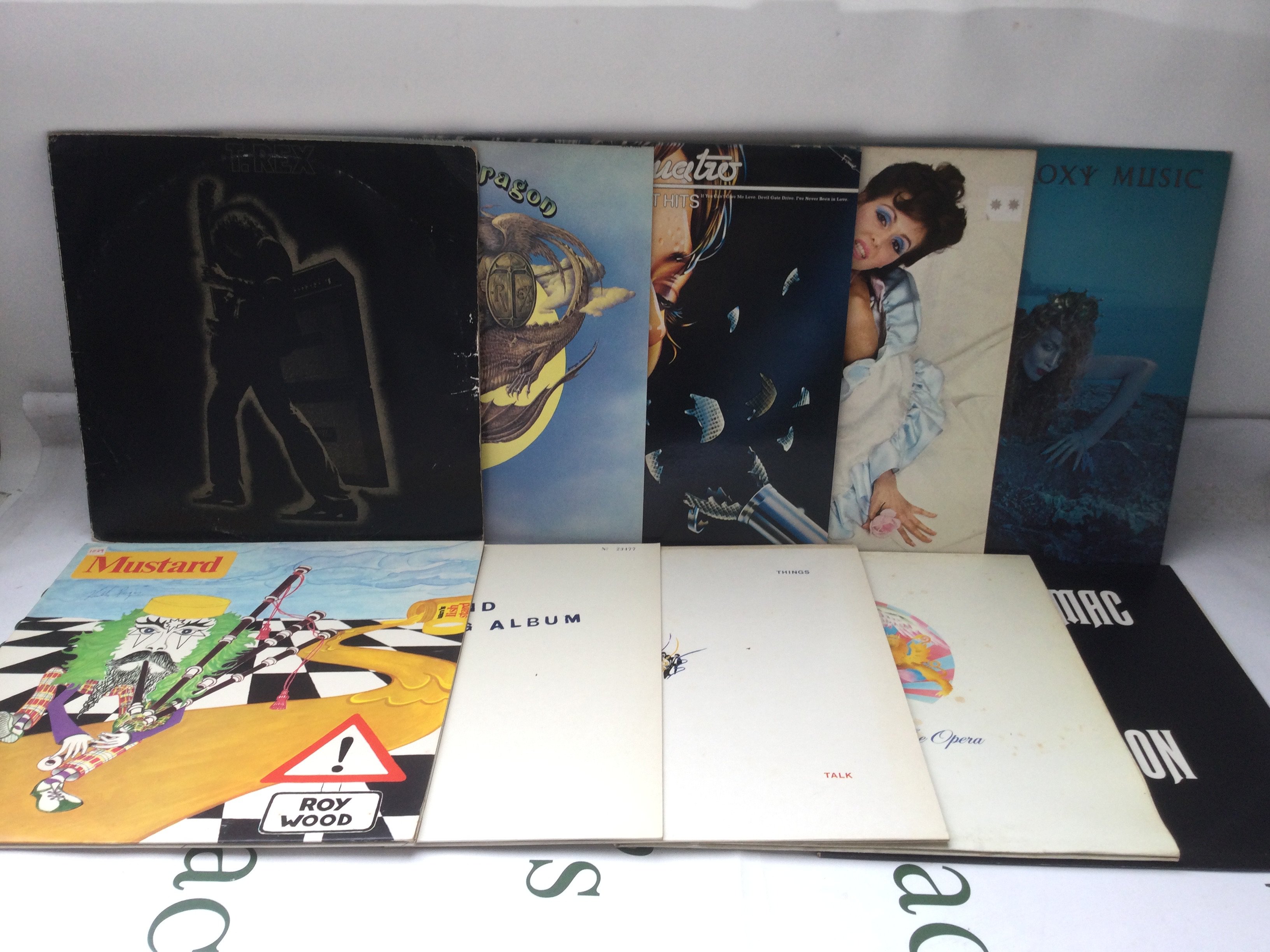 Two bags containing twenty 1970s rock and pop LPs by various artists including T Rex, Queen, Roxy Music and others.