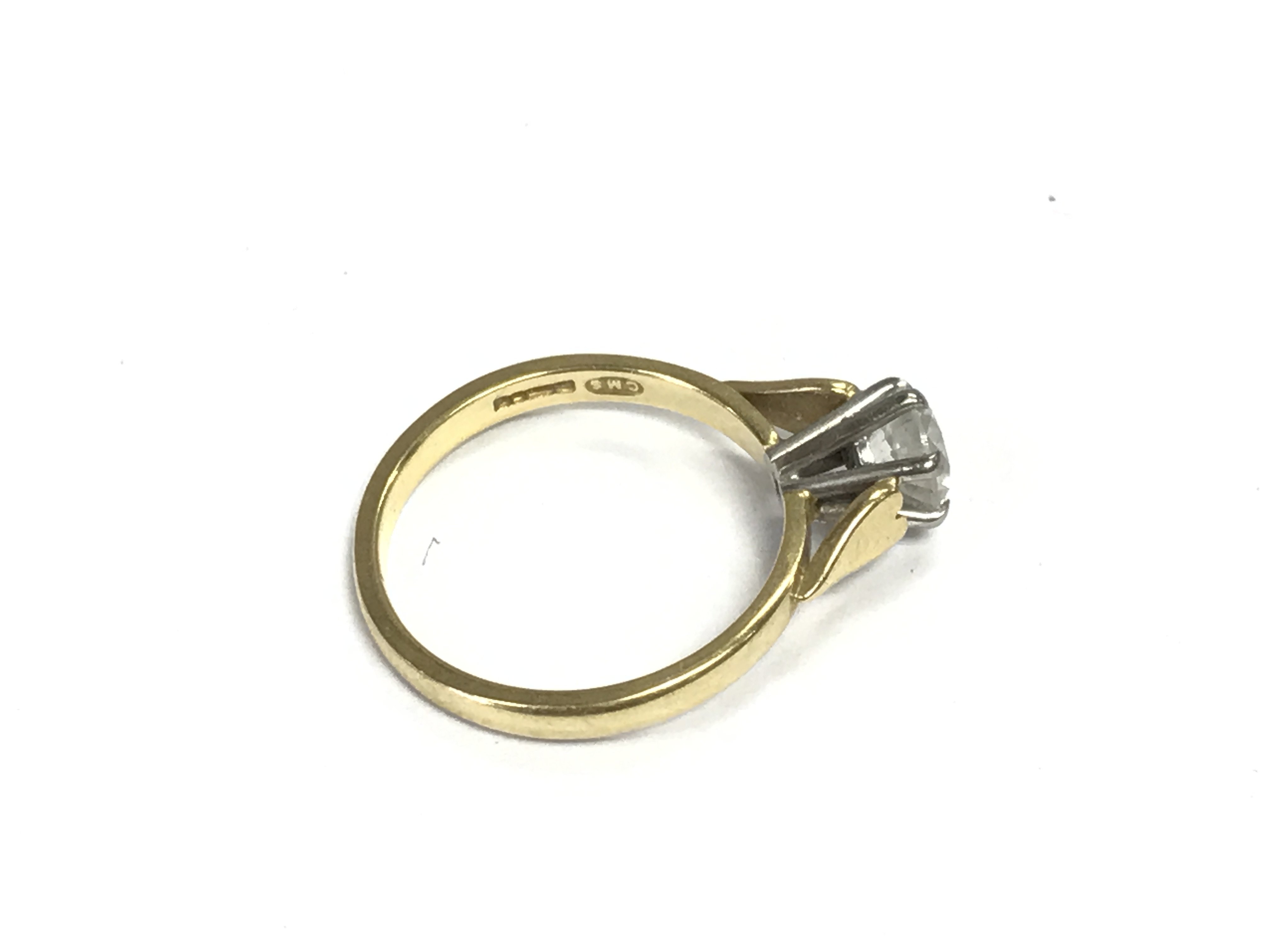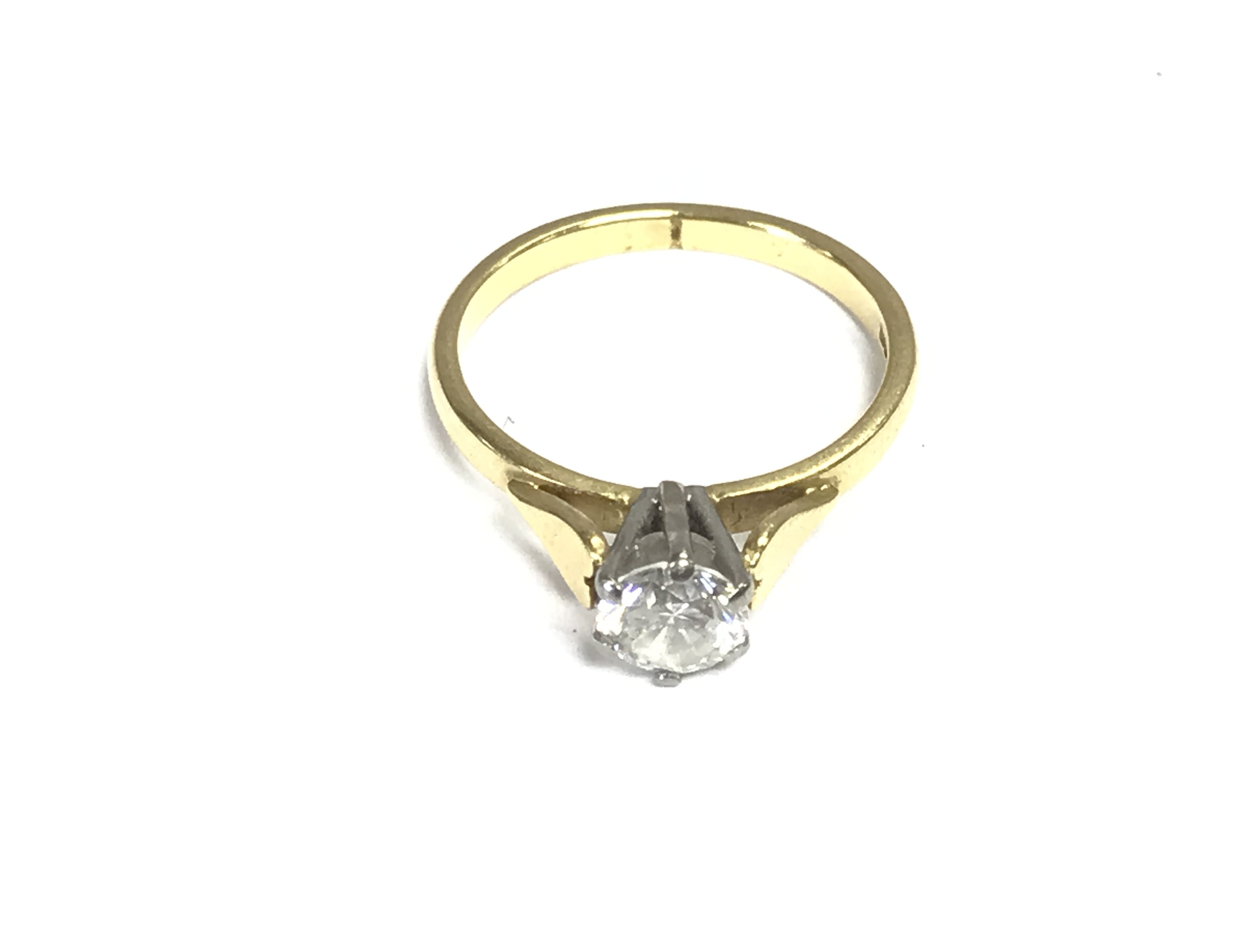 An 18ct gold solitaire diamond ring. Diamond approximately 0.85ct. Size M 1/2 and 3.22g. Postage A