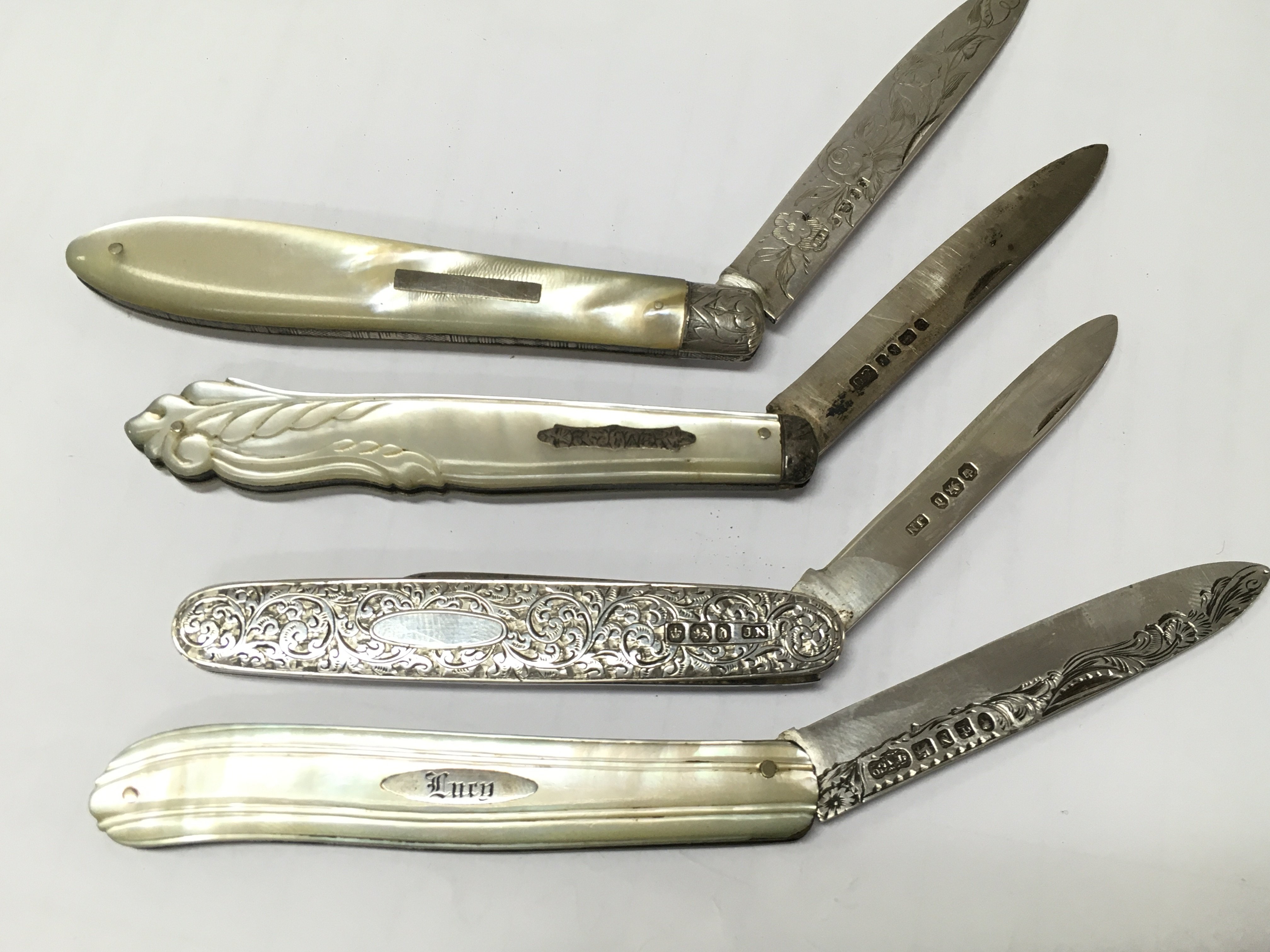 A collection of Mother of Pearl knives and silver hallmarked fruit knives . This lot cannot be posted