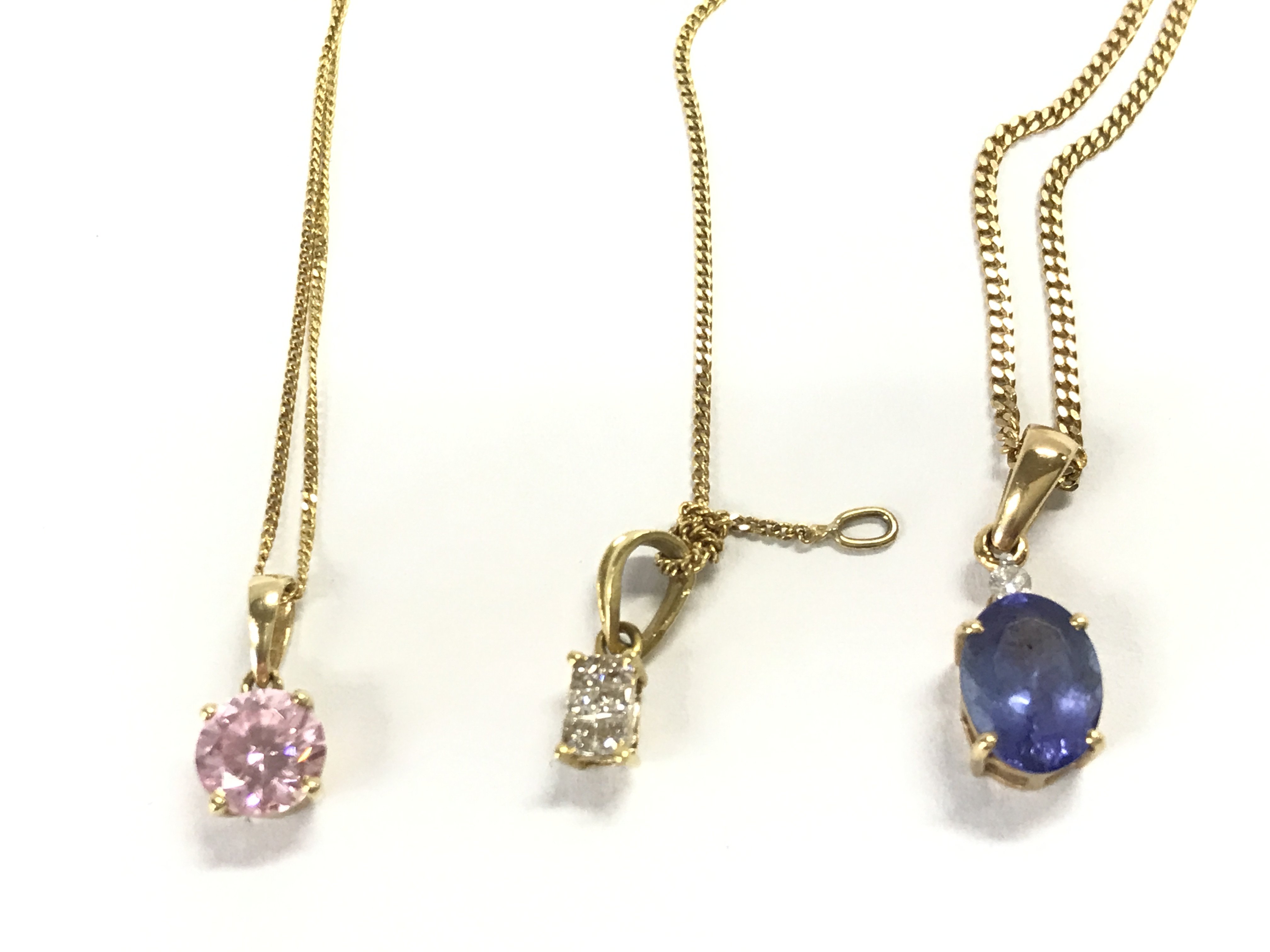 Three 9ct gold chains each set with a coloured stone including diamonds and Tanzanite. 8.05g total. Postage A