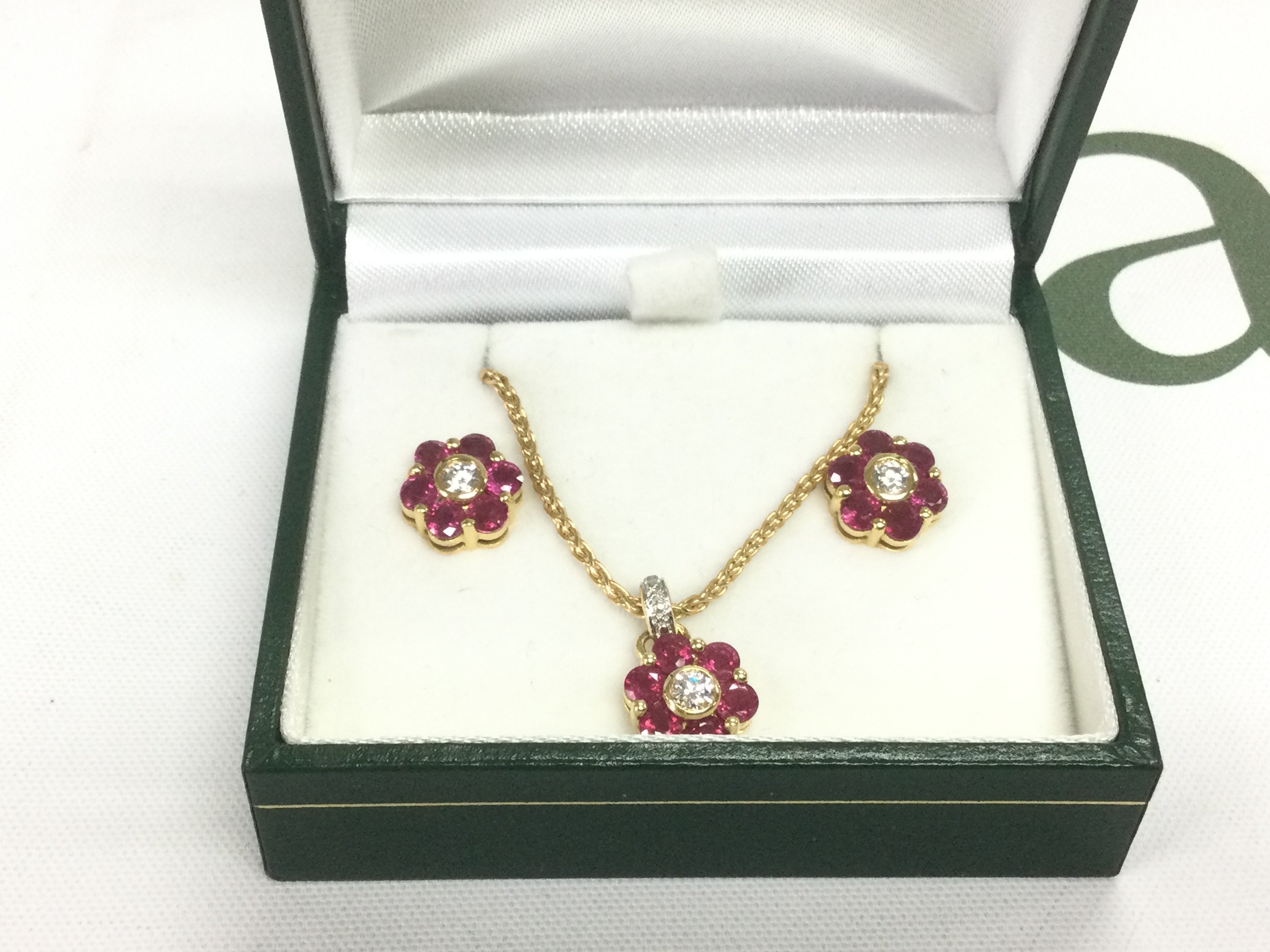 An 18ct gold, ruby and diamond daisy cluster pendant and earrings. Diamond colour G/H VS2/SiP. Shipping category A.