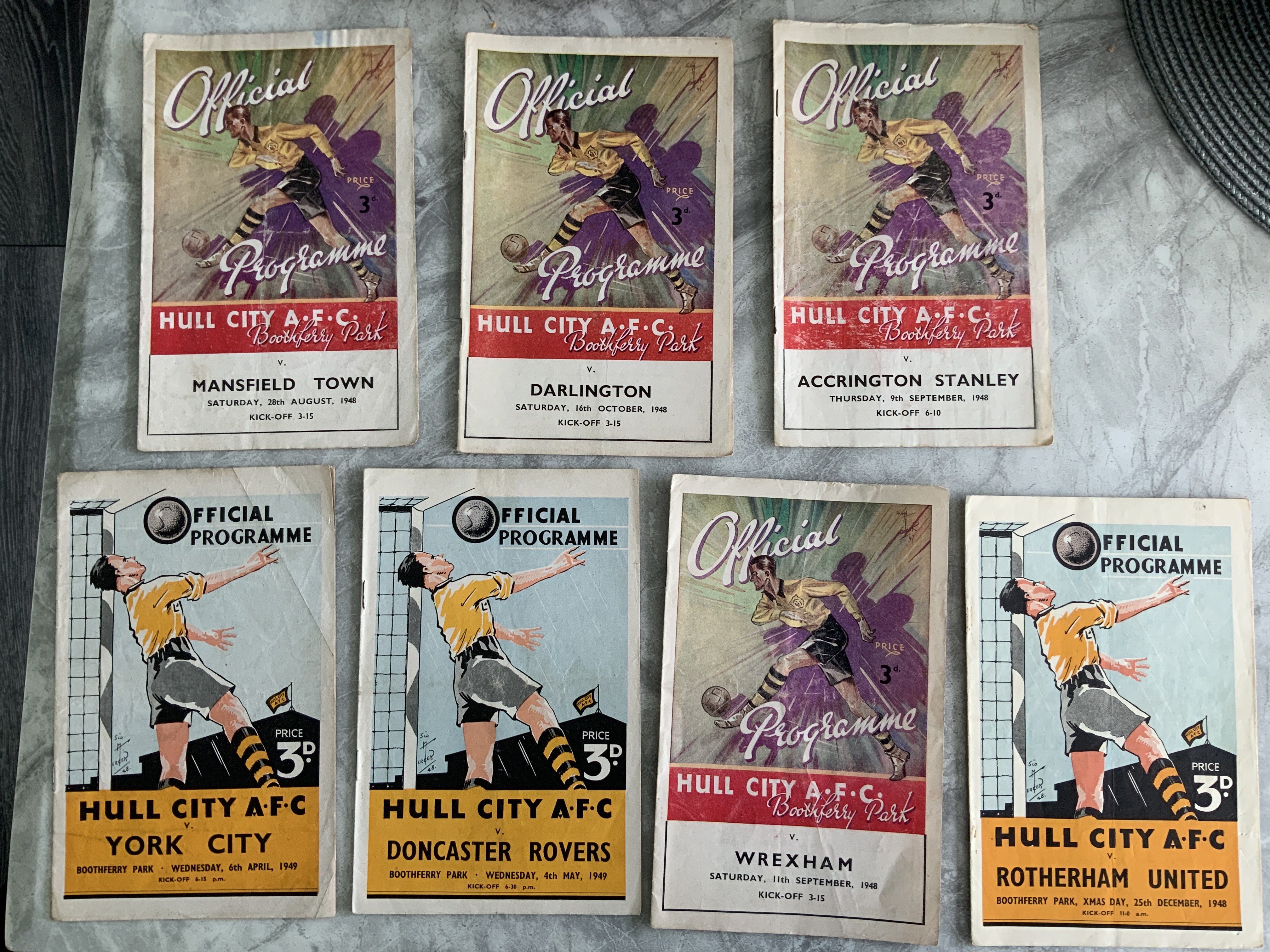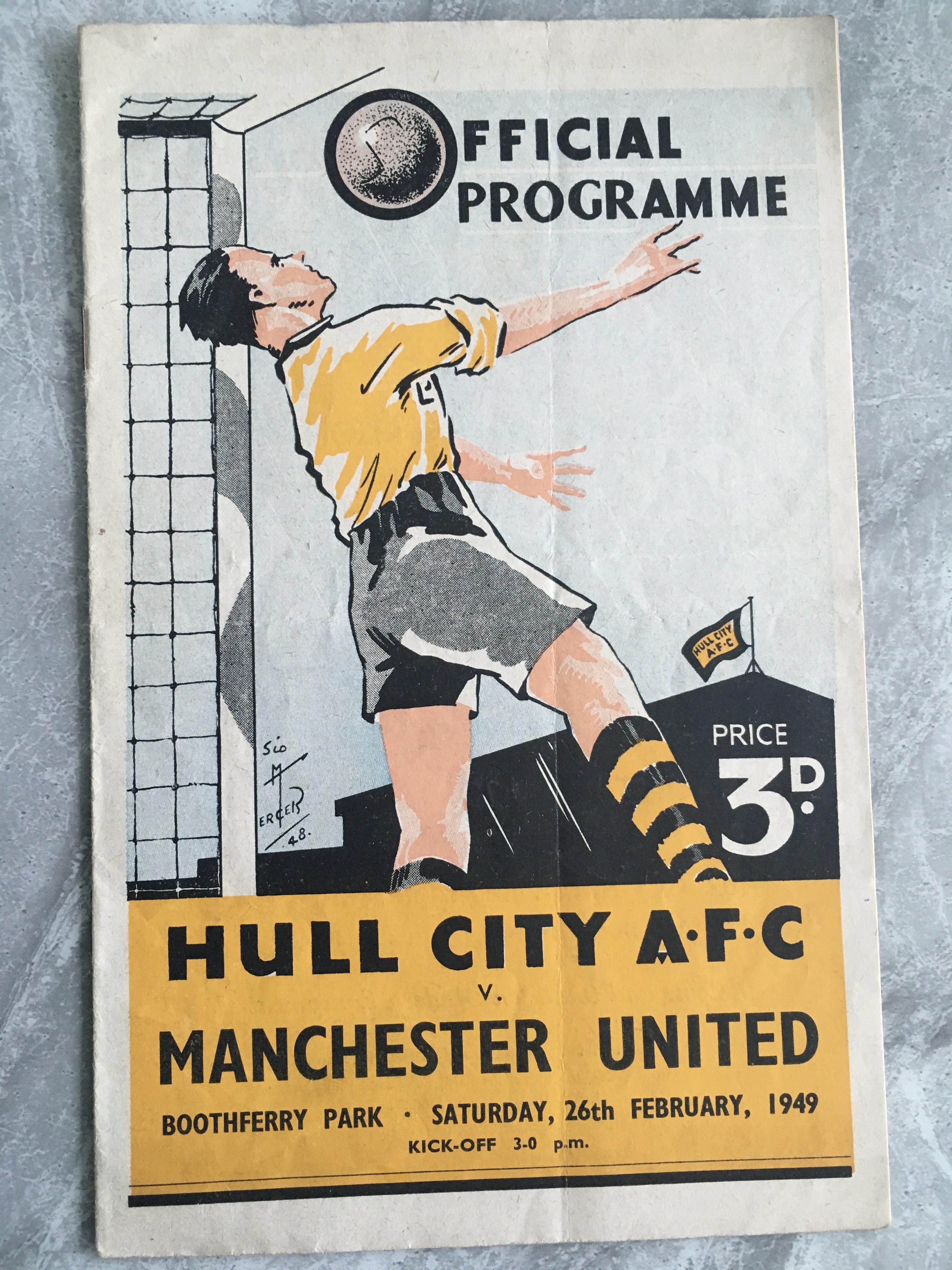 48/49 Hull City Home Football Programmes: Matches v Manchester United Wrexham Doncaster York Rotherham Accrington Stanley Darlington Mansfield Southport Reading all very good with New Brighton and Stockport having faults plus Crewe Barrow and Hartlepool with score to cover. (15)