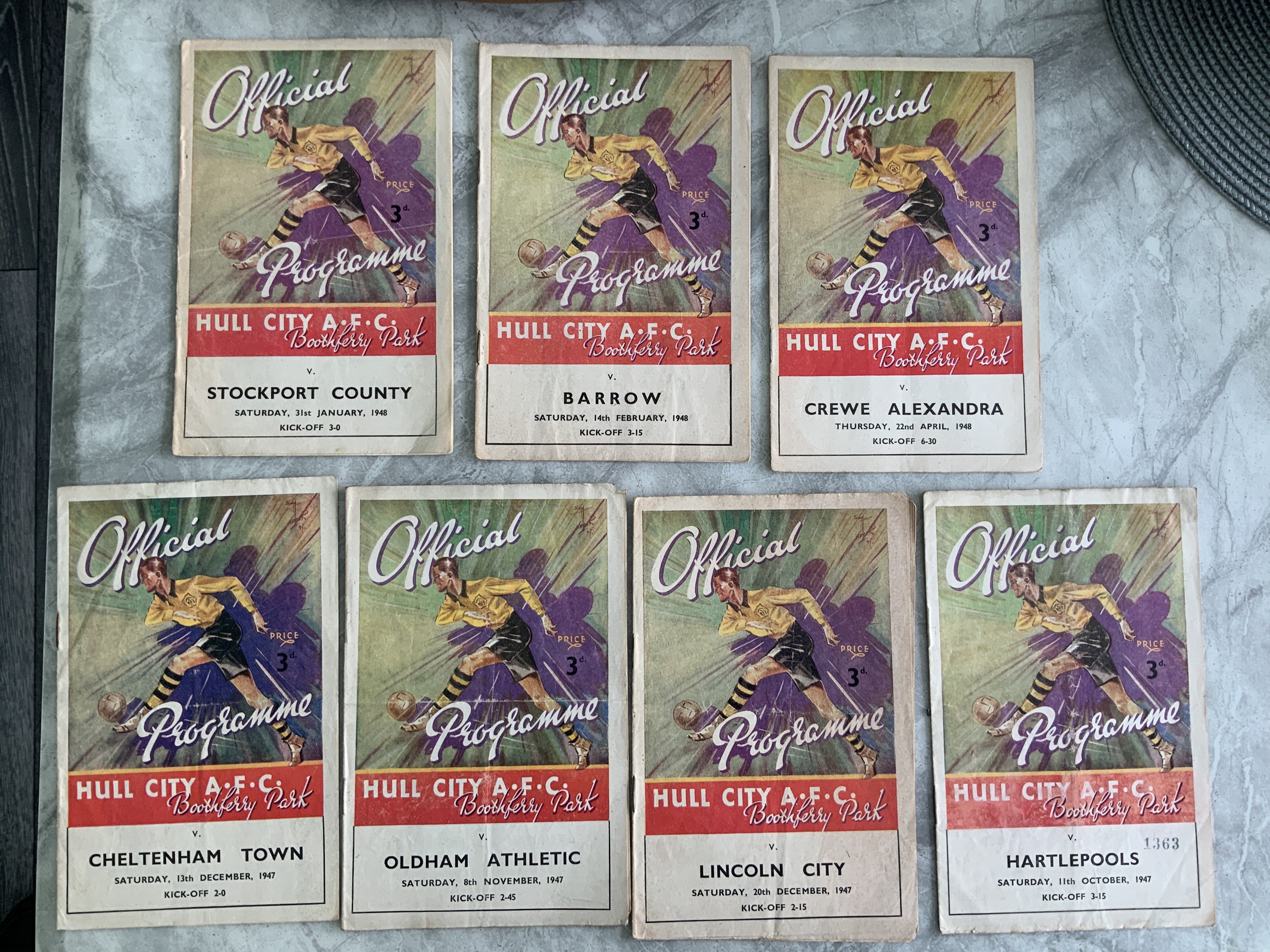 47/48 Hull City Home Football Programmes: Matches v Rotherham Accrington Stanley Mansfield Stockport Crewe Barrow Chester Rochdale Cheltenham Oldham Lincoln Middlesbrough and Hartlepool. Mainly good with a few having folding. (13)