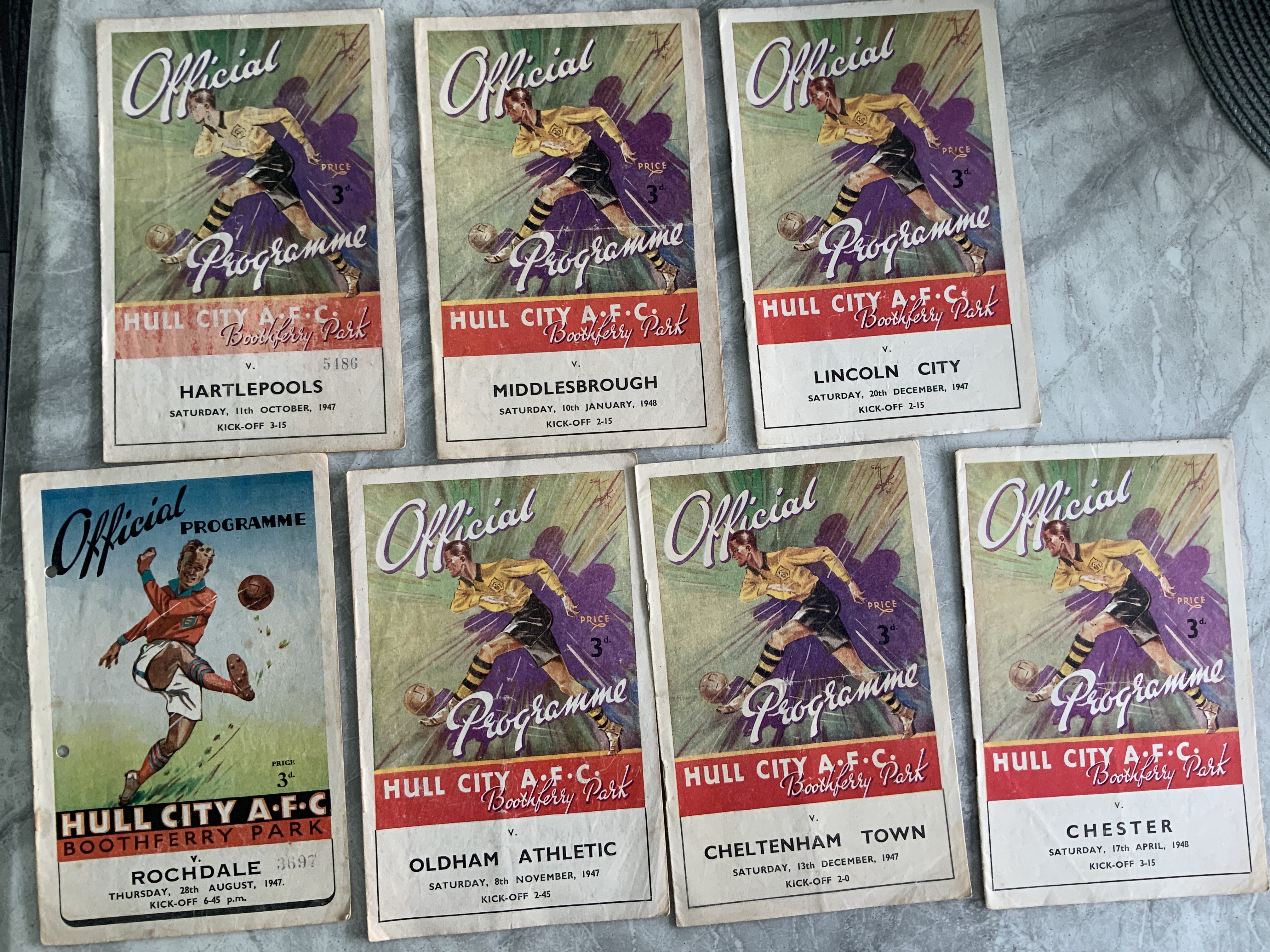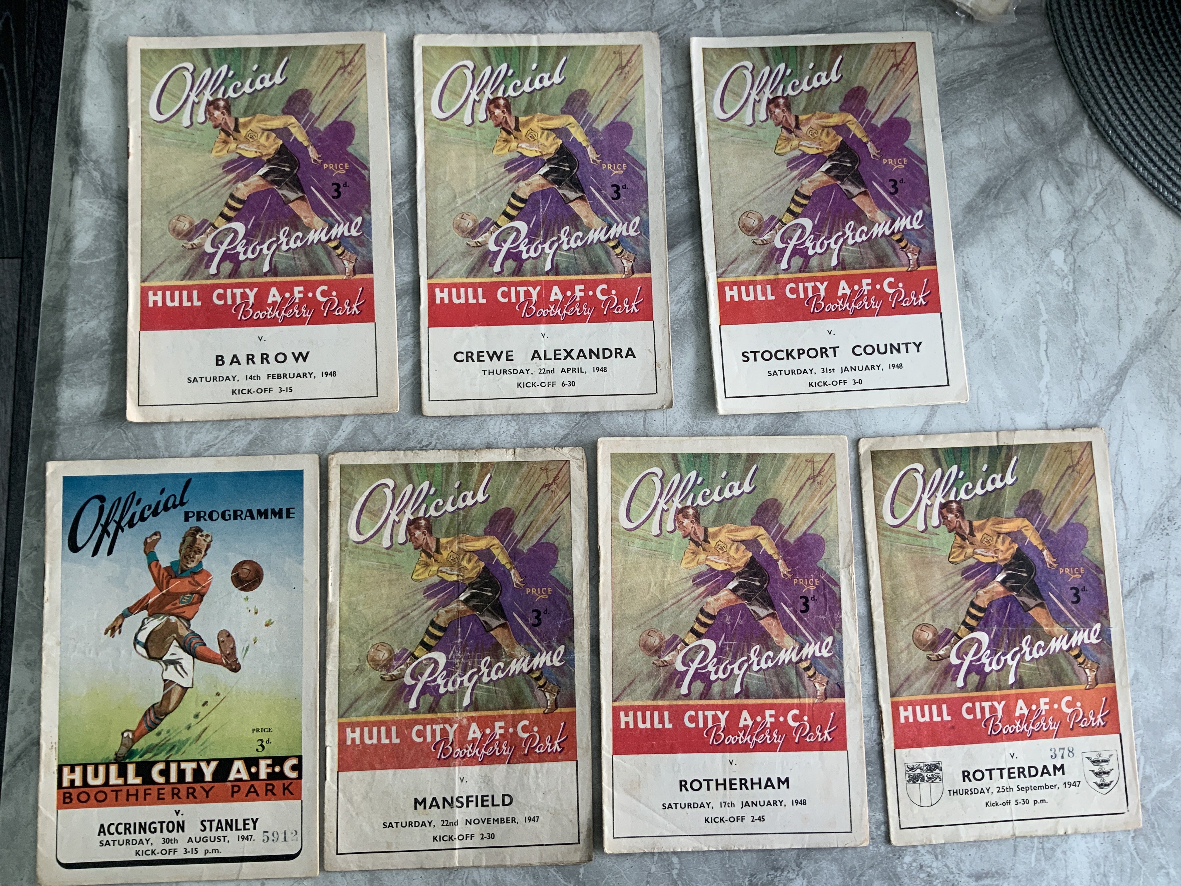 47/48 Hull City Home Football Programmes: Must be near complete to include Rotterdam Rotherham Accrington Stanley Mansfield Stockport Crewe Barrow Chester Rochdale Cheltenham Oldham Lincoln Middlesbrough Darlington Wrexham Southport Gateshead Tranmere York Carlisle and Hartlepool. Mainly good with Rochdale having punch holes. (21)
