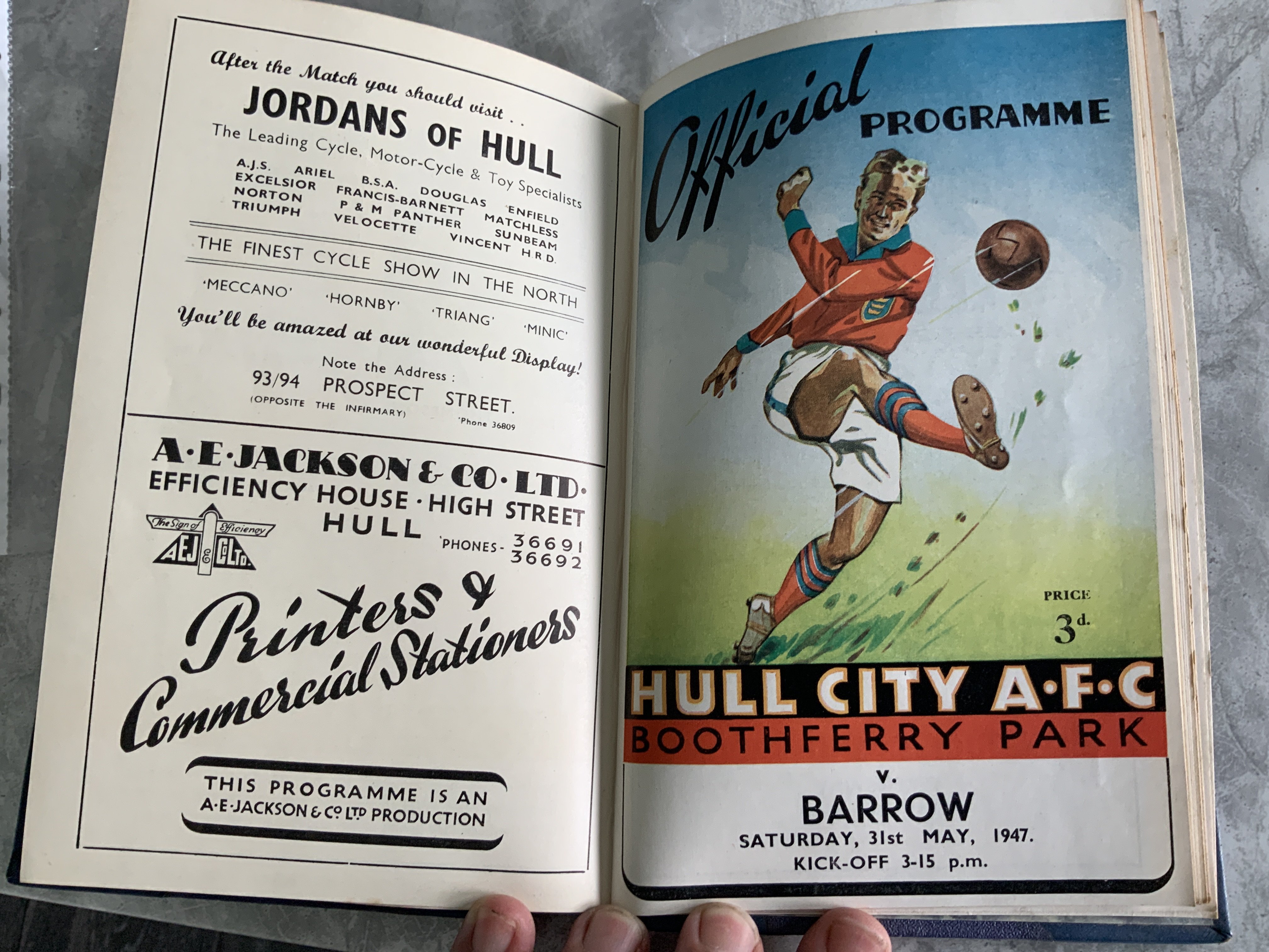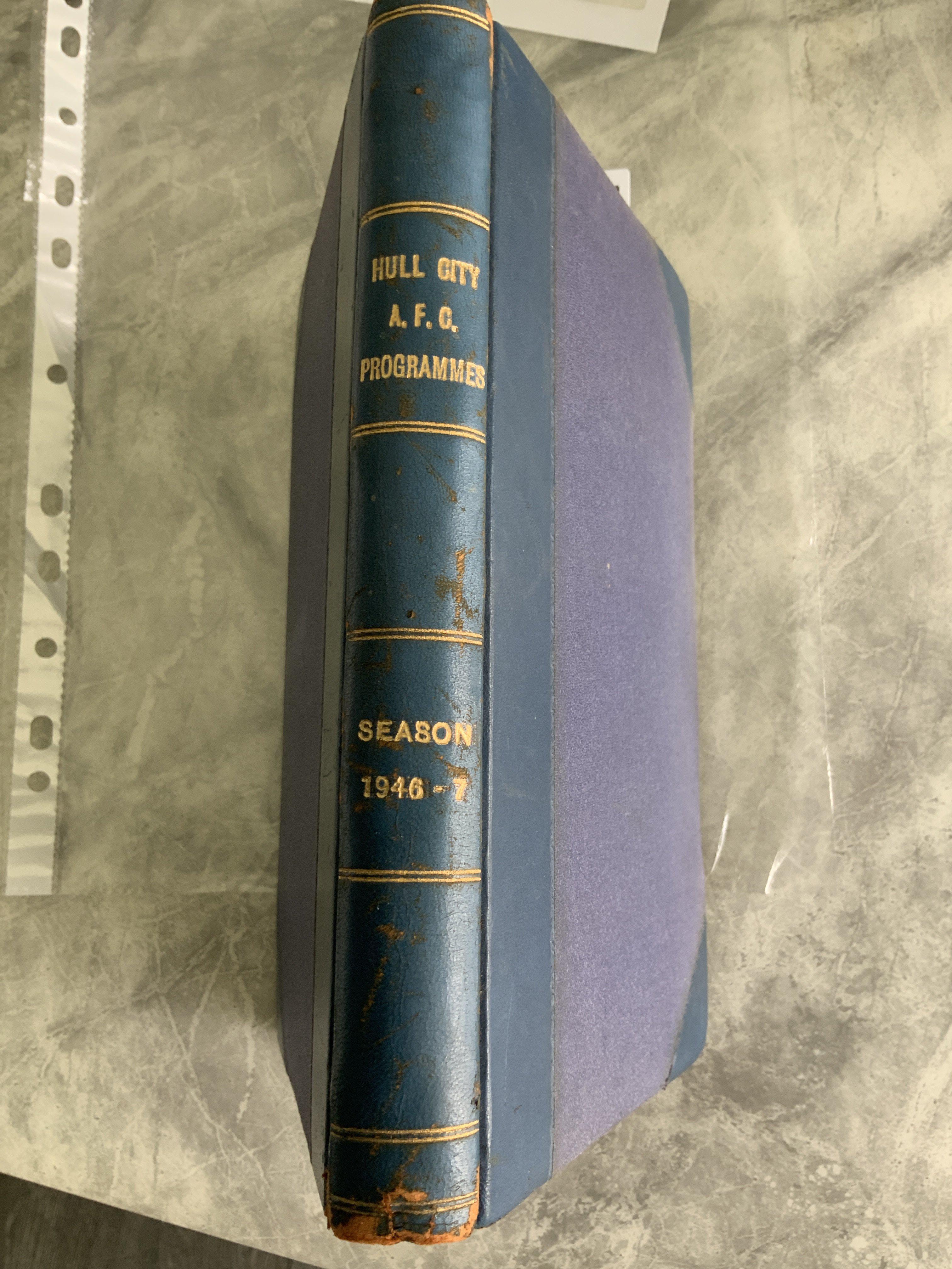 46/47 Hull City Bound Volume Of Football Programmes: Includes first match after the war in the League v Lincoln, Hull City Boys v Leicester Boys, Fulham friendly, Blackburn FA Cup, Bolton Disaster Fund. Complete in stunning unwritten condition with covers. Blue boards state Hull City AFC Programmes Season 1946-7 to spine.