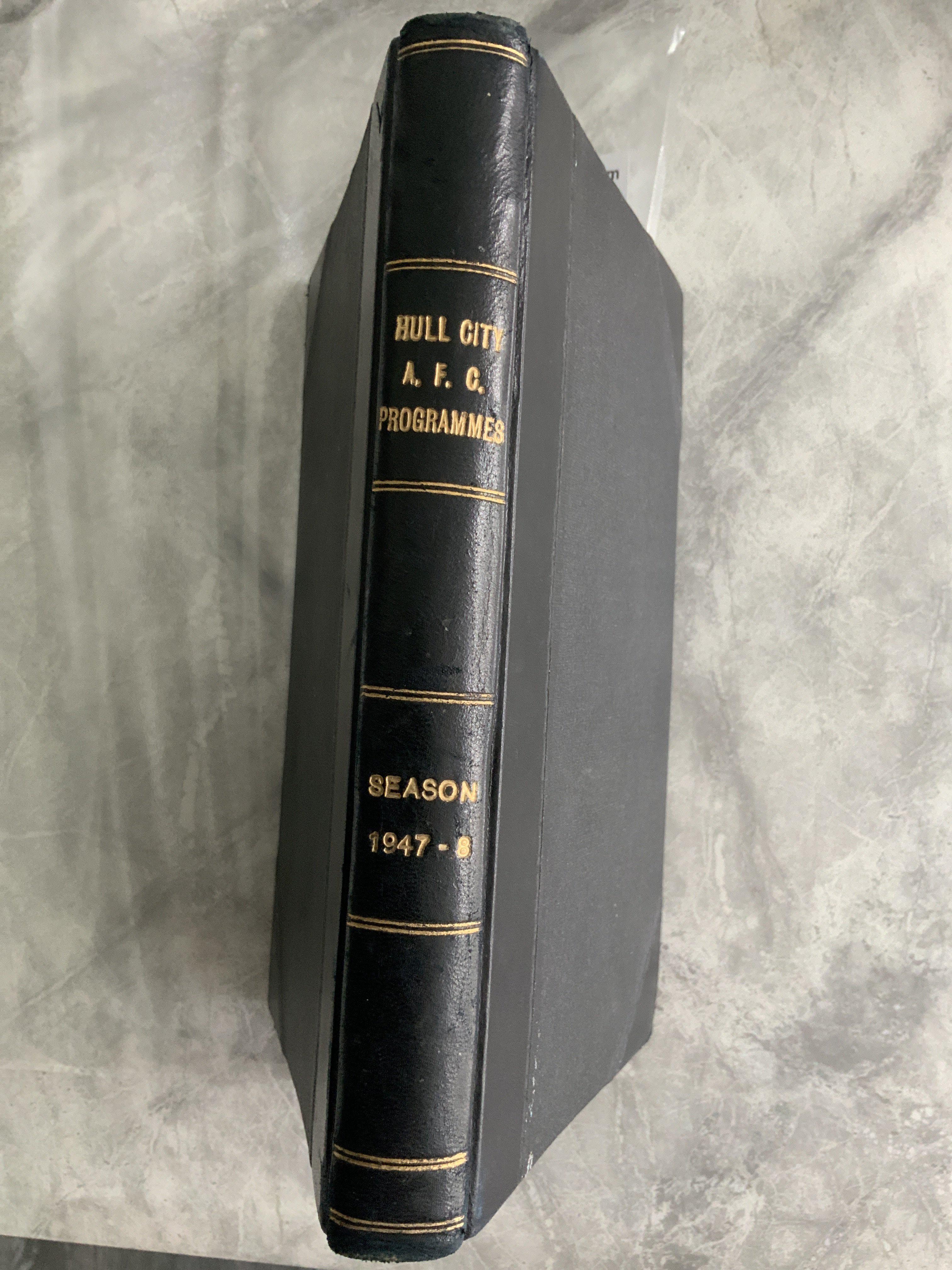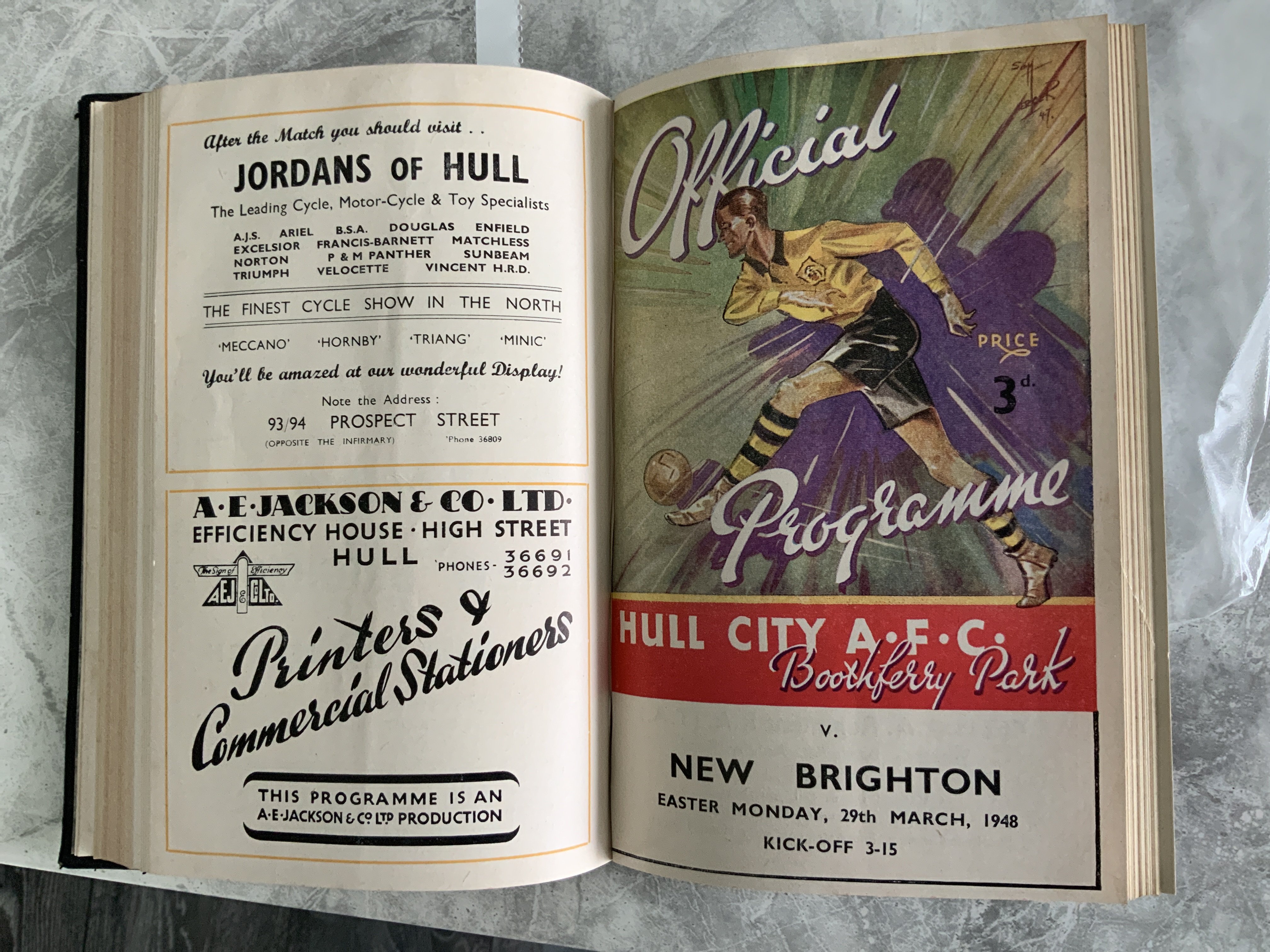 47/48 Hull City Bound Volume Of Football Programmes: Includes Rotterdam, Cheltenham FA Cup with league matches complete and in stunning unwritten condition with covers. Blue boards state Hull City AFC Programmes Season 1947-8 to spine.