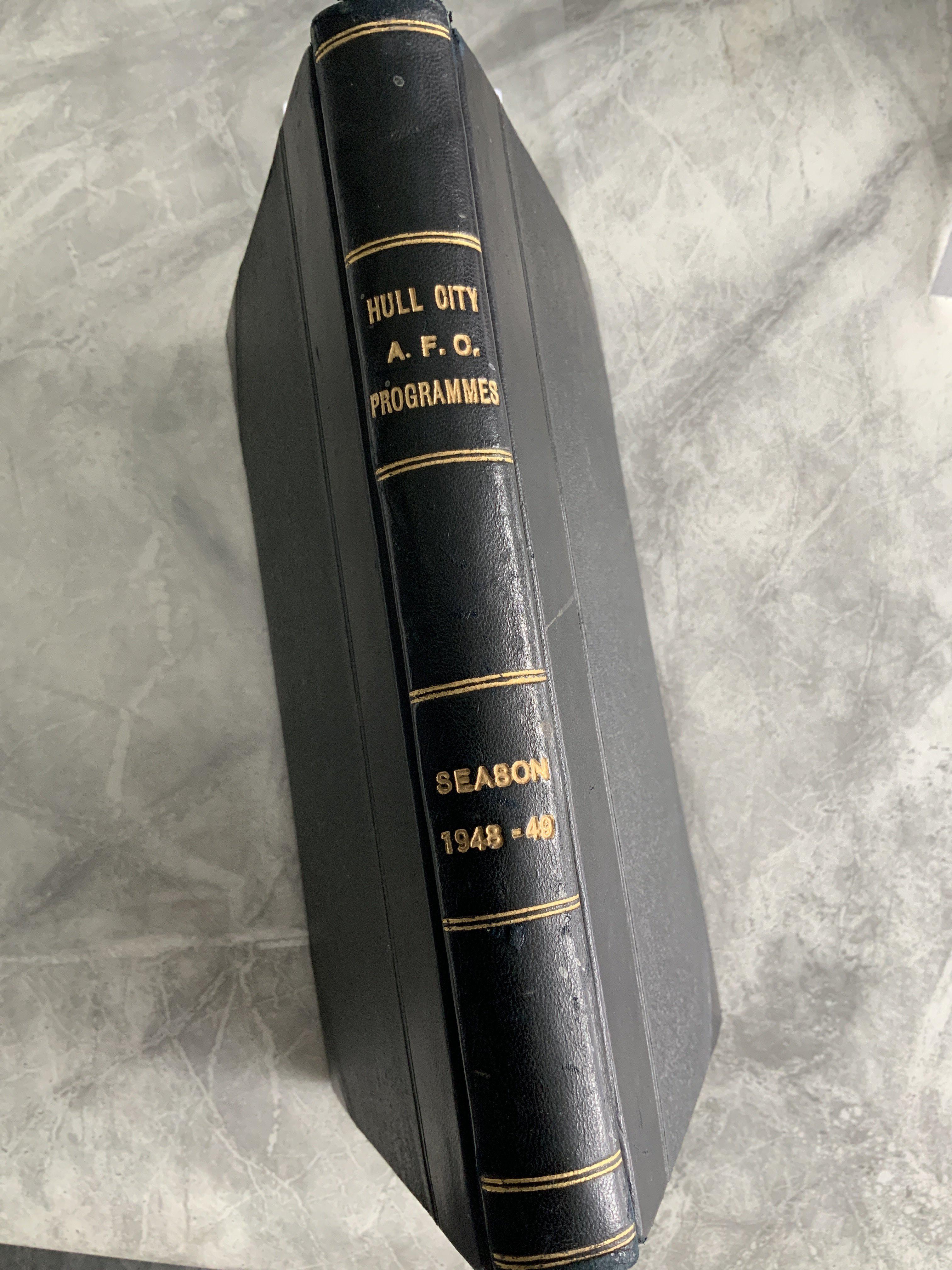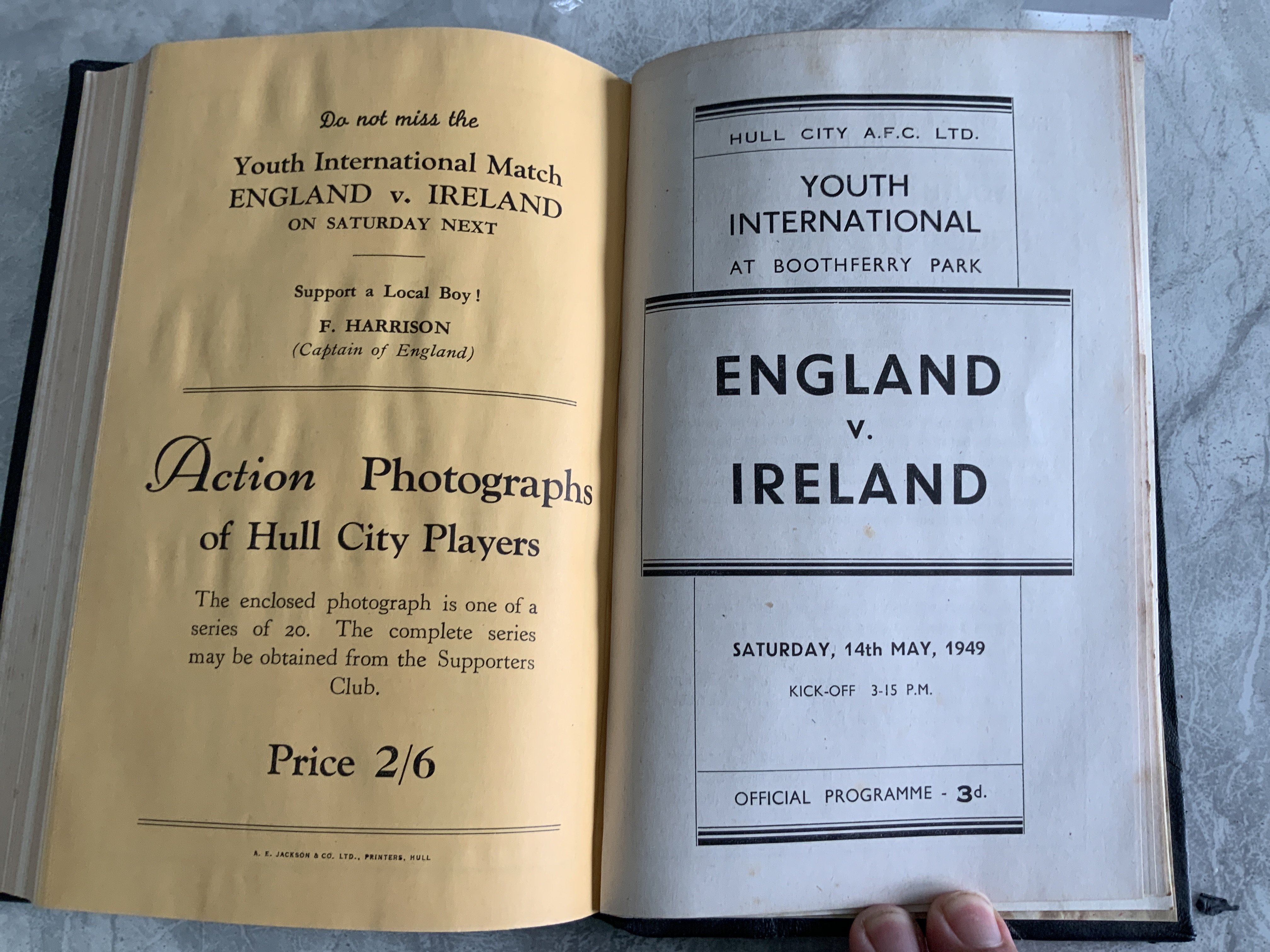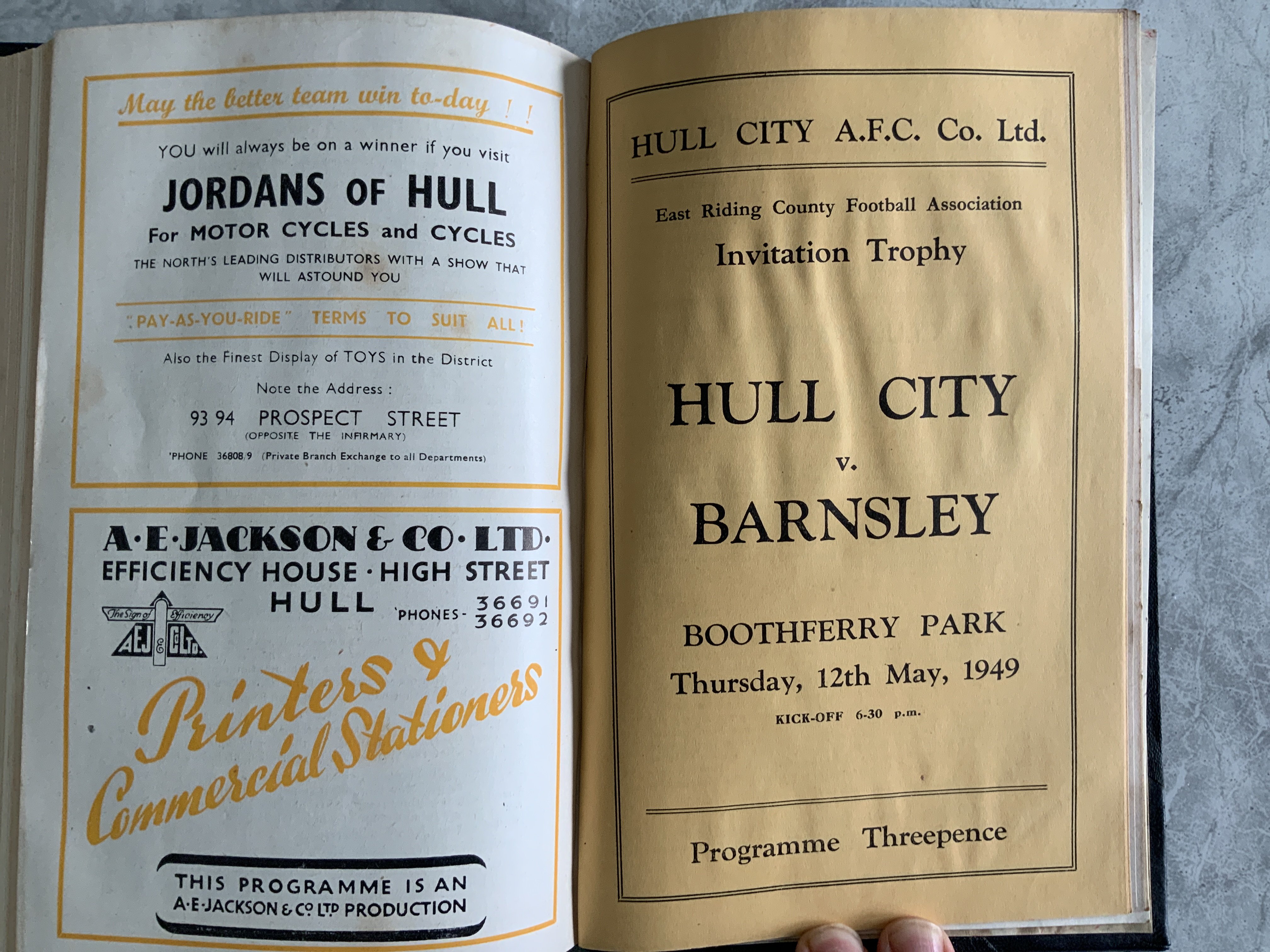 48/49 Hull City Bound Volume Of Football Programmes: Includes Barnsley East Riding Trophy, Reading FA Cup, Yorkshire Boys v Lancashire Boys, England Youth v Ireland with league matches complete and in stunning unwritten condition with covers. Blue boards state Hull City AFC Programmes Season 1948-49 to spine.