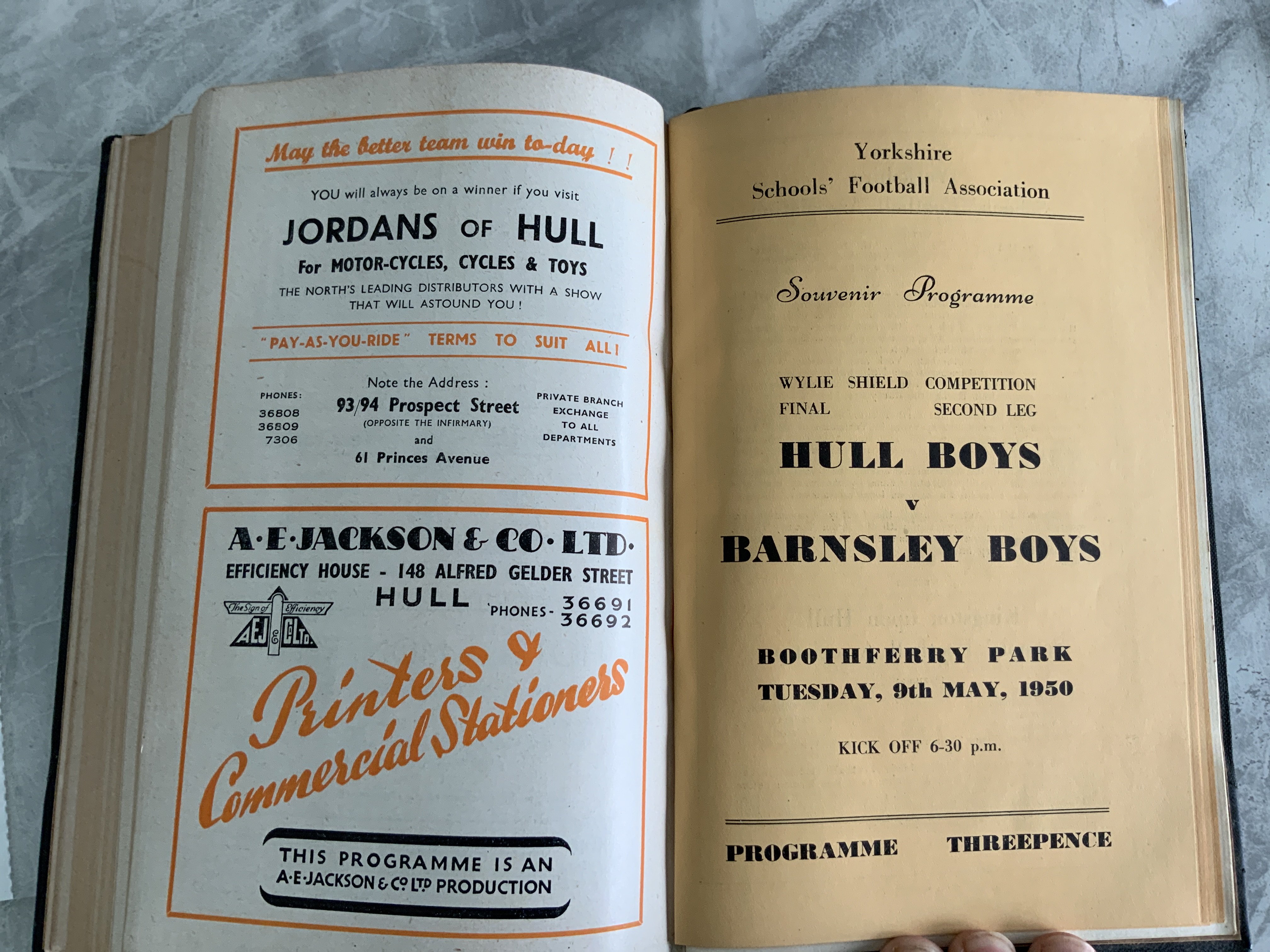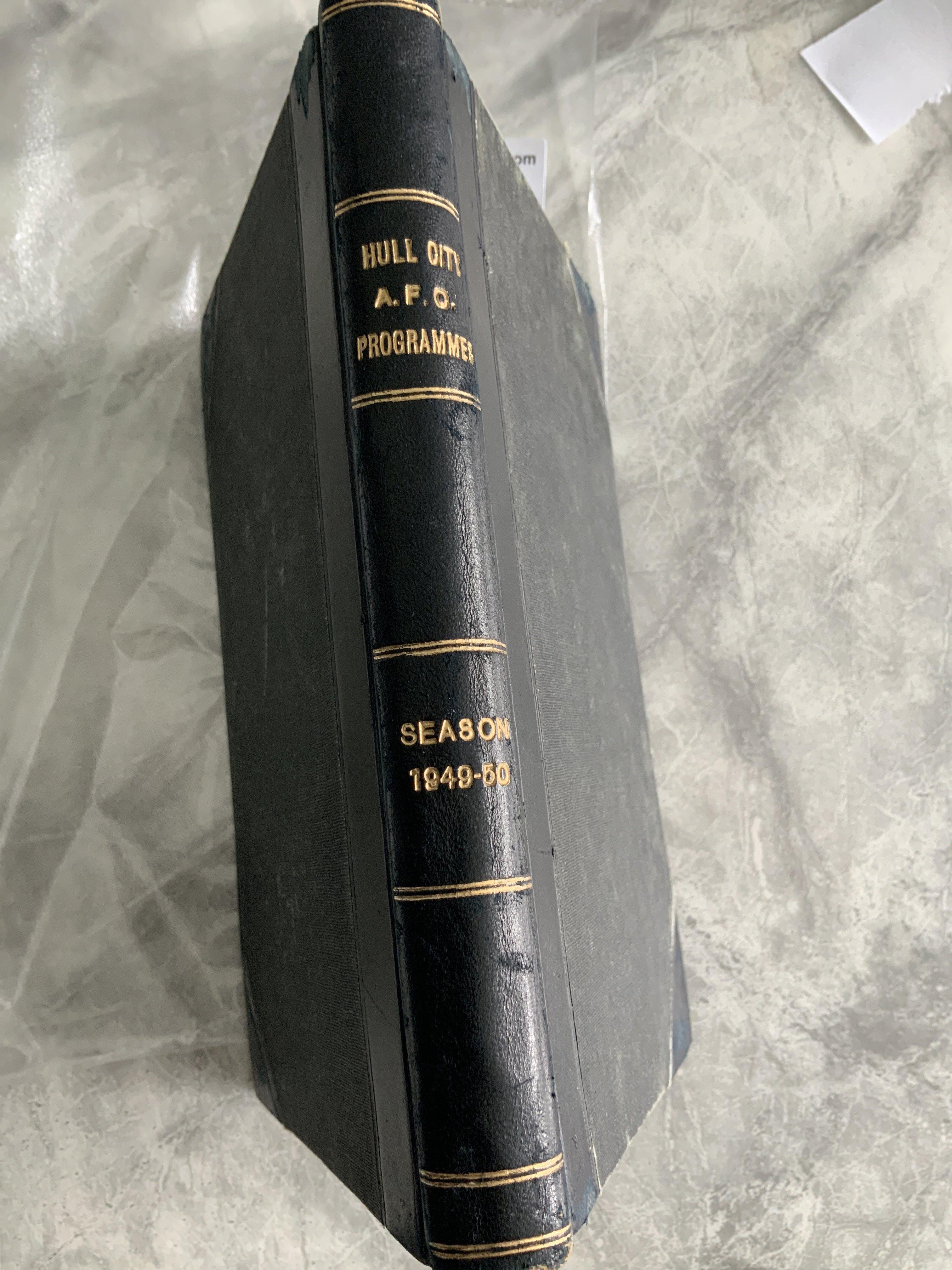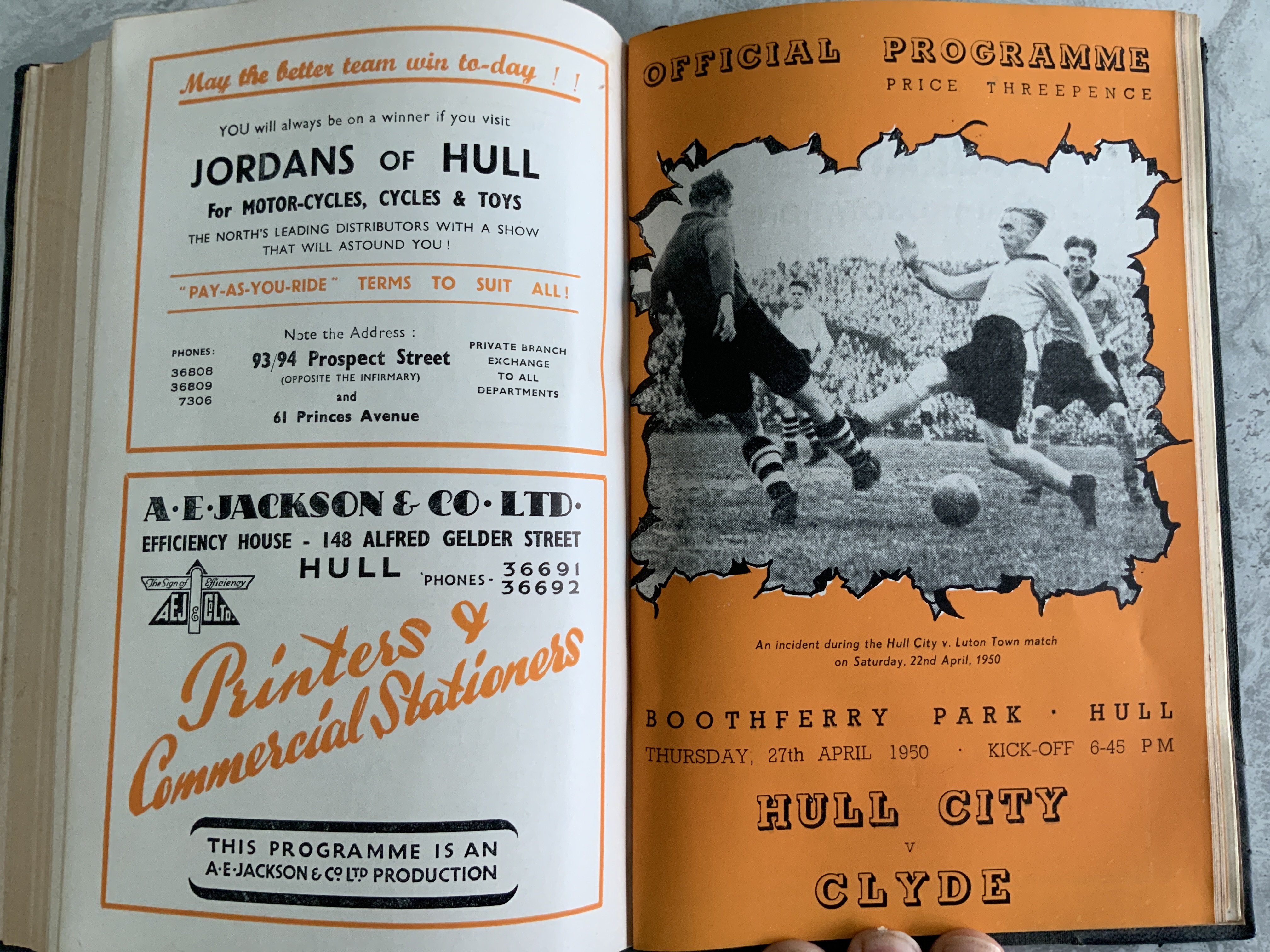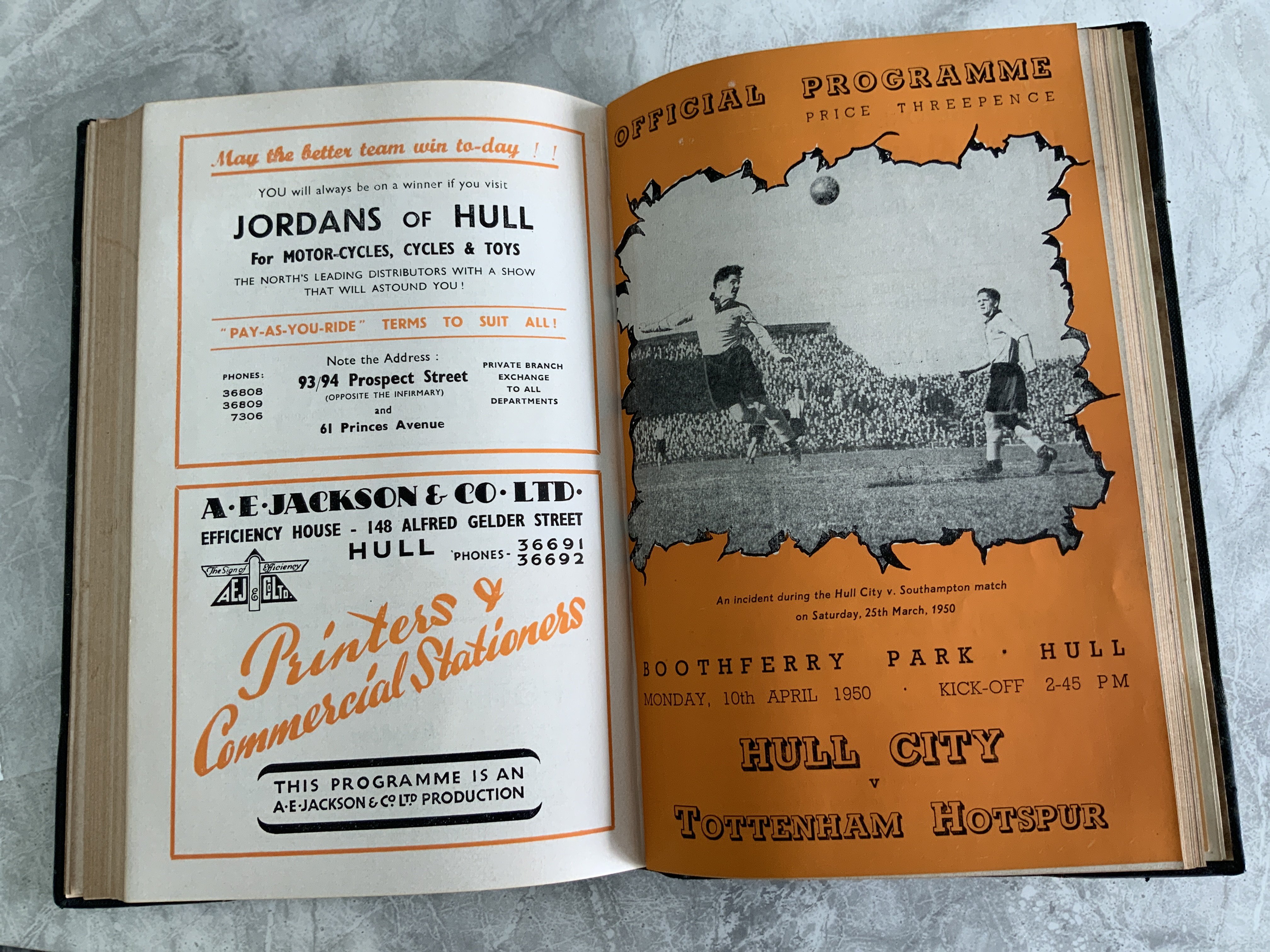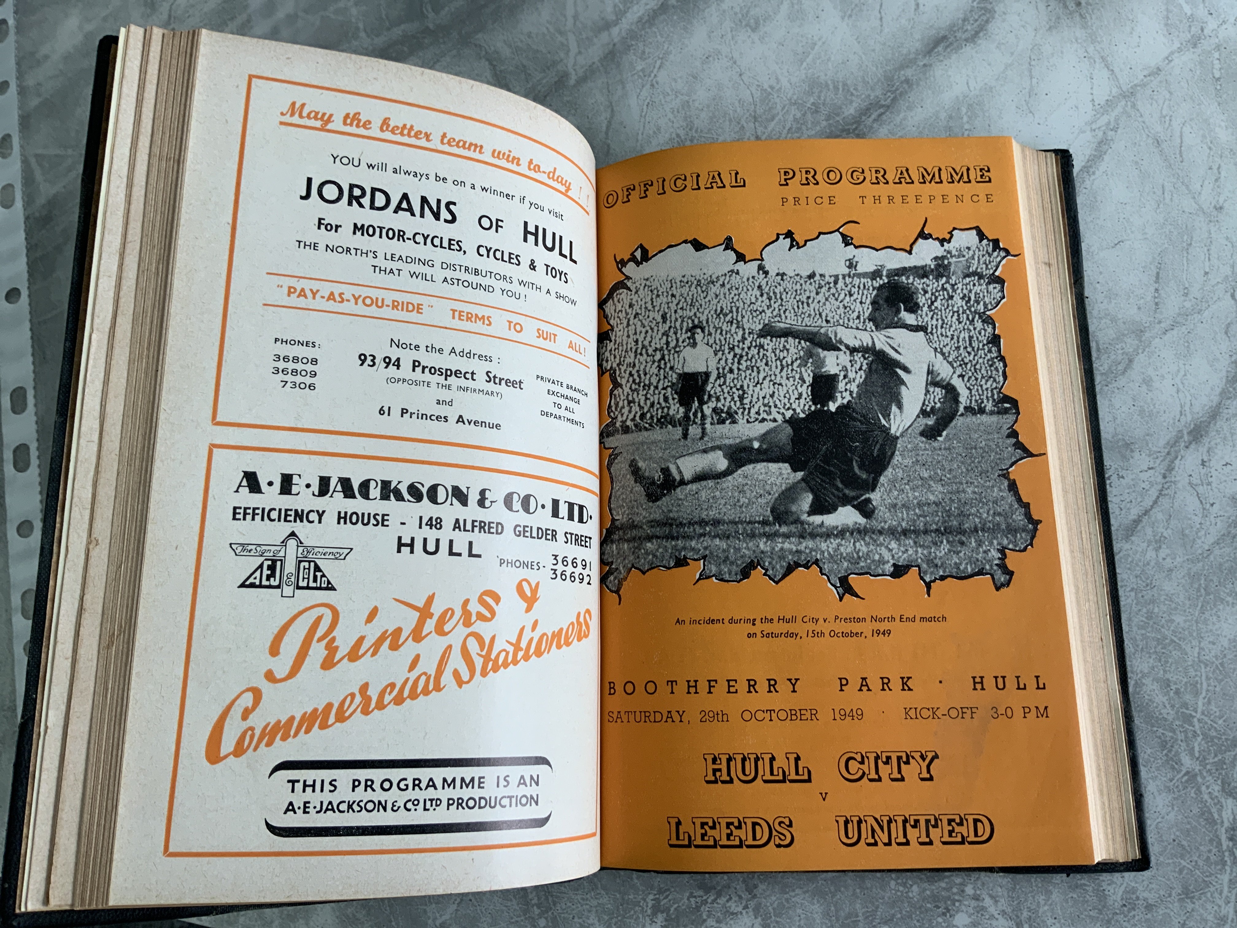 49/50 Hull City Bound Volume Of Football Programmes: Includes England v Scotland Amateurs, Clyde friendly, Hull City Boys v Barnsley Boys Final with league matches complete and in stunning unwritten condition with covers. Blue boards state Hull City AFC Programmes Season 1949-50 to spine.