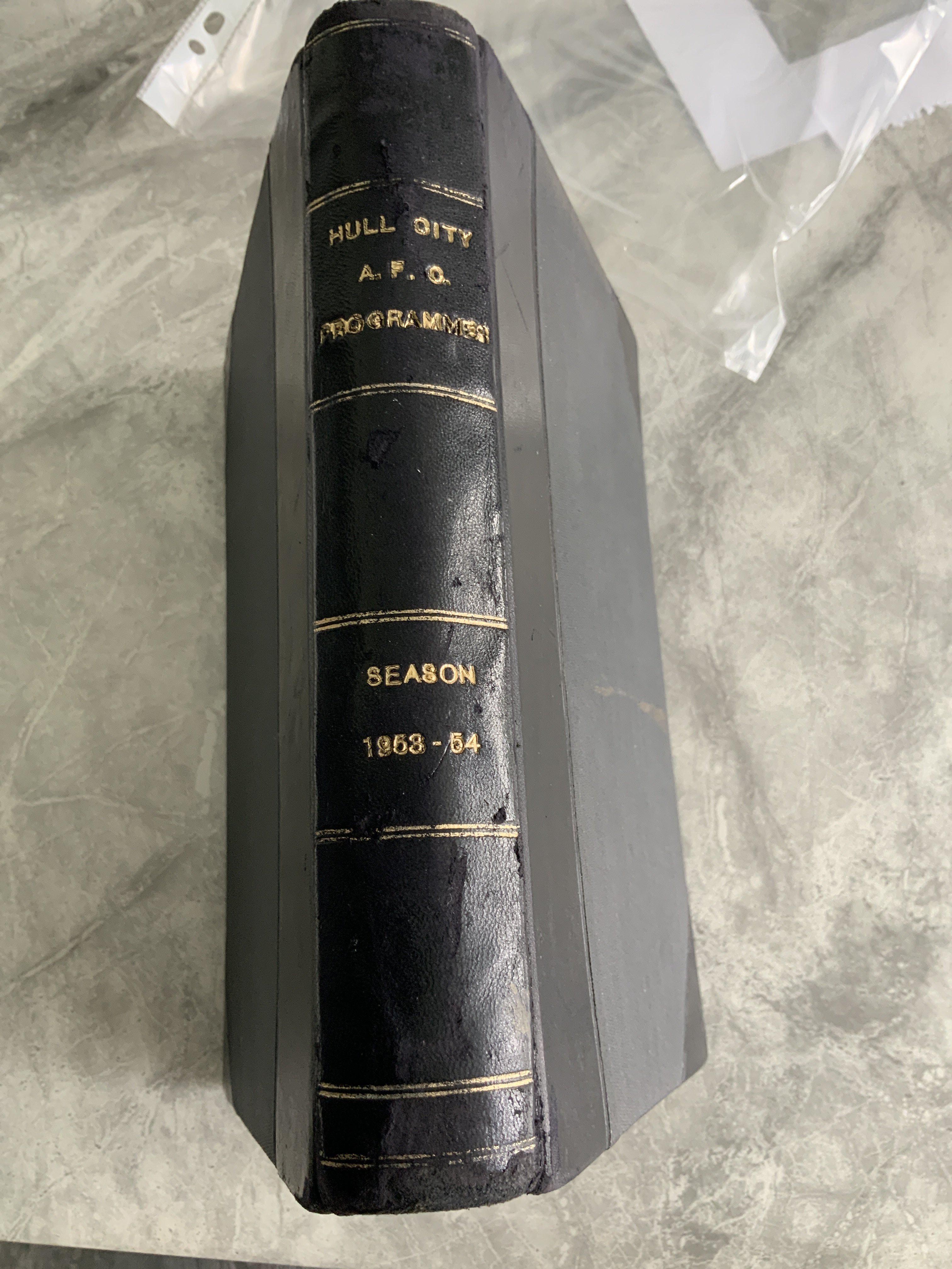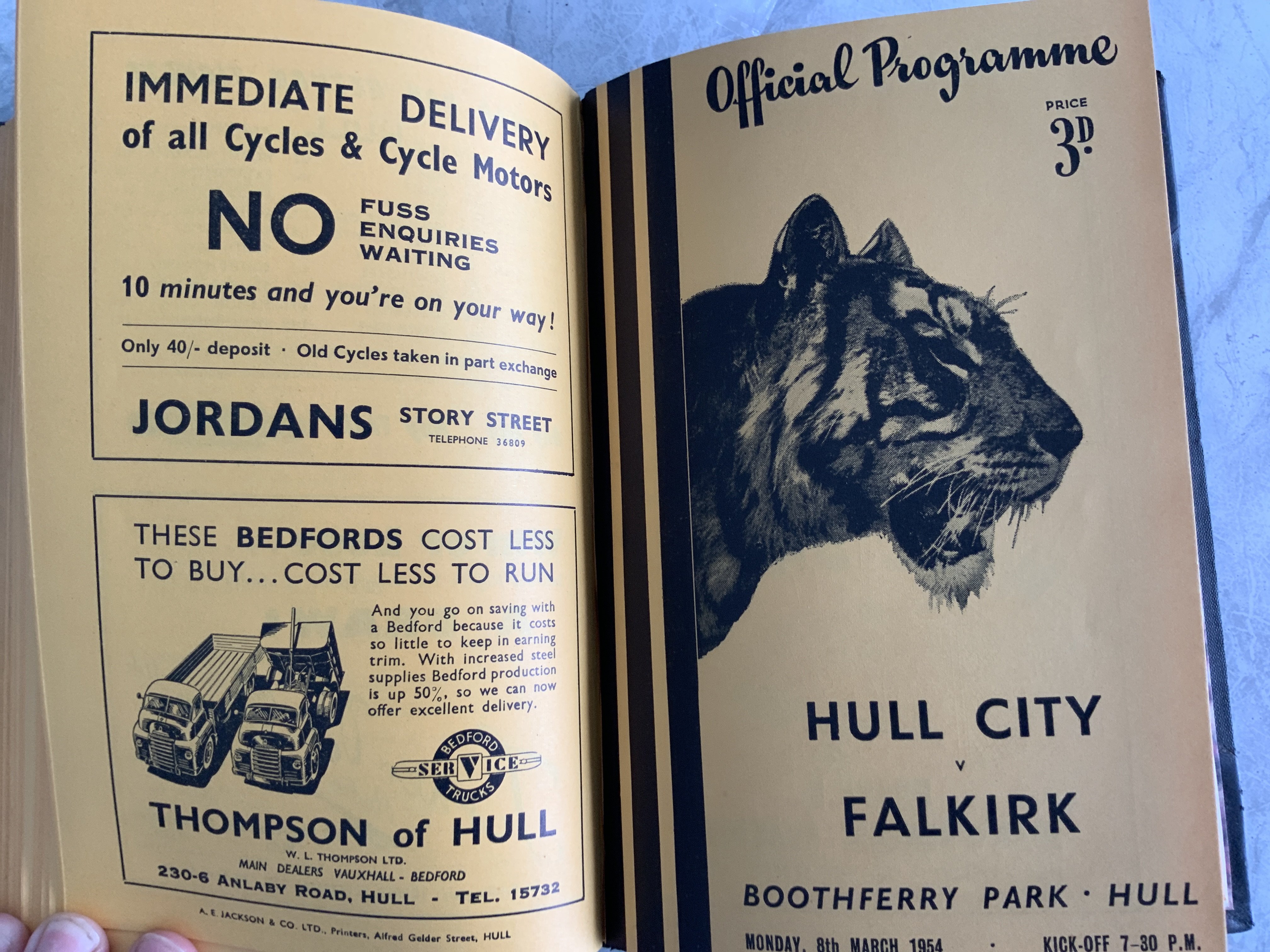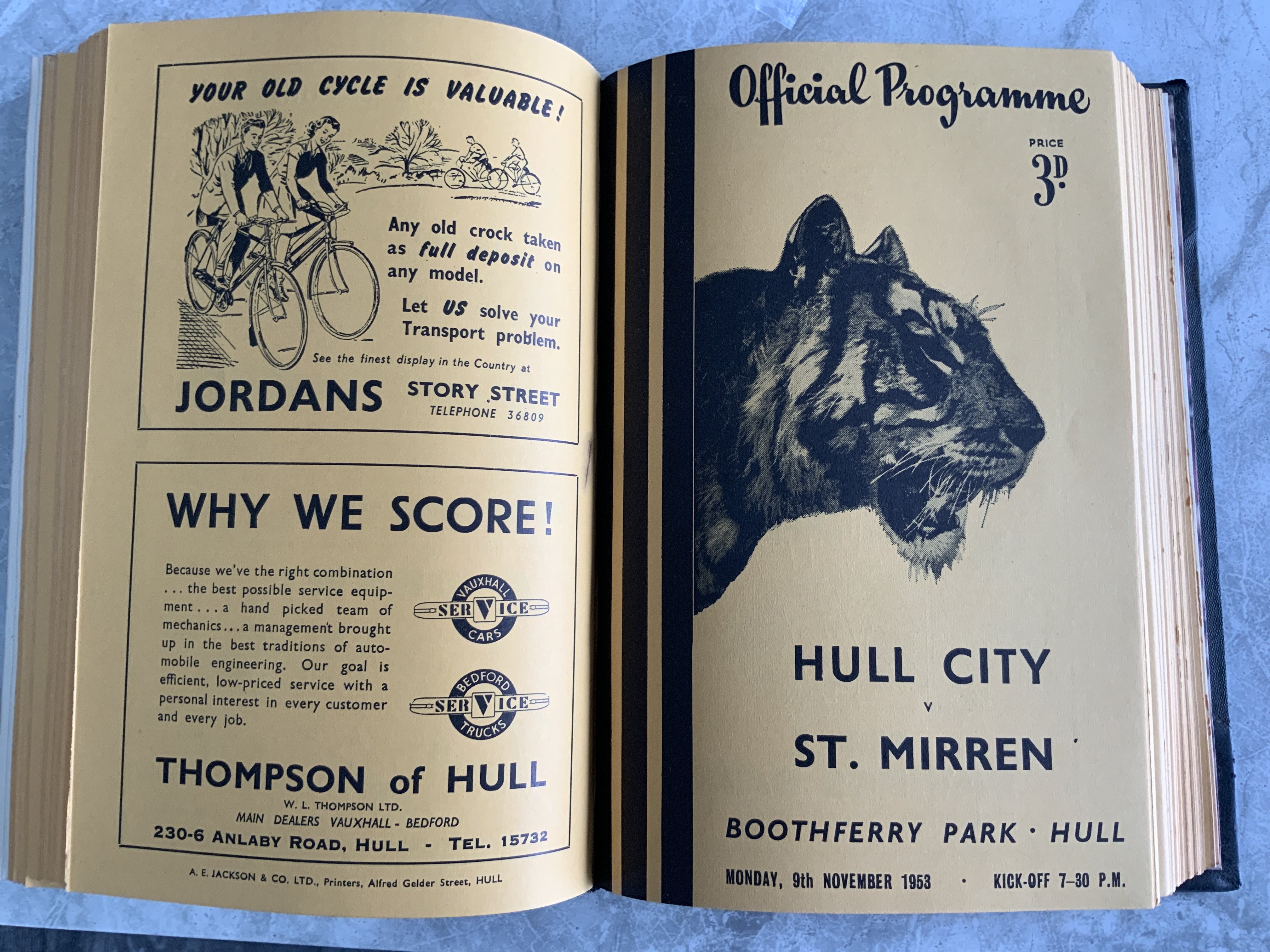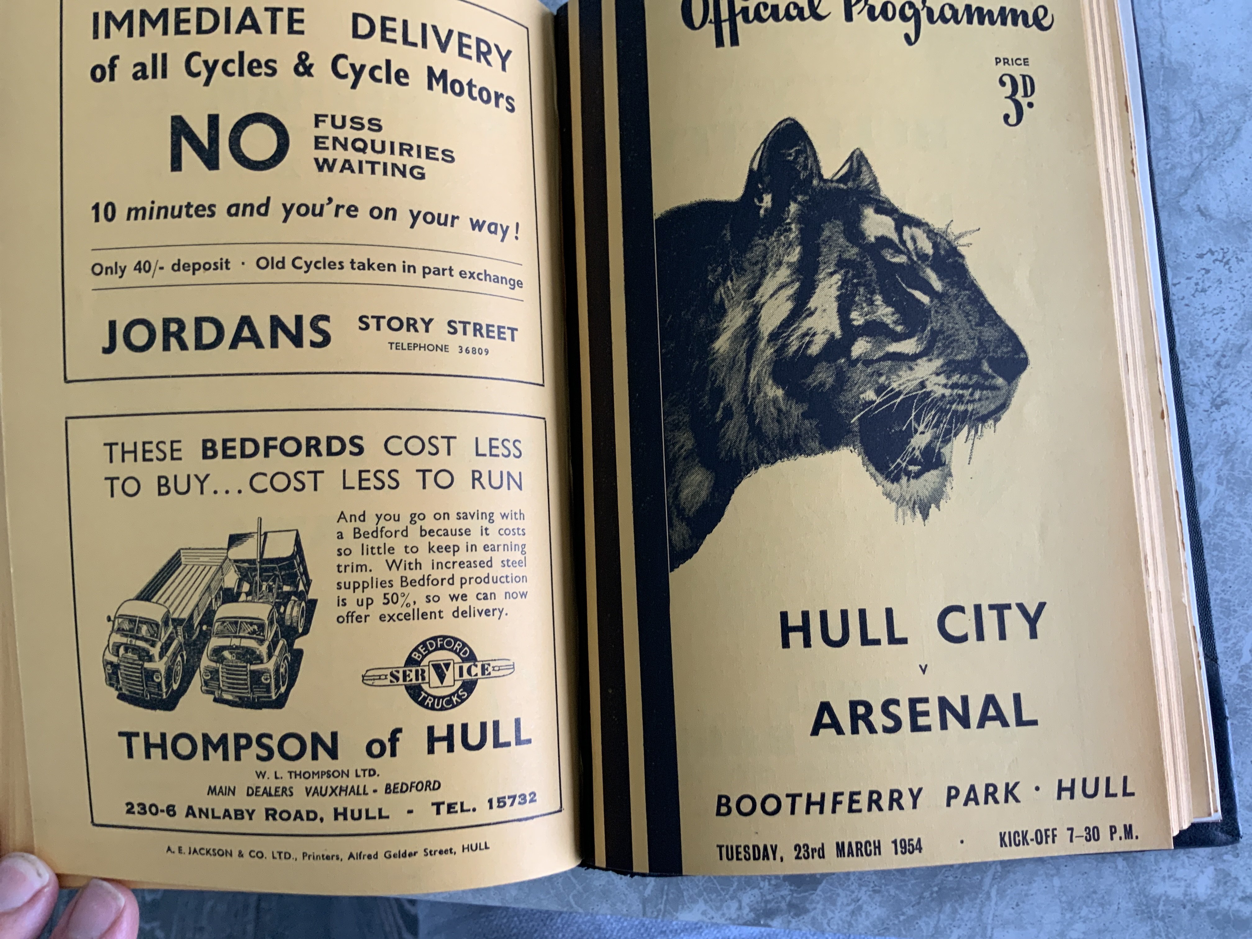 53/54 Hull City Bound Volume Of Football Programmes: Includes Arsenal, Grimsby East Riding Trophy, Falkirk, St Mirren, Admira Wien, FA Cup v Brentford, Tottenham + Blackburn. League matches complete and in stunning unwritten condition with covers. Blue boards state Hull City AFC Programmes Season 1953-54 to spine.