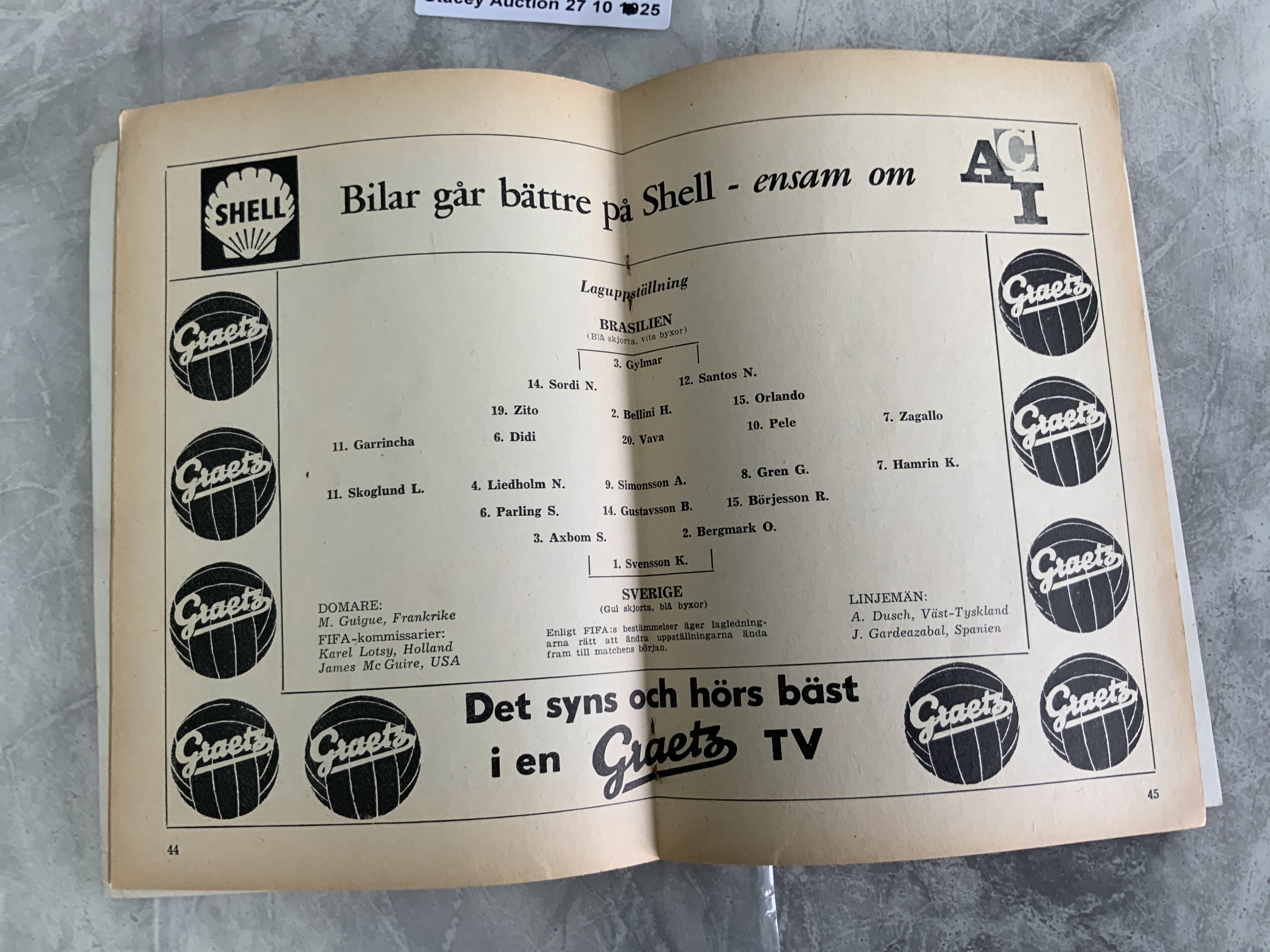 1958 World Cup Final Football Programme: Brazil v Sweden in good condition with staples removed. No team changes. Famous match which broke records for oldest and youngest ( Pele ) goal scorers and amount of goals.