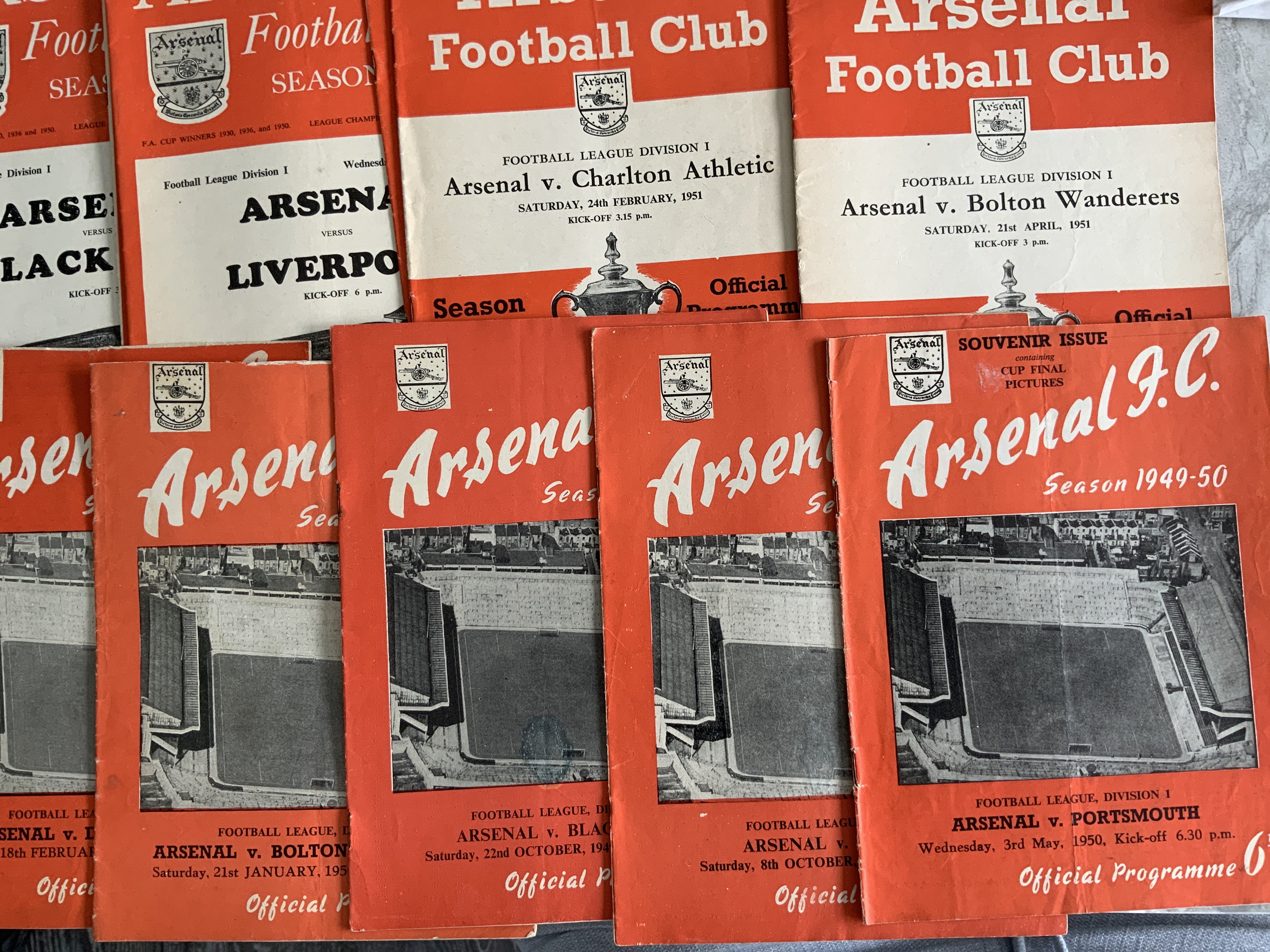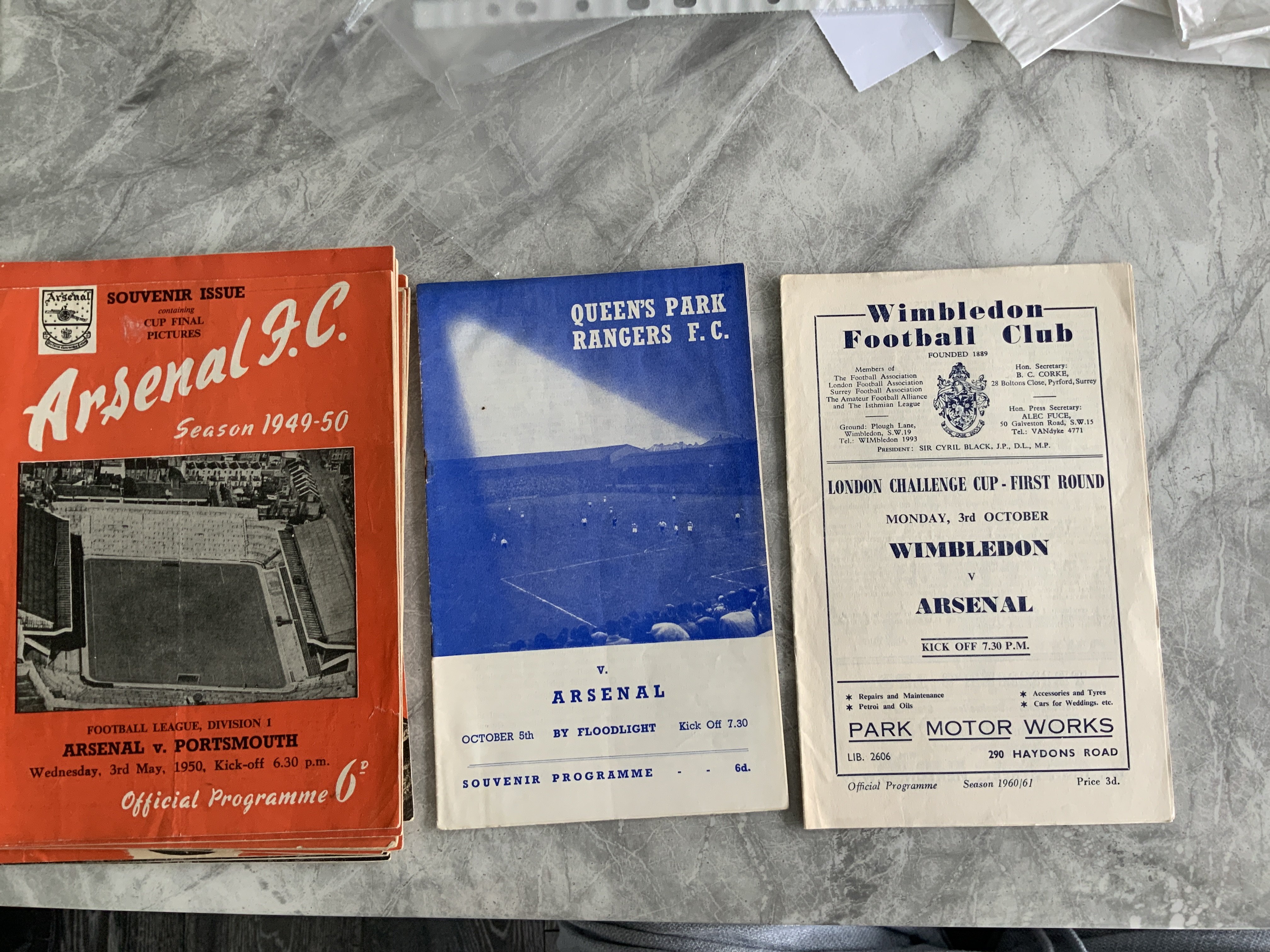Arsenal Home Football Programmes: 35/36 Grimsby staples rusted away, 1953 Blackpool Charity Shield, 48/49 Manchester United league nof and a further 17 from 49/50 to 51/52. C/W aways at 53/54 QPRfriendly and 60/61 Wimbledon LCC. Very good. (22)
