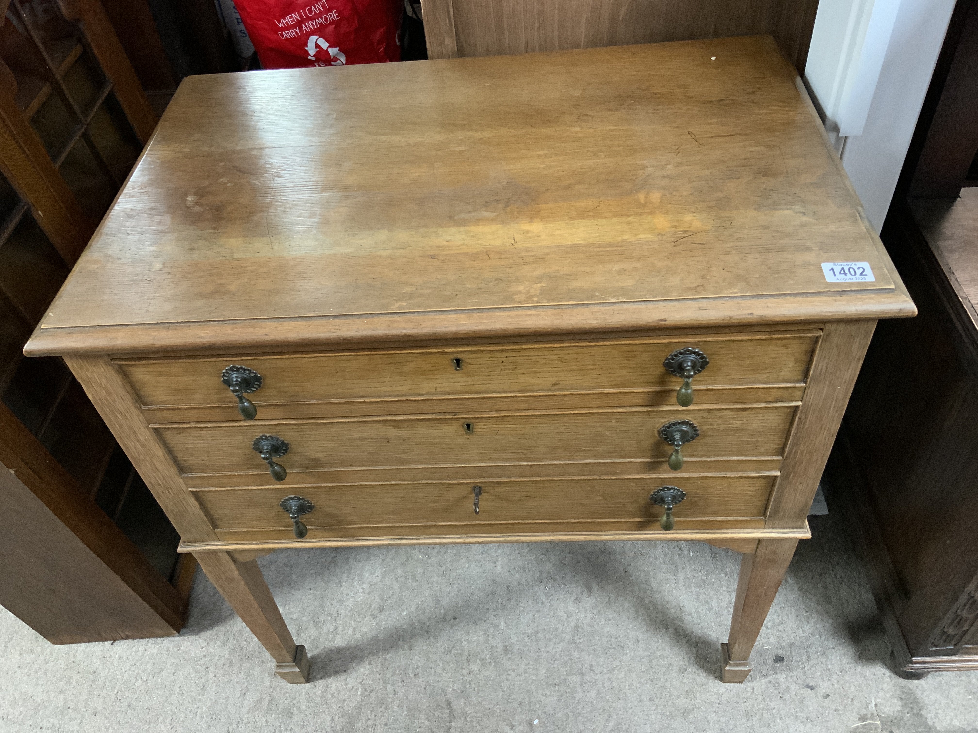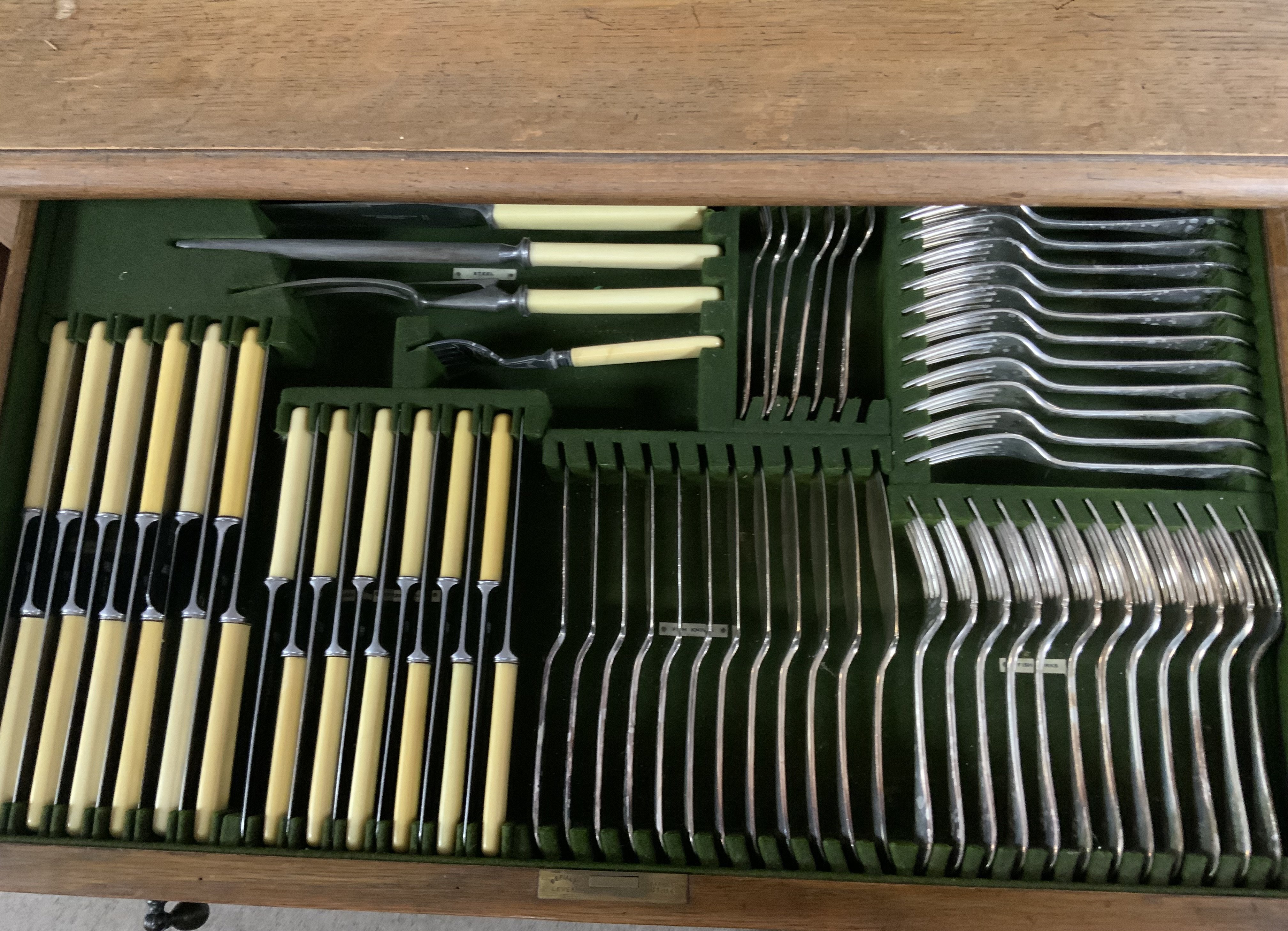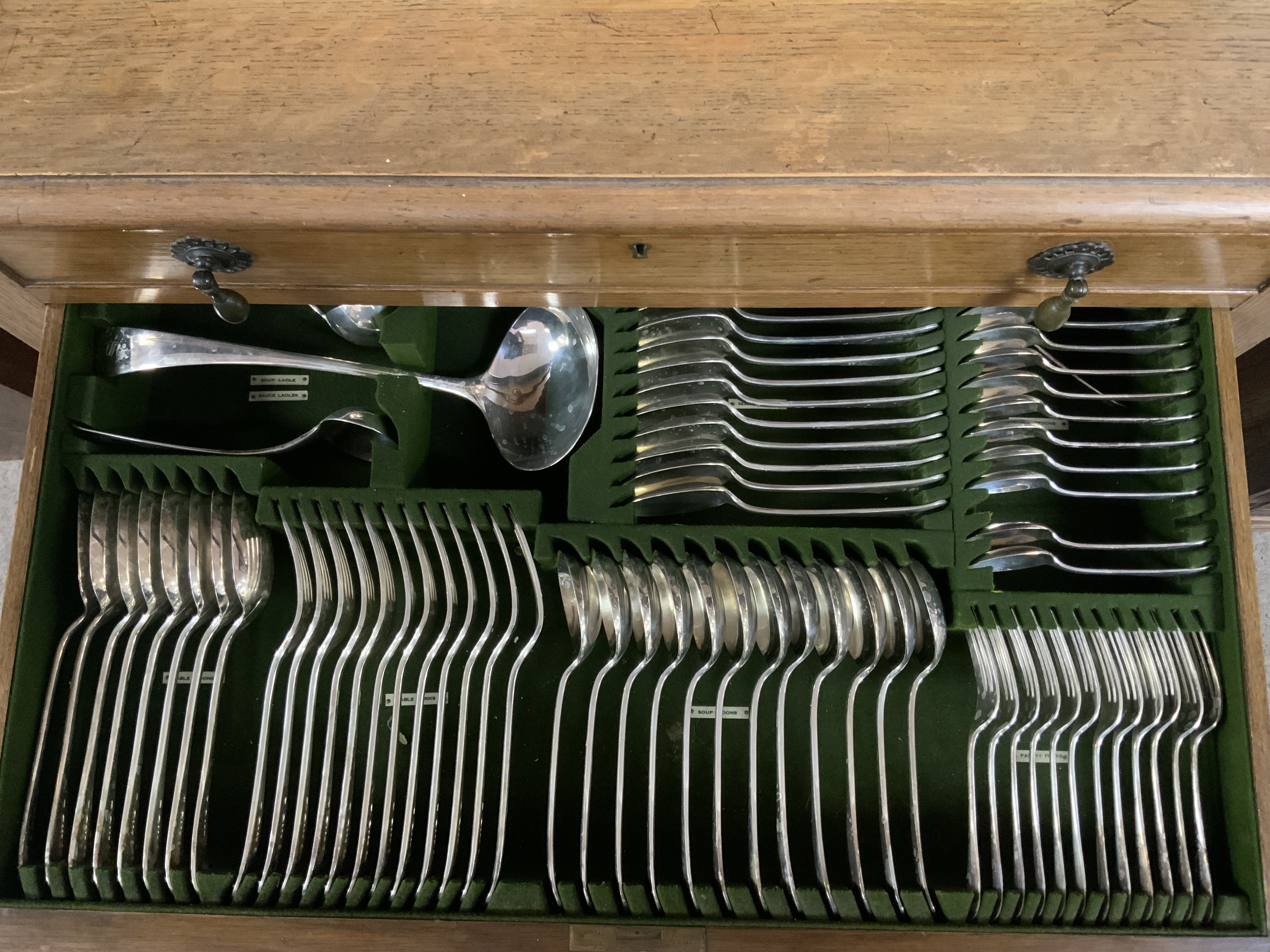 A 3 draw oak canteen, completer with electroplated cutlery. 66cm, x 39.5cm x 80cm (No Reserve).