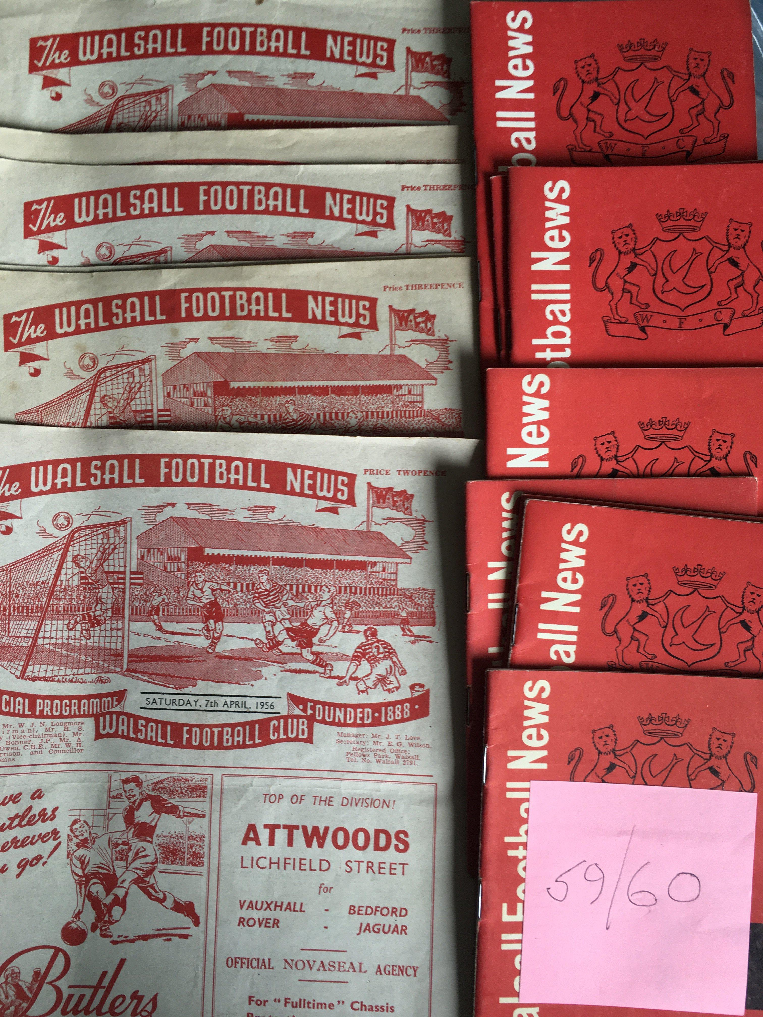 Walsall Home Football Programmes: 18 up to 59/60, 11 x 60/61, 15 x 61/62, 14 x 62/63, 8 x 63/64, 14 x 64/65 and the rest go up to the early 70s. Includes probable complete sets from 65/66 and 68/69. Instructions to sell. Very good. (est 240)