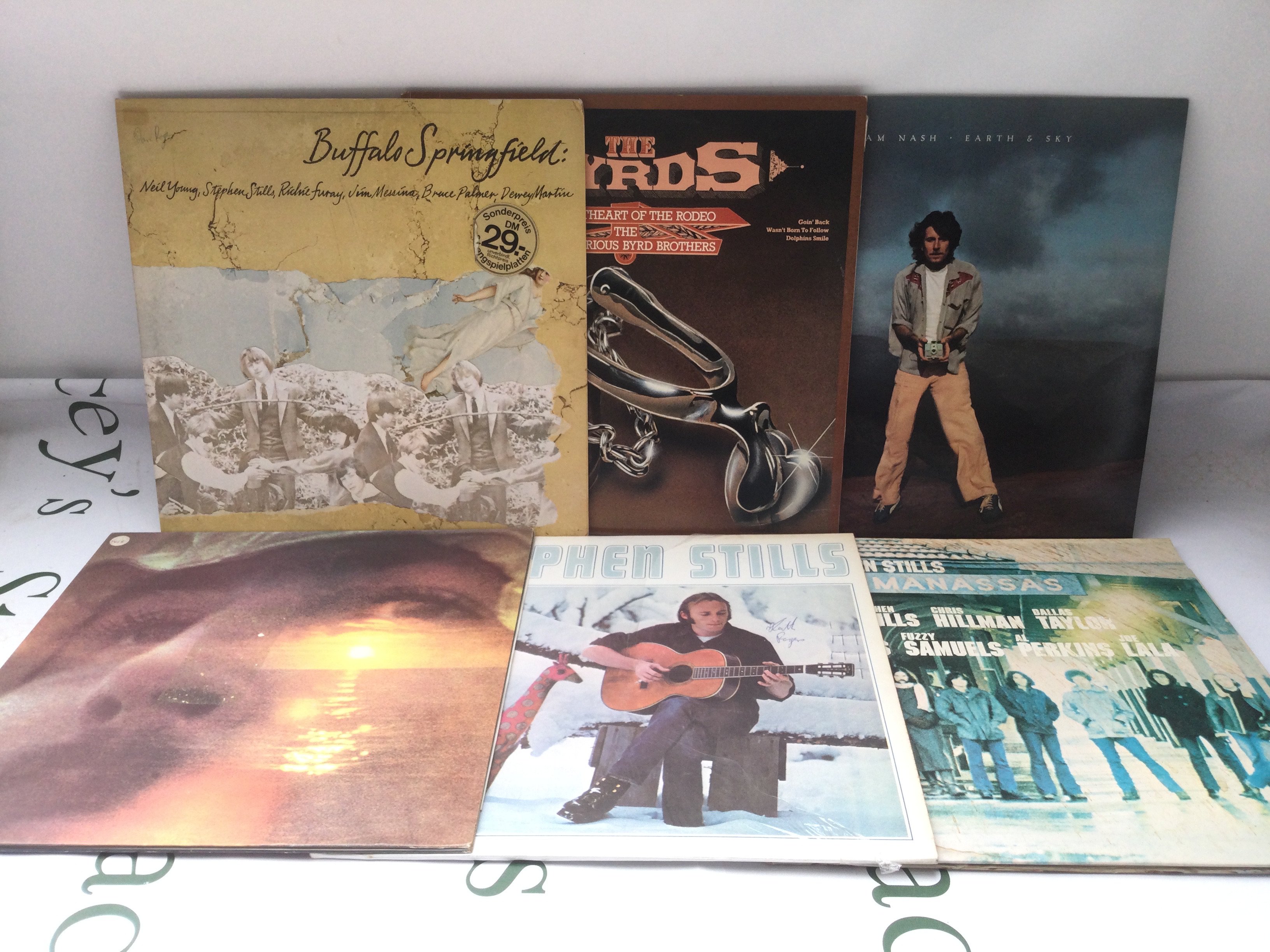 Twelve folk rock LPs by various artists including Buffalo Springfield, Stephen Stills, Joni Mitchell and others. Includes a Byrds promo disc.