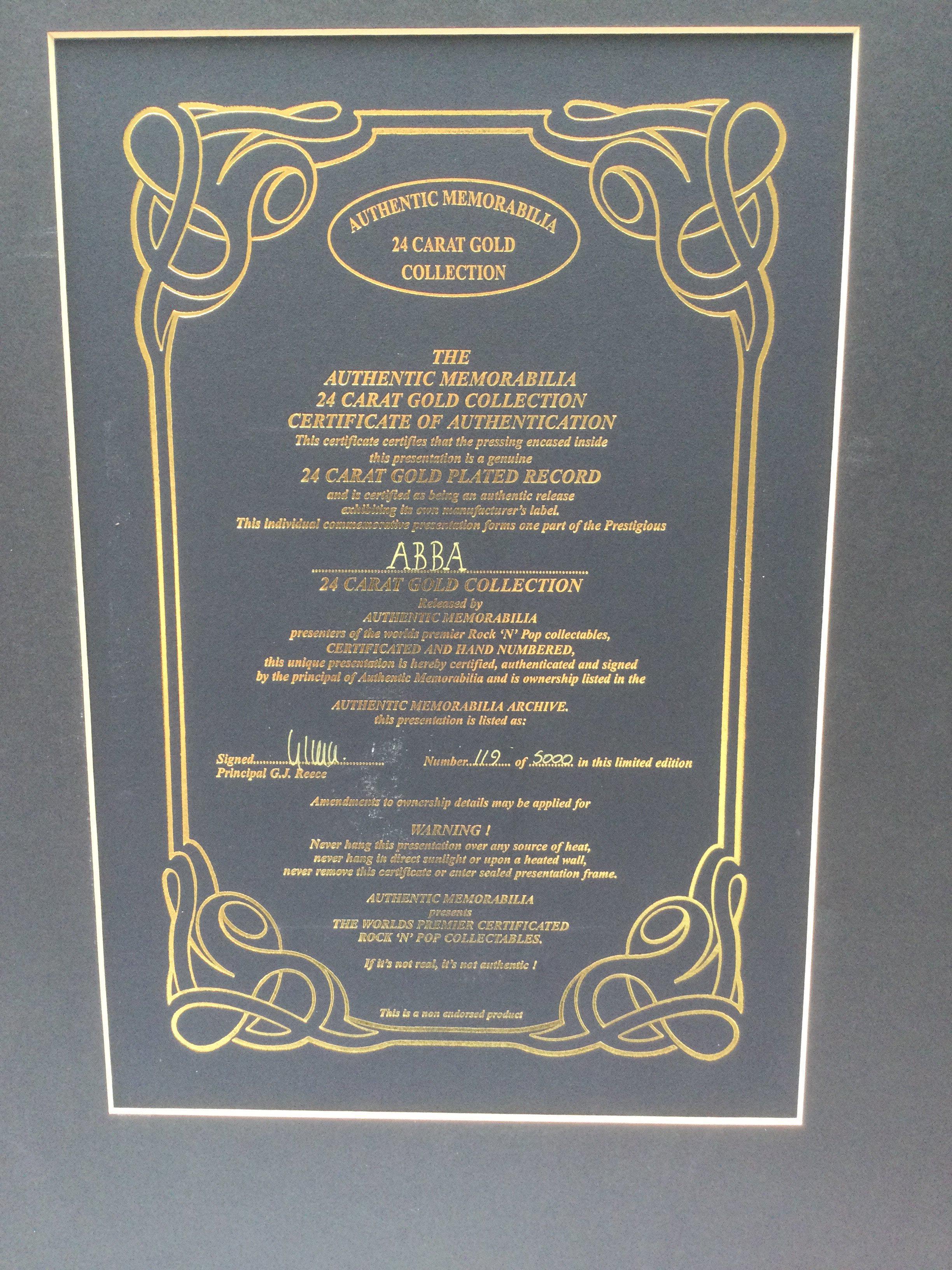 A framed and glazed limited edition gold disc of the self titled Abba LP, numbered 119/5000, with COA to reverse.