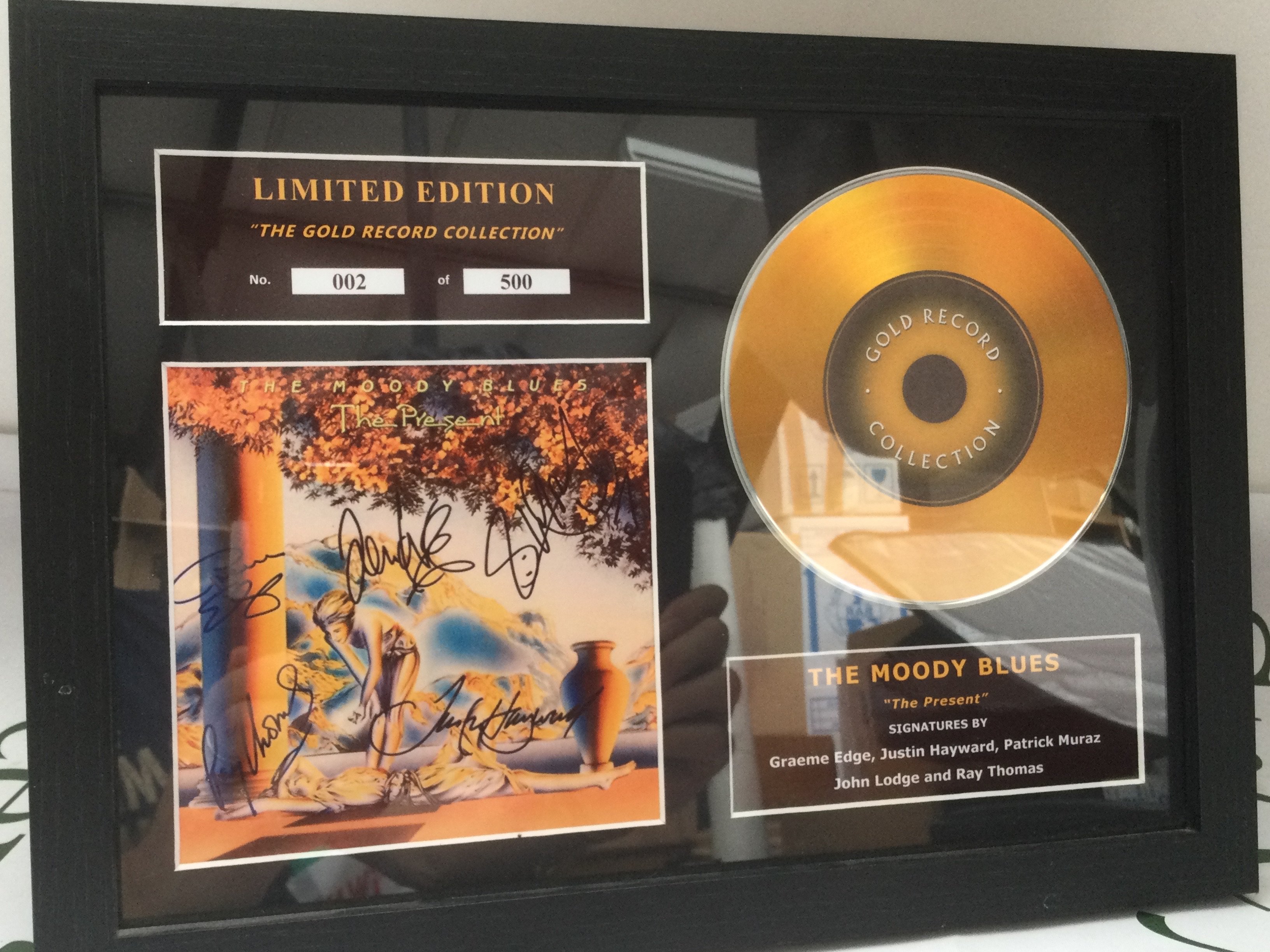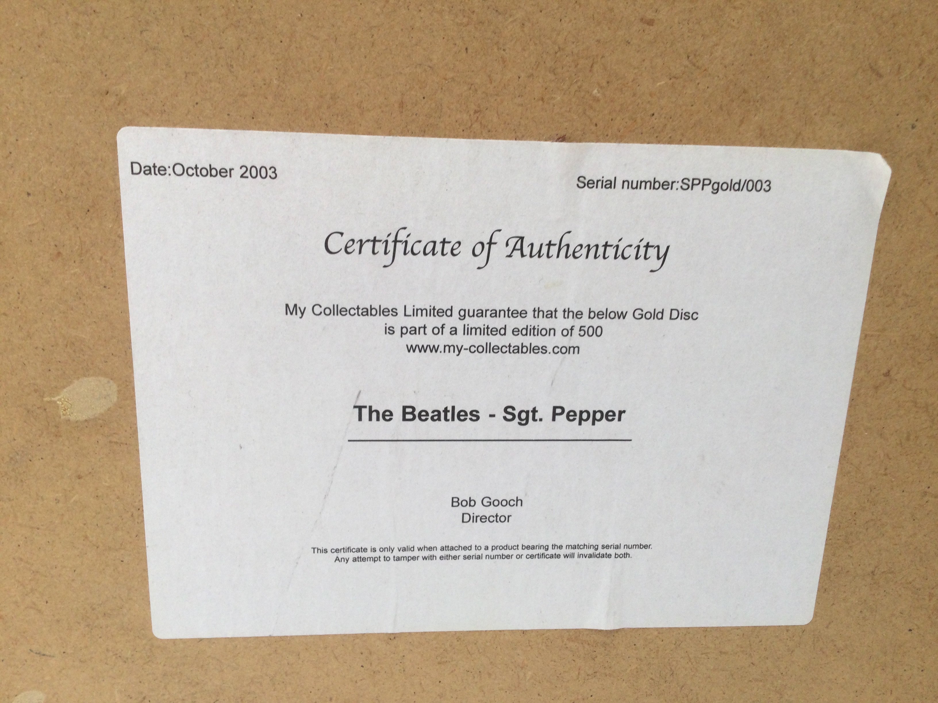 A framed and glazed limited edition double gold disc and photomosaic display for The Beatles' Sergeant Pepper's Lonely Hearts Club Band album. Numbered 003/500. Comes with a framed and glazed Moody Blues CD display with facsimiling signatures (2).