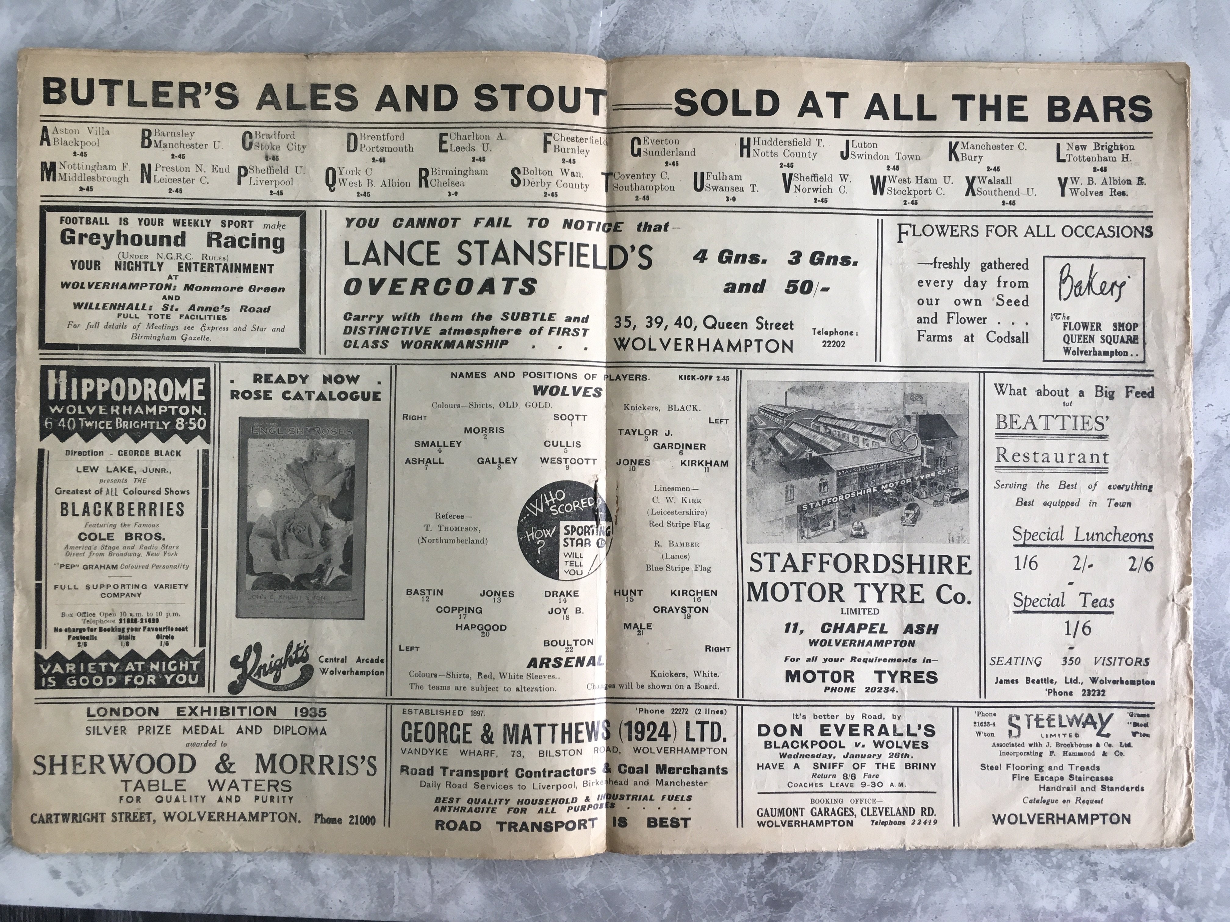 37/38 Wolves v Arsenal Football Programme: Covers have heavy wear and rear cover is missing a piece from corner. Inside good with no team changes