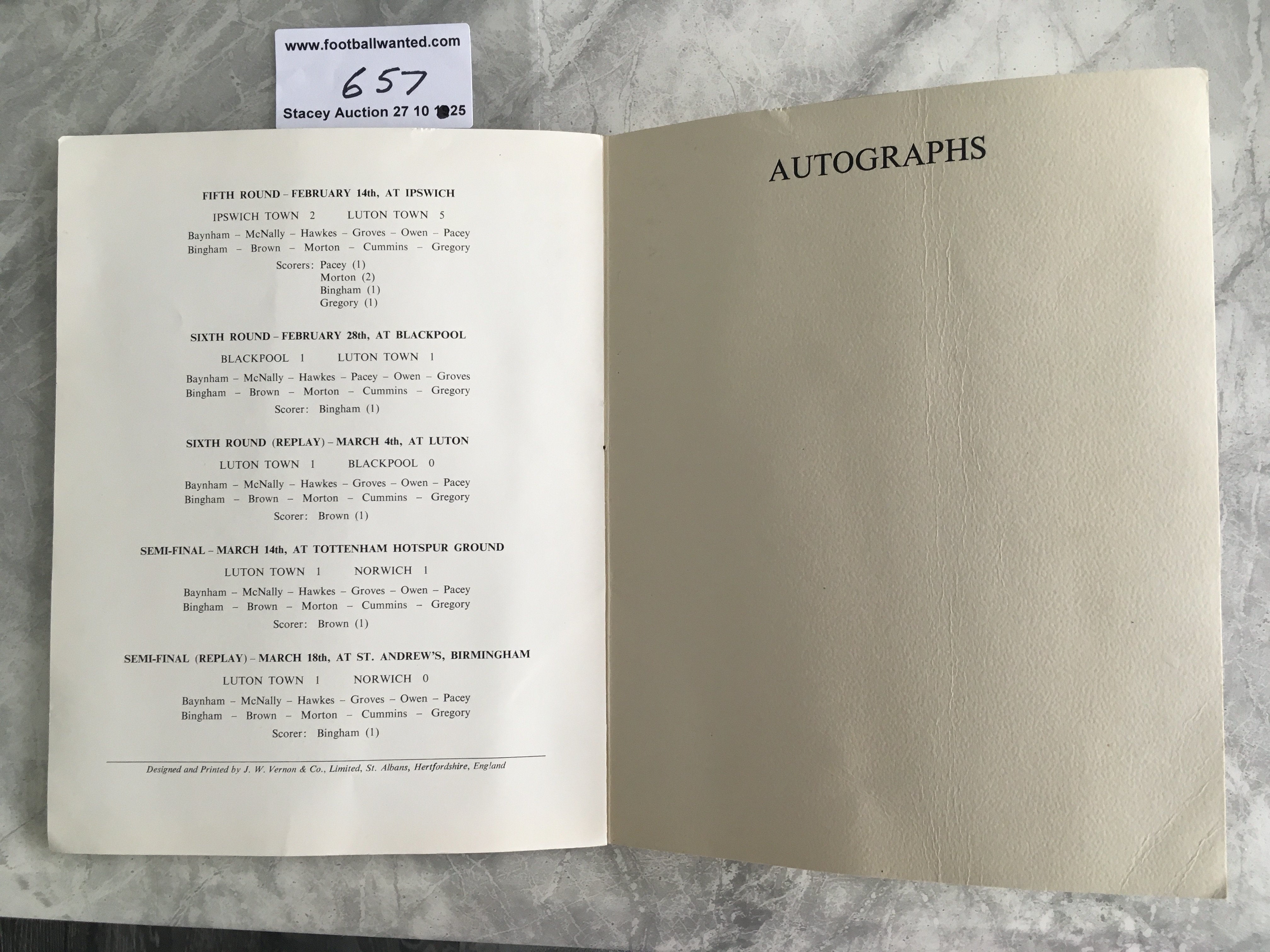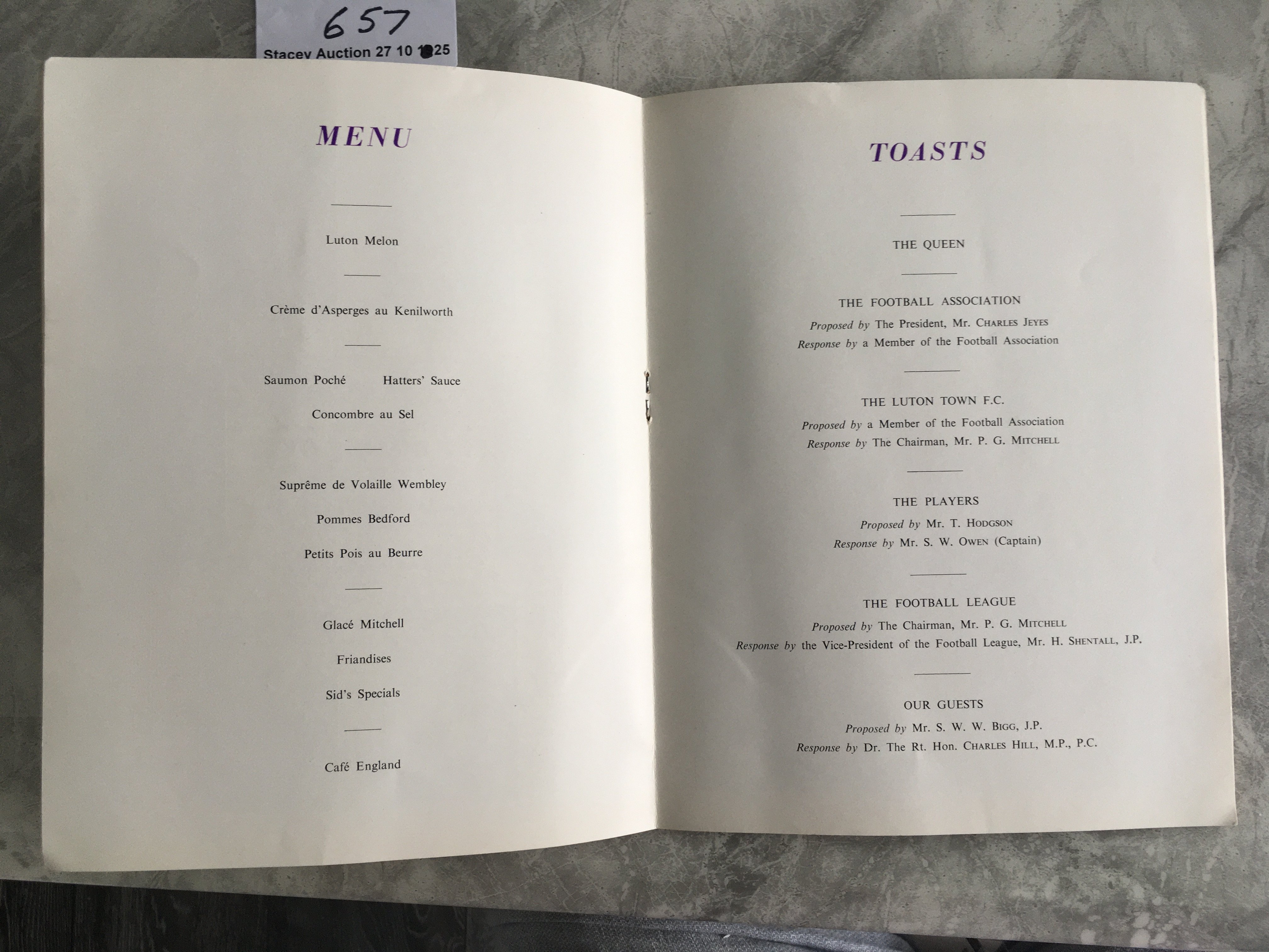 1959 Luton Town FA Cup Final Football Menu: Stunning menu with ribbons held at the Piccadilly Hotel in London the evening of the match. Excellent condition.