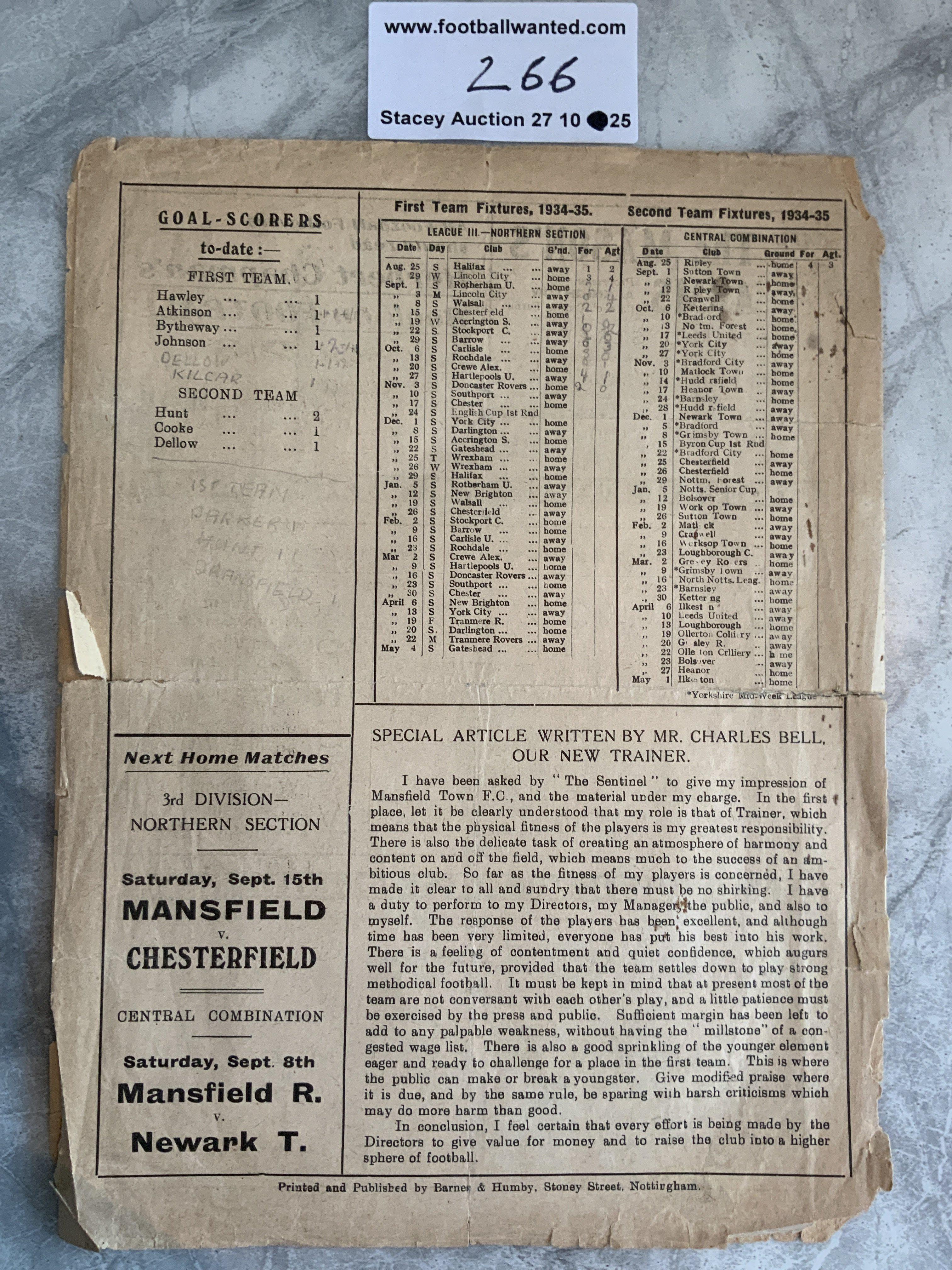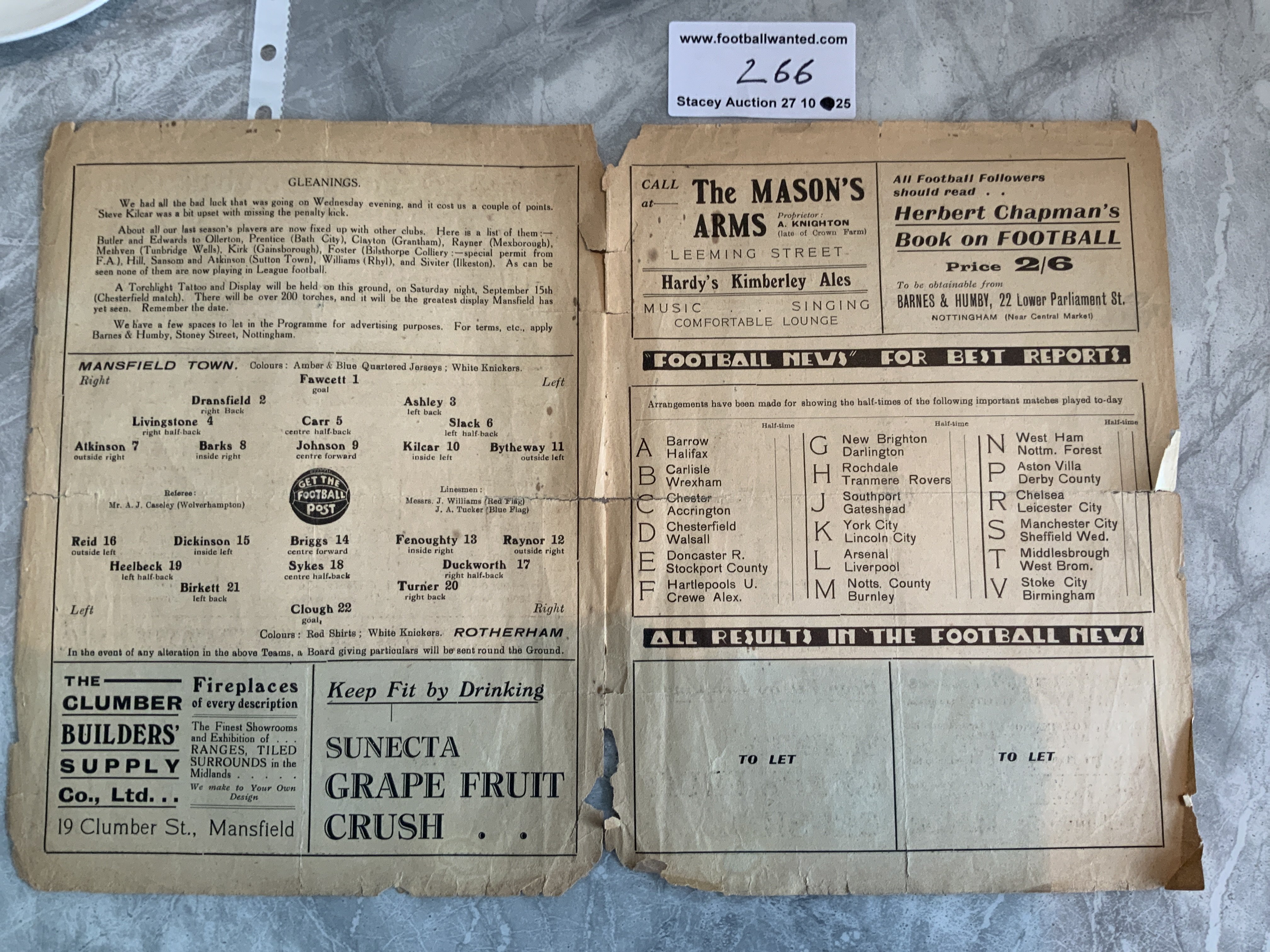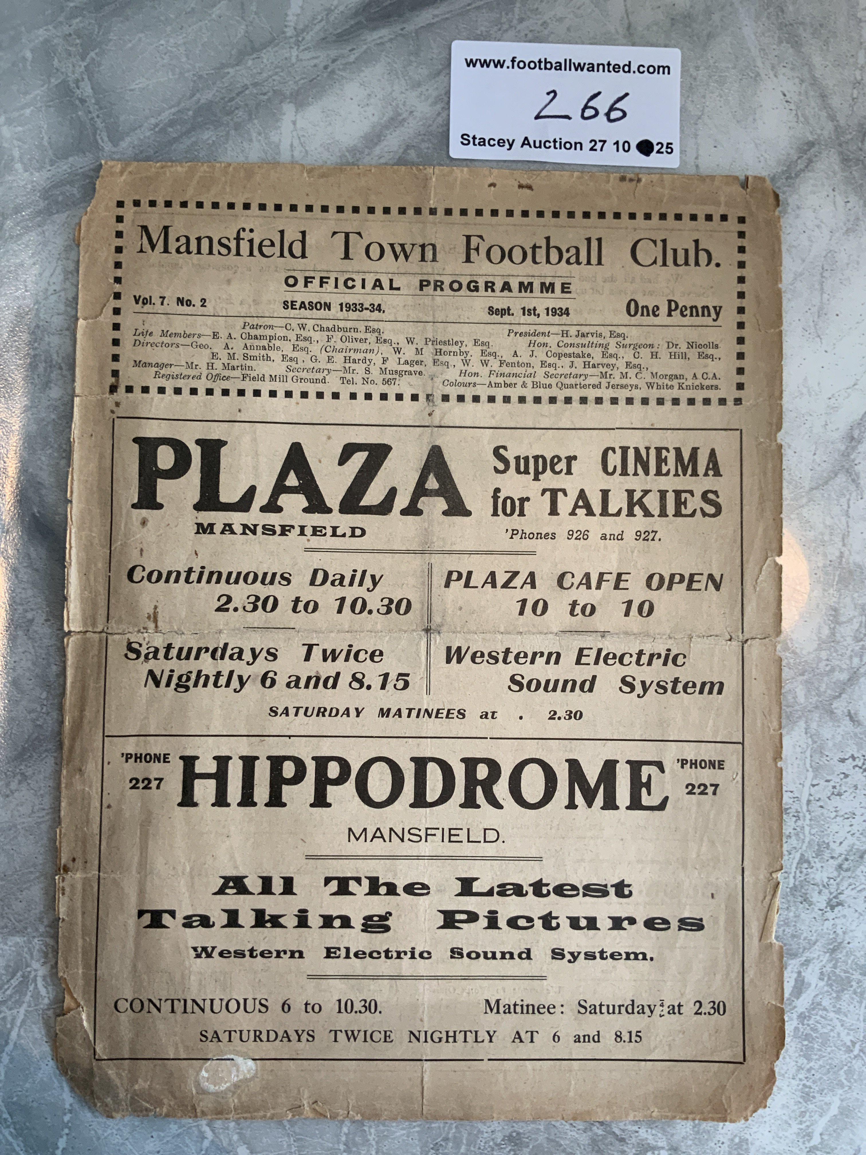 33/34 Mansfield Town v Rotherham Football Programme: 4 pager is poor with tears and some pieces missing to border not affecting any text. No team changes.