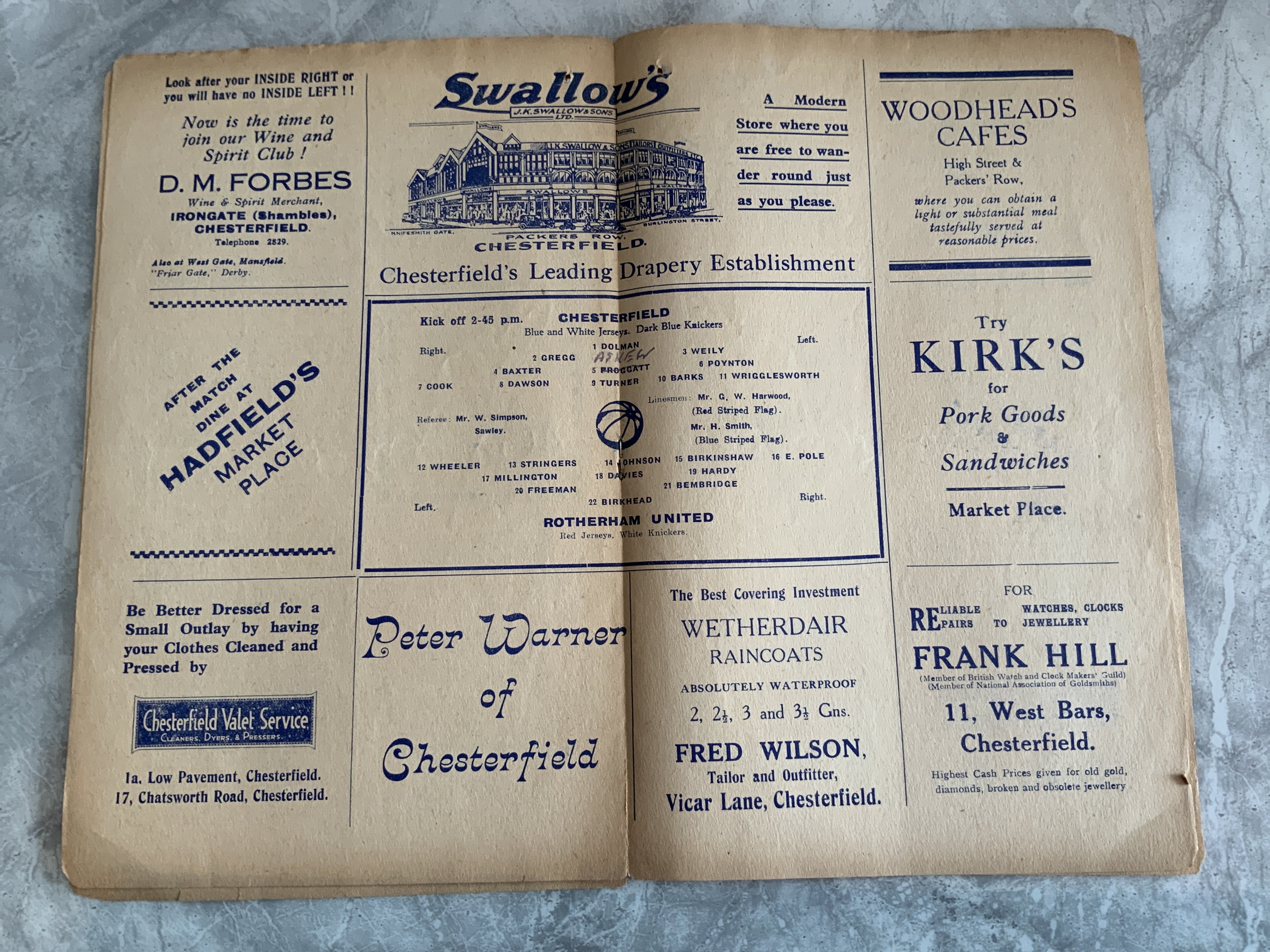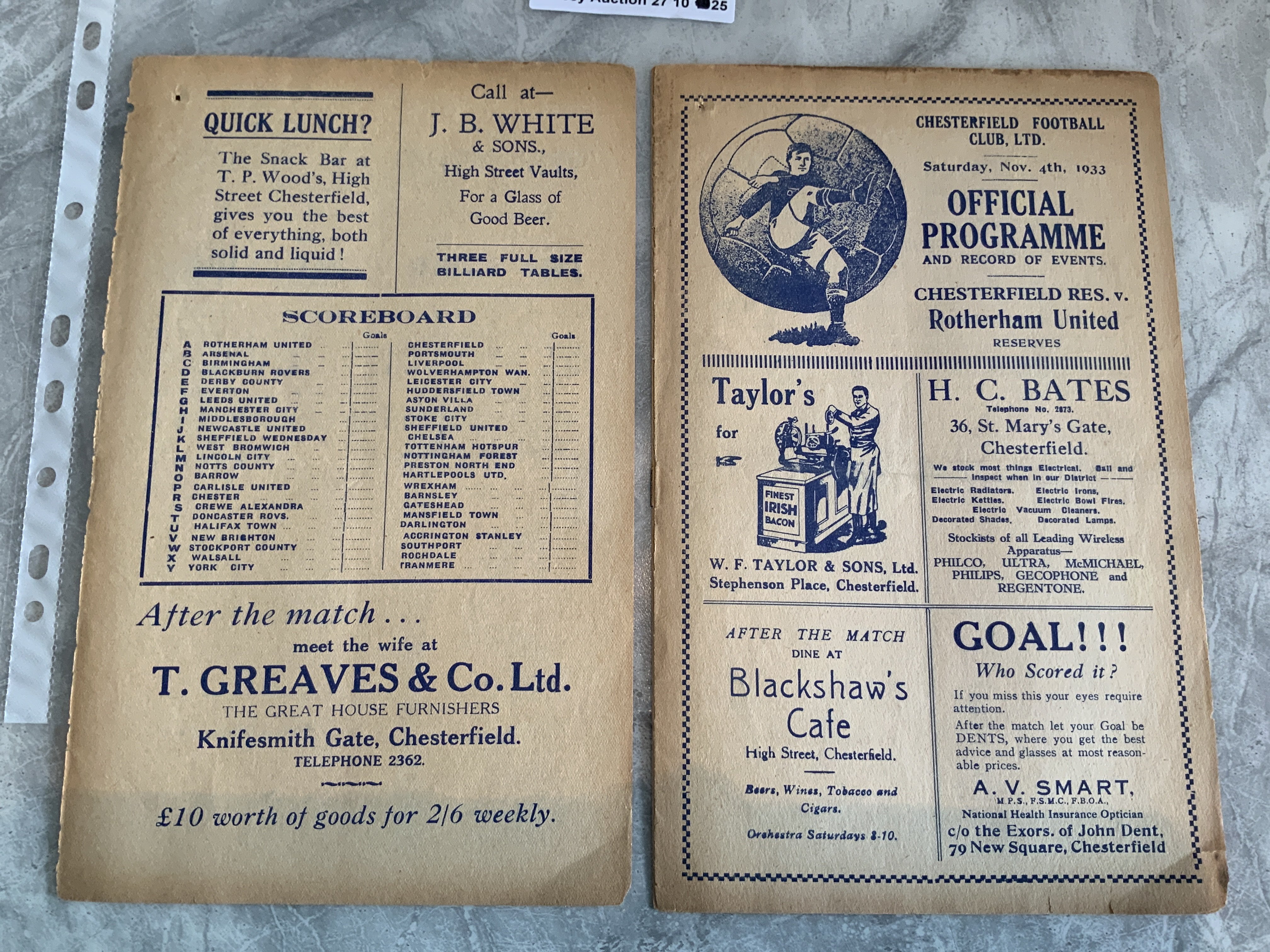 33/34 Chesterfield Reserves v Rotherham Football Programme: Midland League match with one pencilled team change. Spine completely split otherwise good.