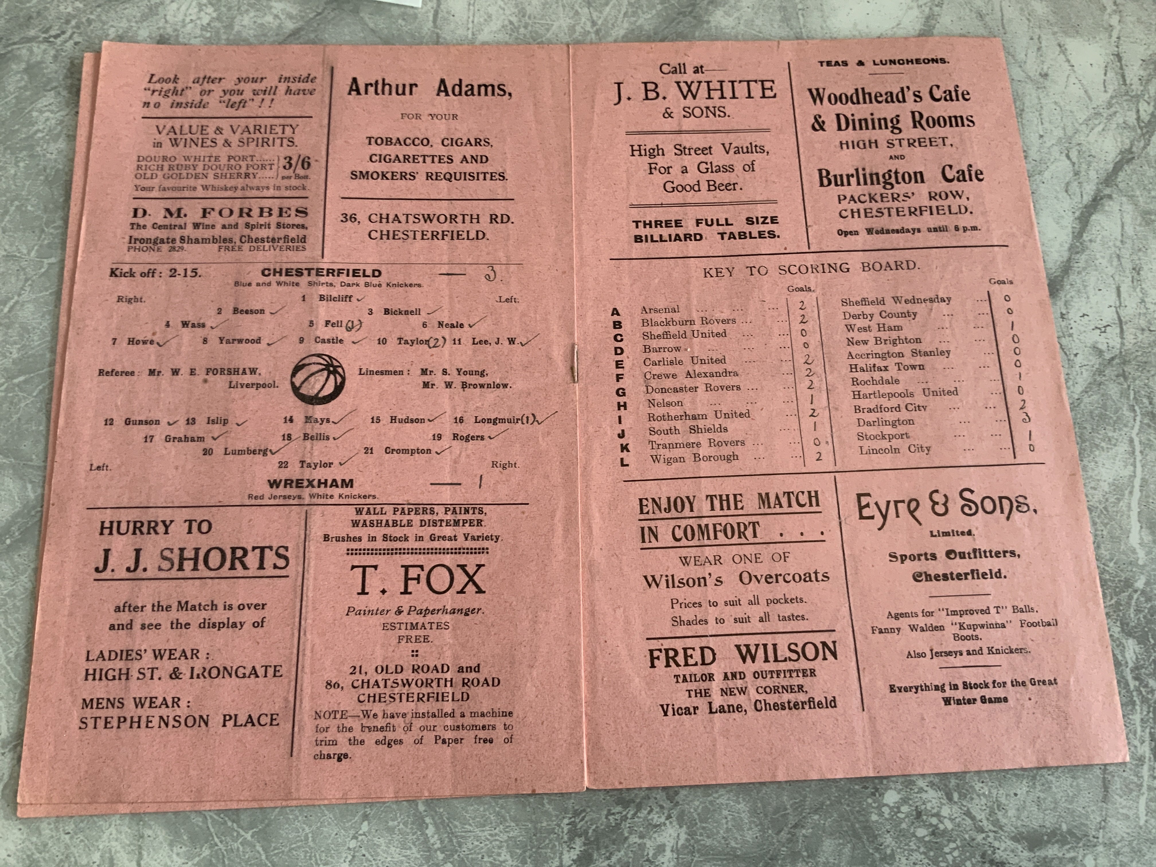 1928 - 1929 Chesterfield v Wrexham Football Programme: Good condition division 3 league match with no team changes. Ticks and numbers to team page inside. Number to cover.