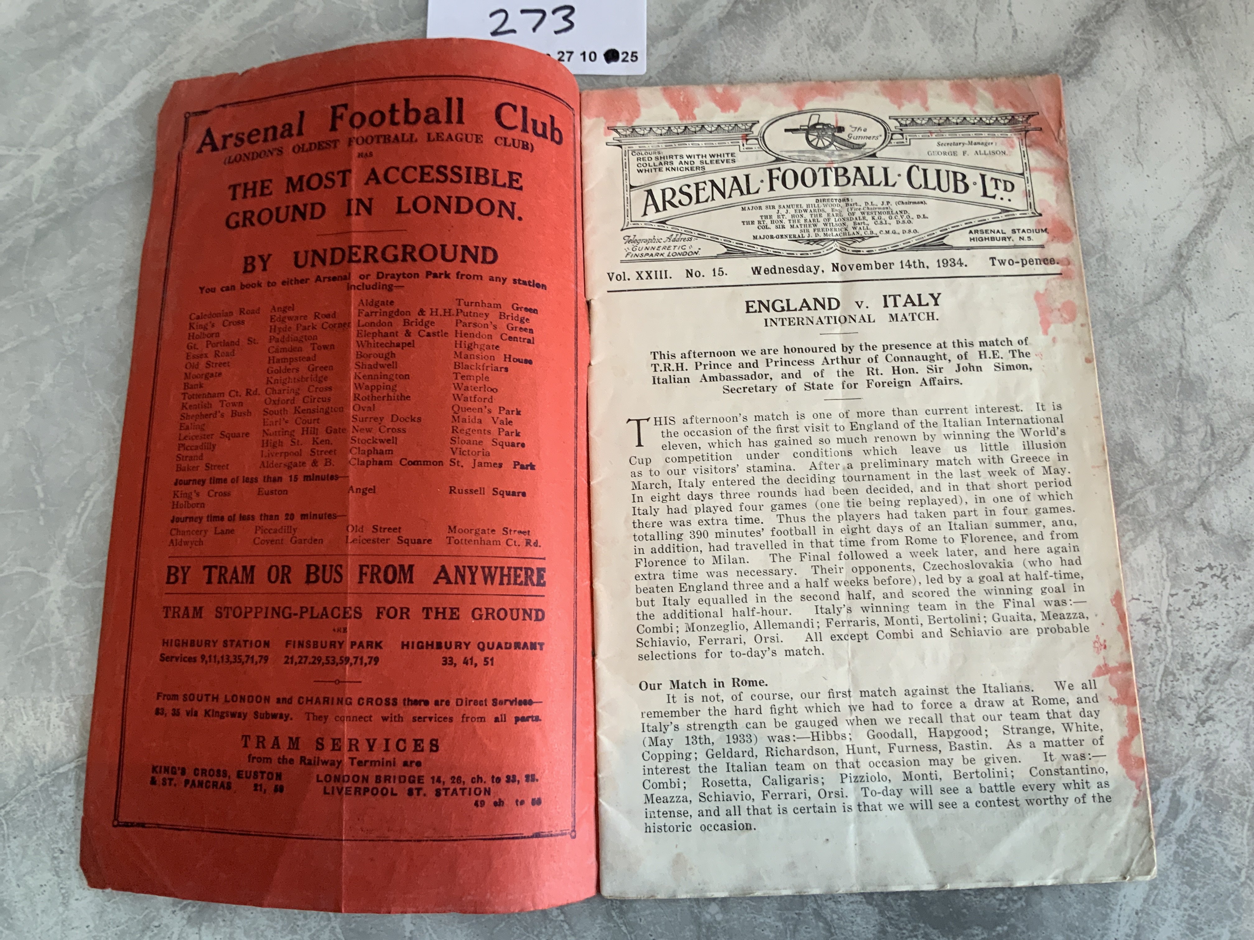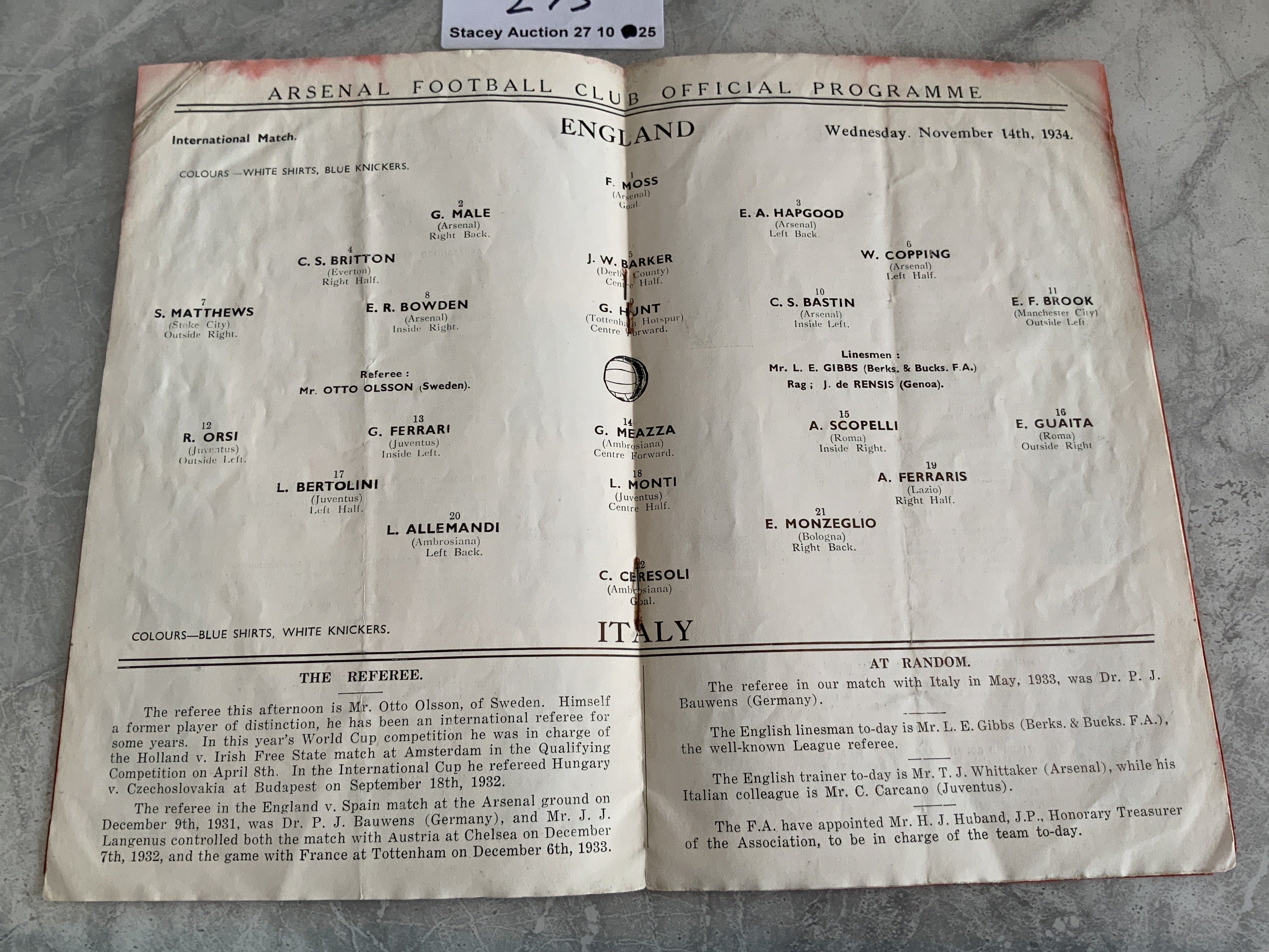 1934 England v Italy Football Programme: Full International played at Arsenal. Good condition although some bleeding inside from red covers. Slight fold but no team changes.