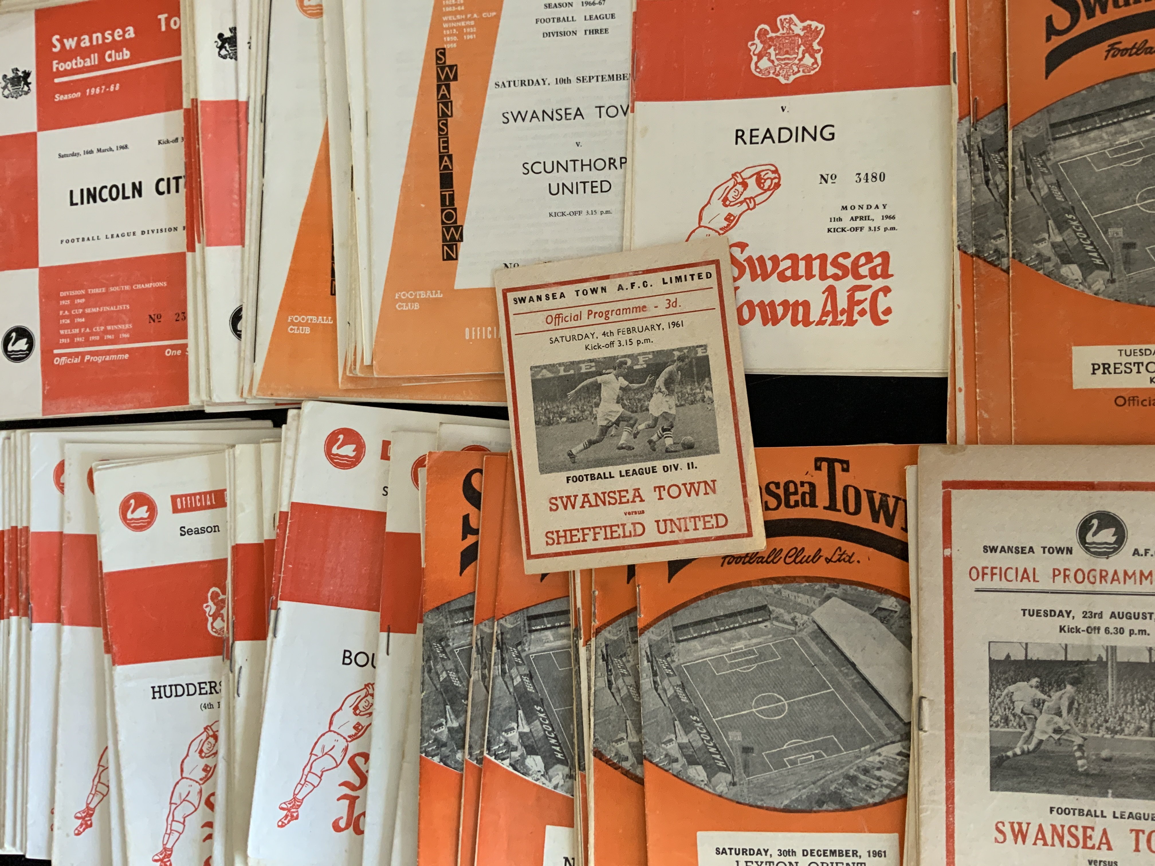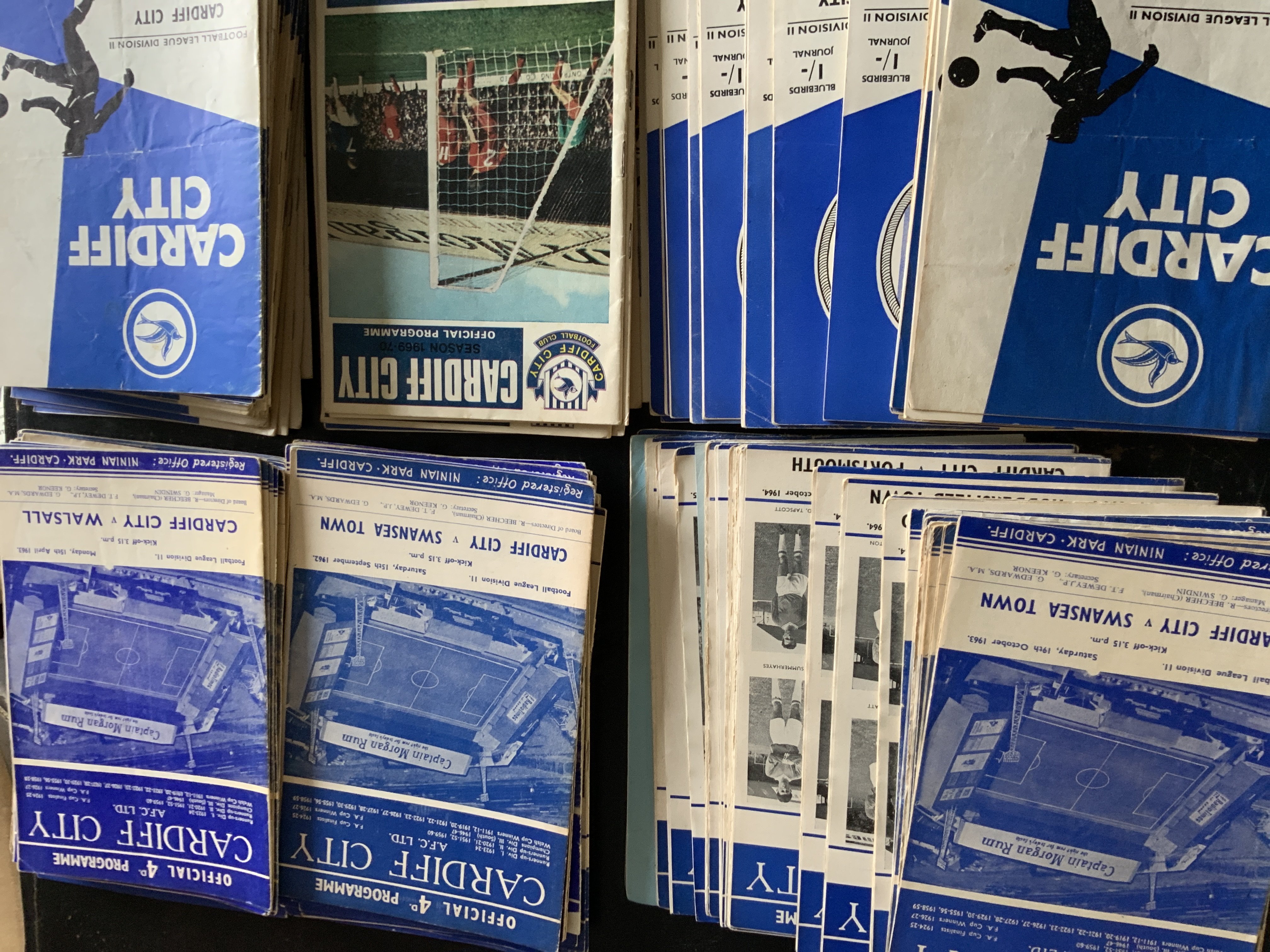 Swansea + Cardiff City Home Football Programmes: Swansea has 15 from 57/58 to 59/60 and approximately 90 from the 60s. Cardiff has 140 from the 60s plus some early 70s. Instructions to sell. Very good. (est 300)