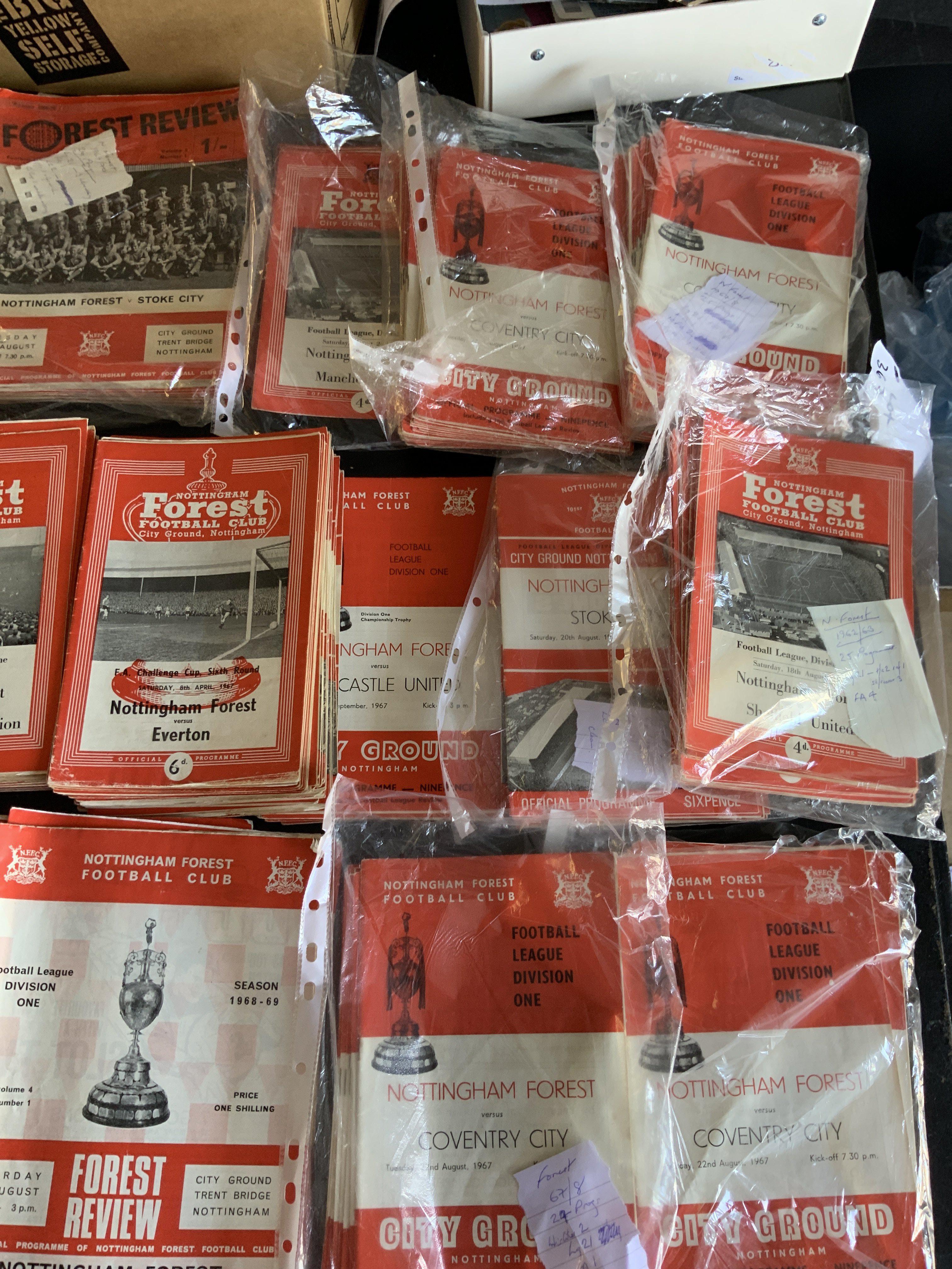 Nottingham Forest Home Football Programmes: 13 from the late 50s and approximately 330 from the 60s with a few early 70s. 8 seasons sets from the 60s are near complete. A further 20+ aways from the 60s. Instructions to sell. Very good. (est 360+)