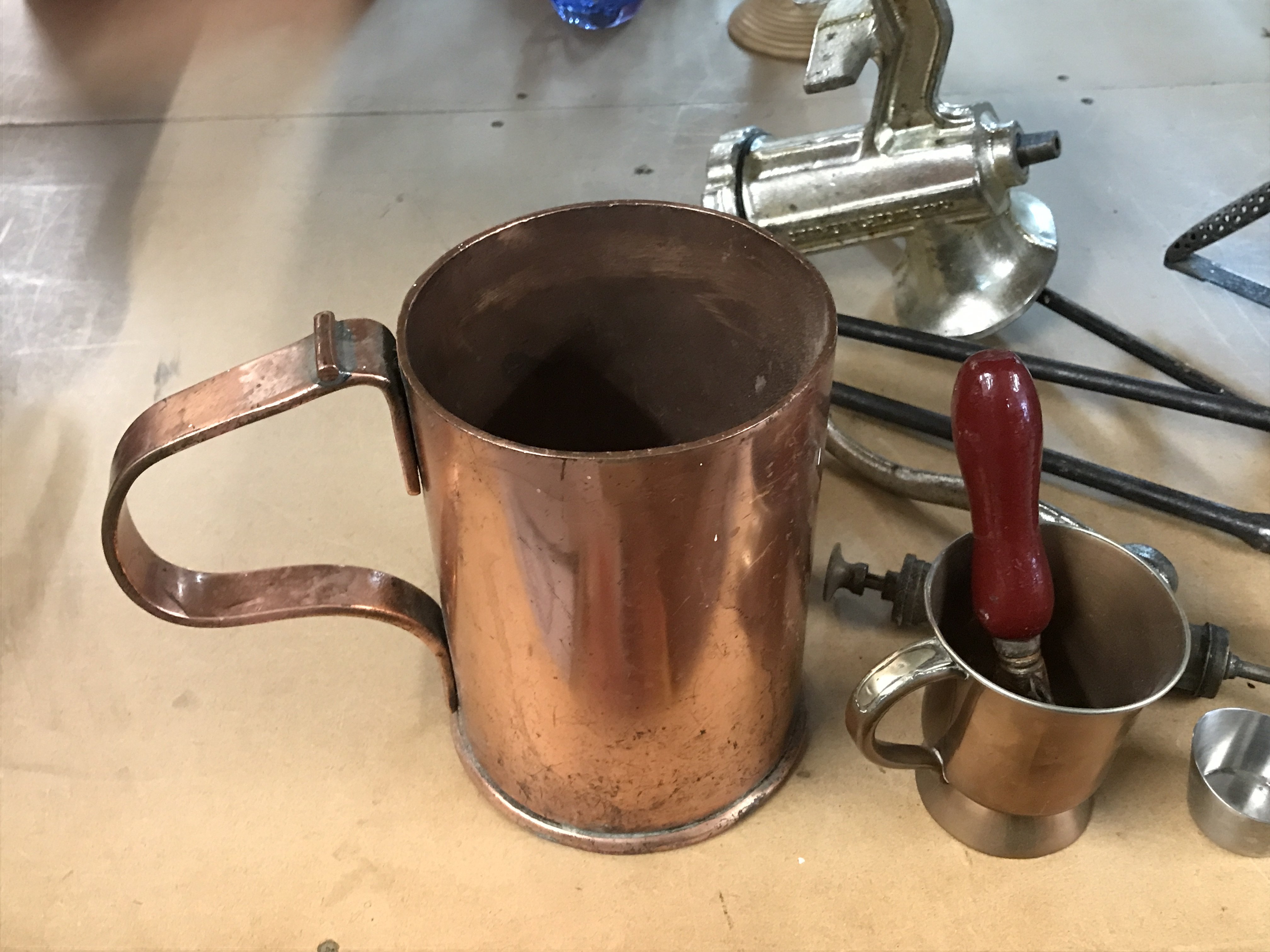 A large copper mug , hunting horn , porkert machine and other brass etc . This lot cannot be posted- NO RESERVE