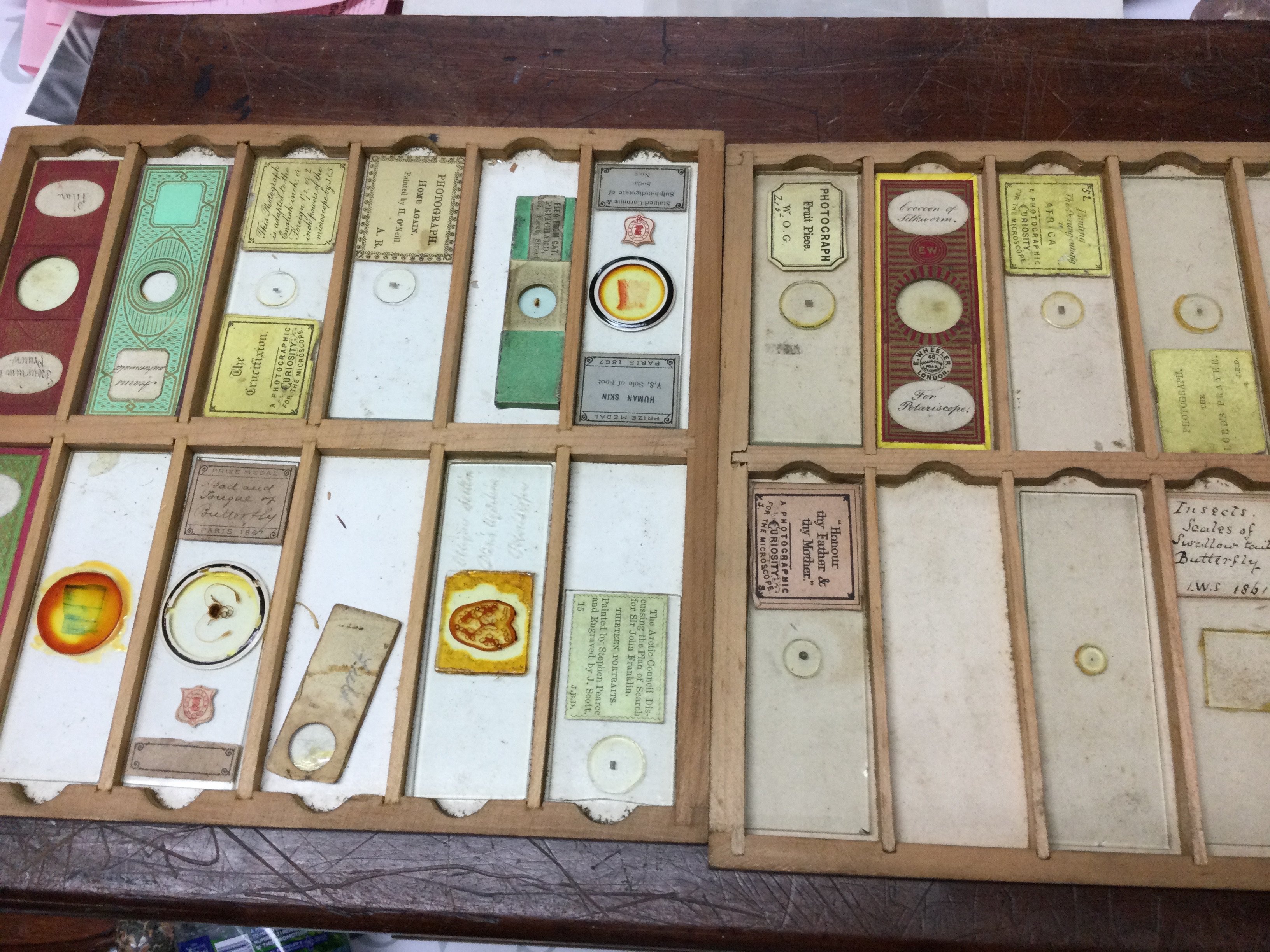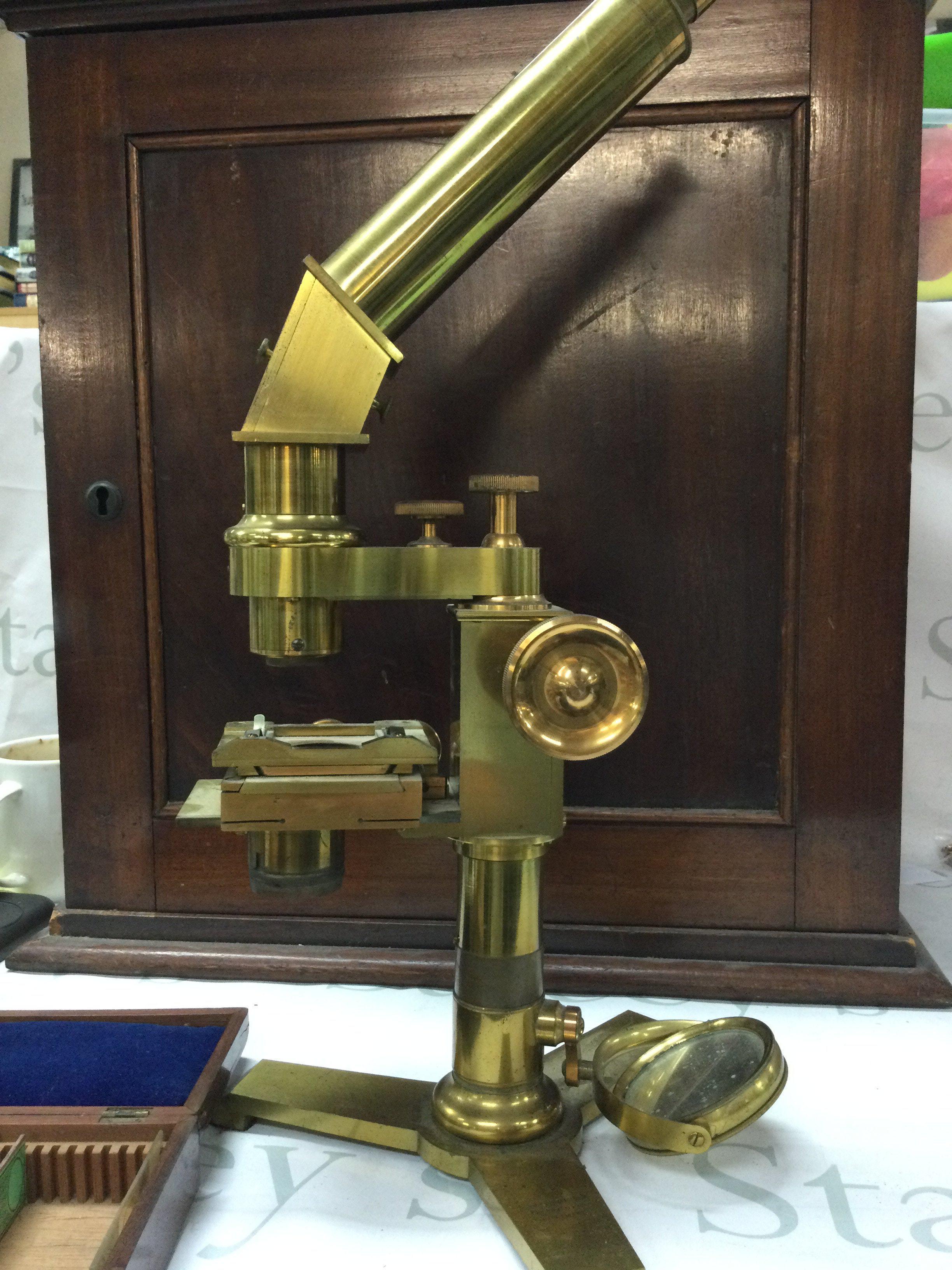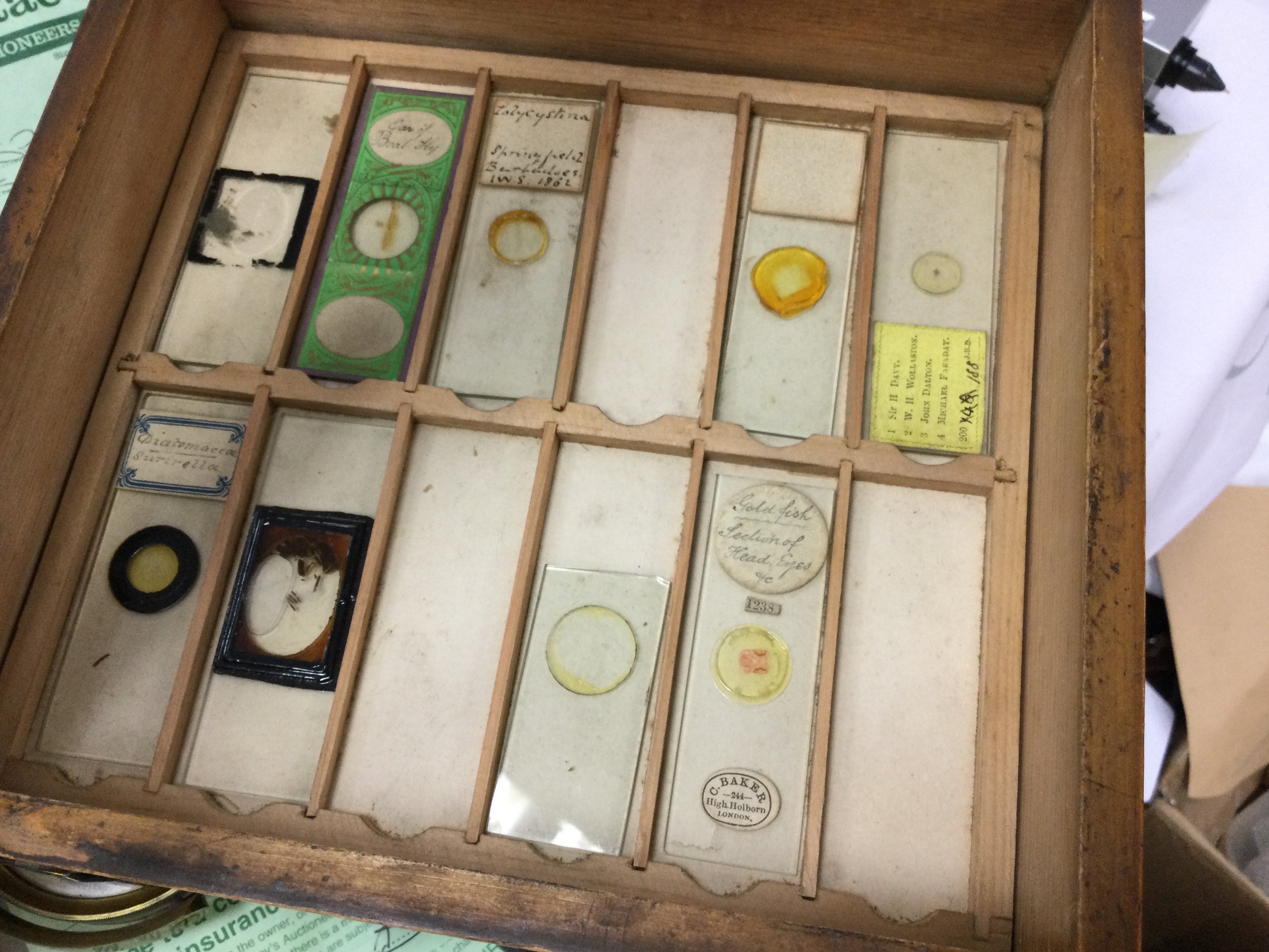 A cased brass Monocular together with a mahogany cabinet fitted with numerous specimen slides one other brass Monocular and a smaller case of slides.