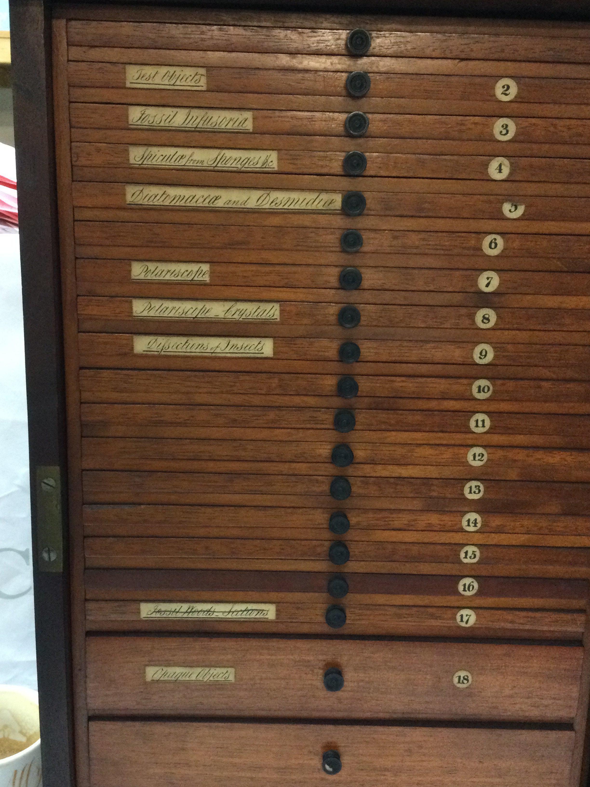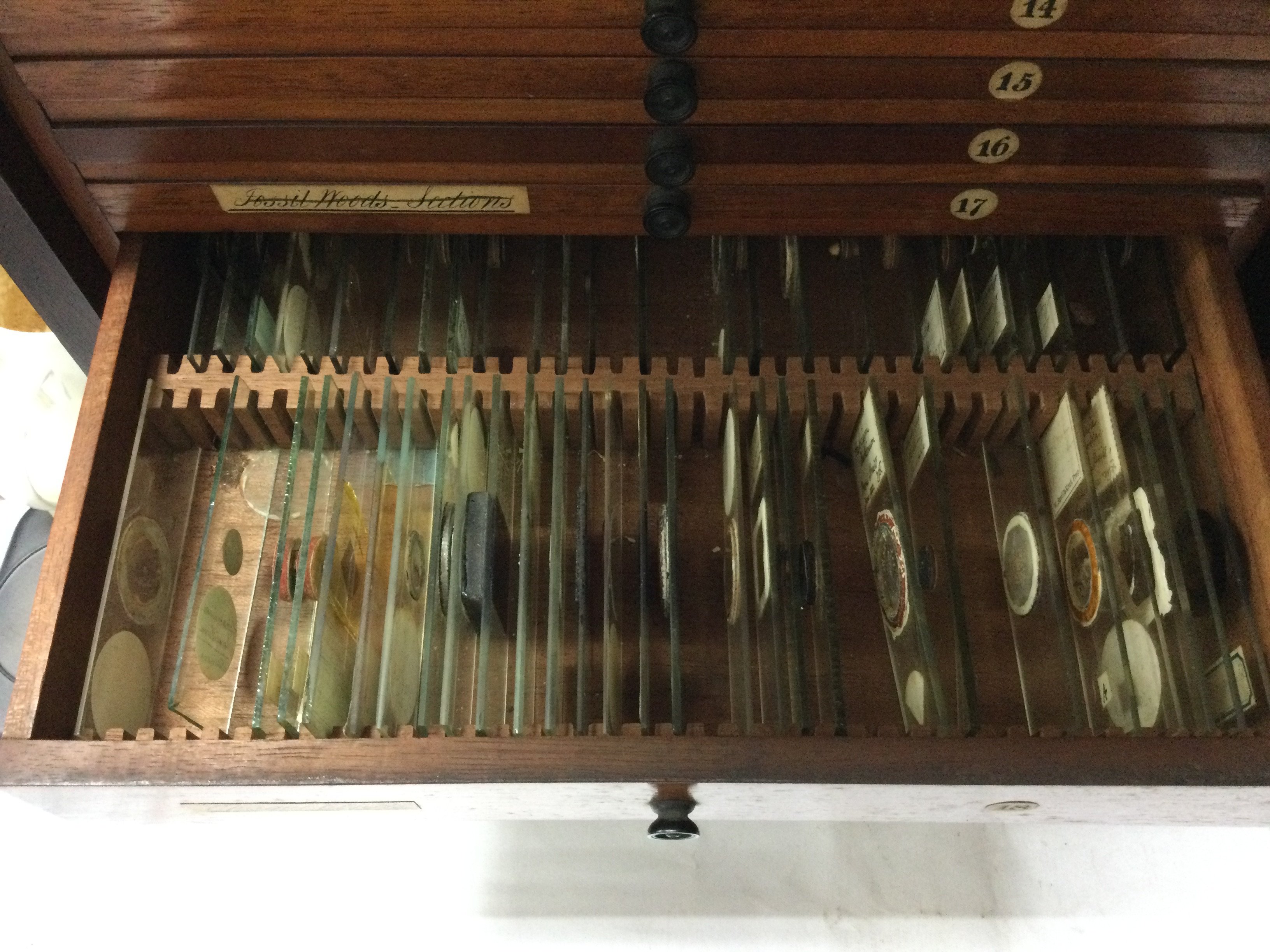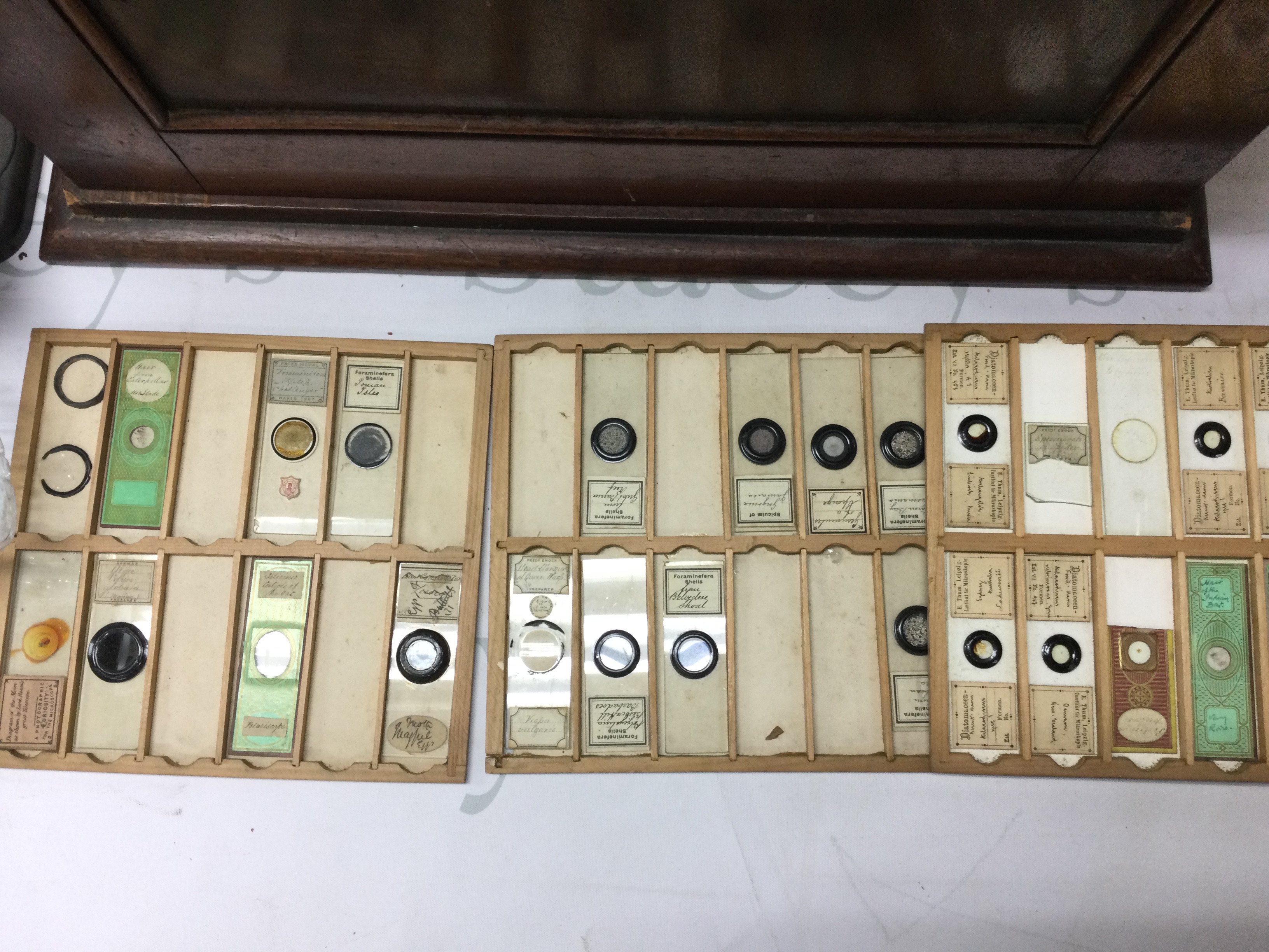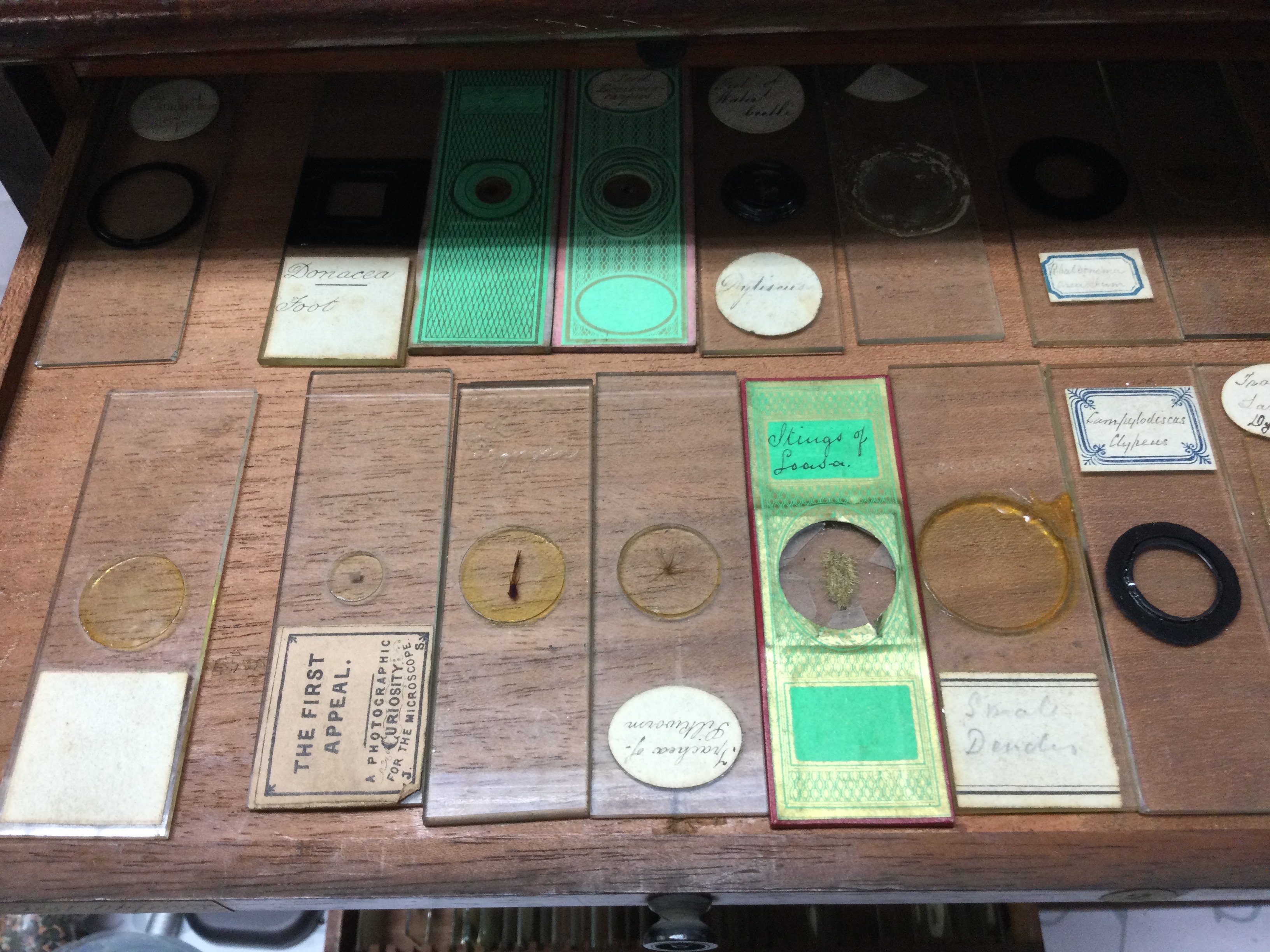 A cased brass Monocular together with a mahogany cabinet fitted with numerous specimen slides one other brass Monocular and a smaller case of slides.
