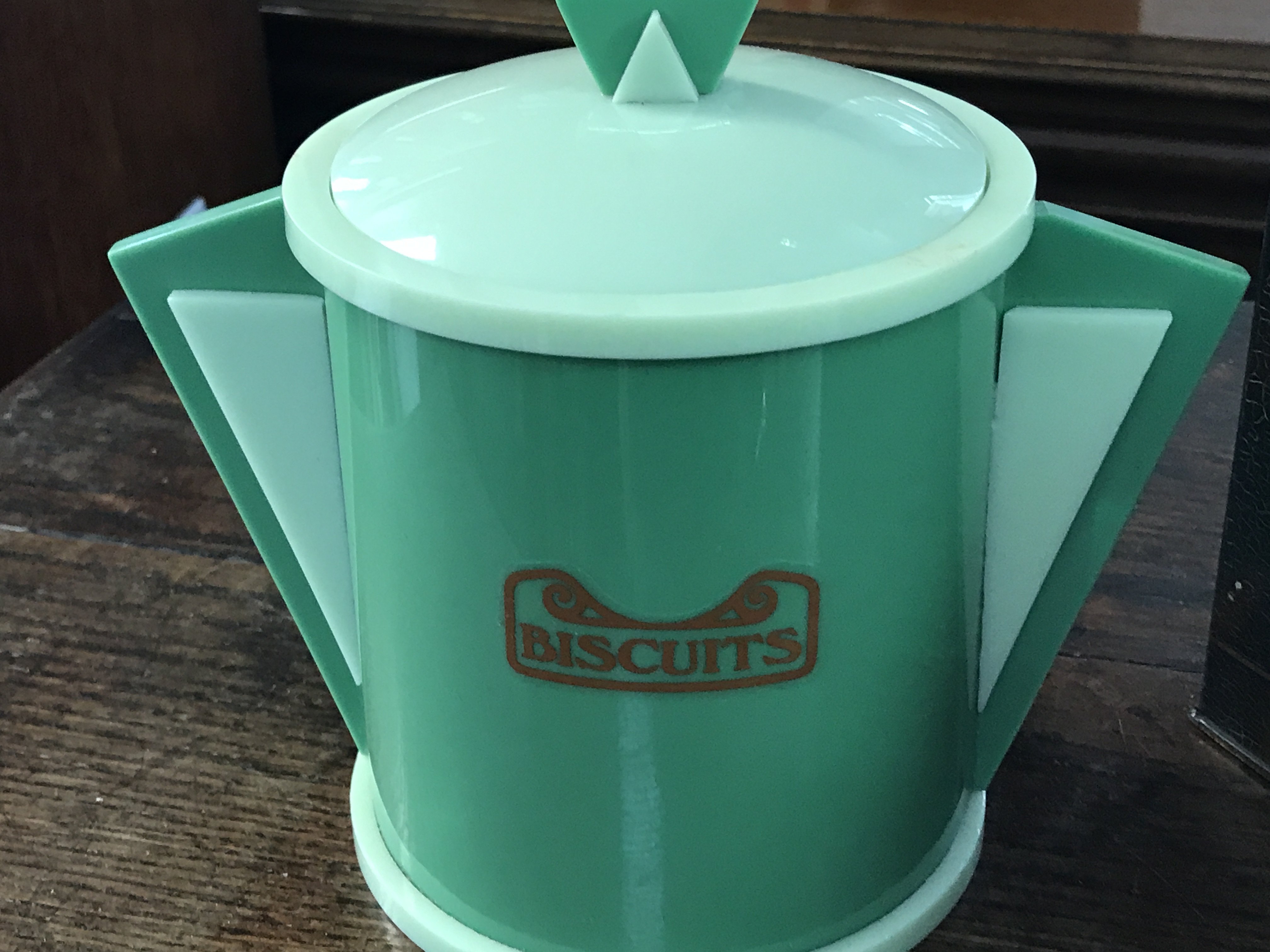 A blue bird tin and an art deco plastic jar. Postage category C- NO RESERVE