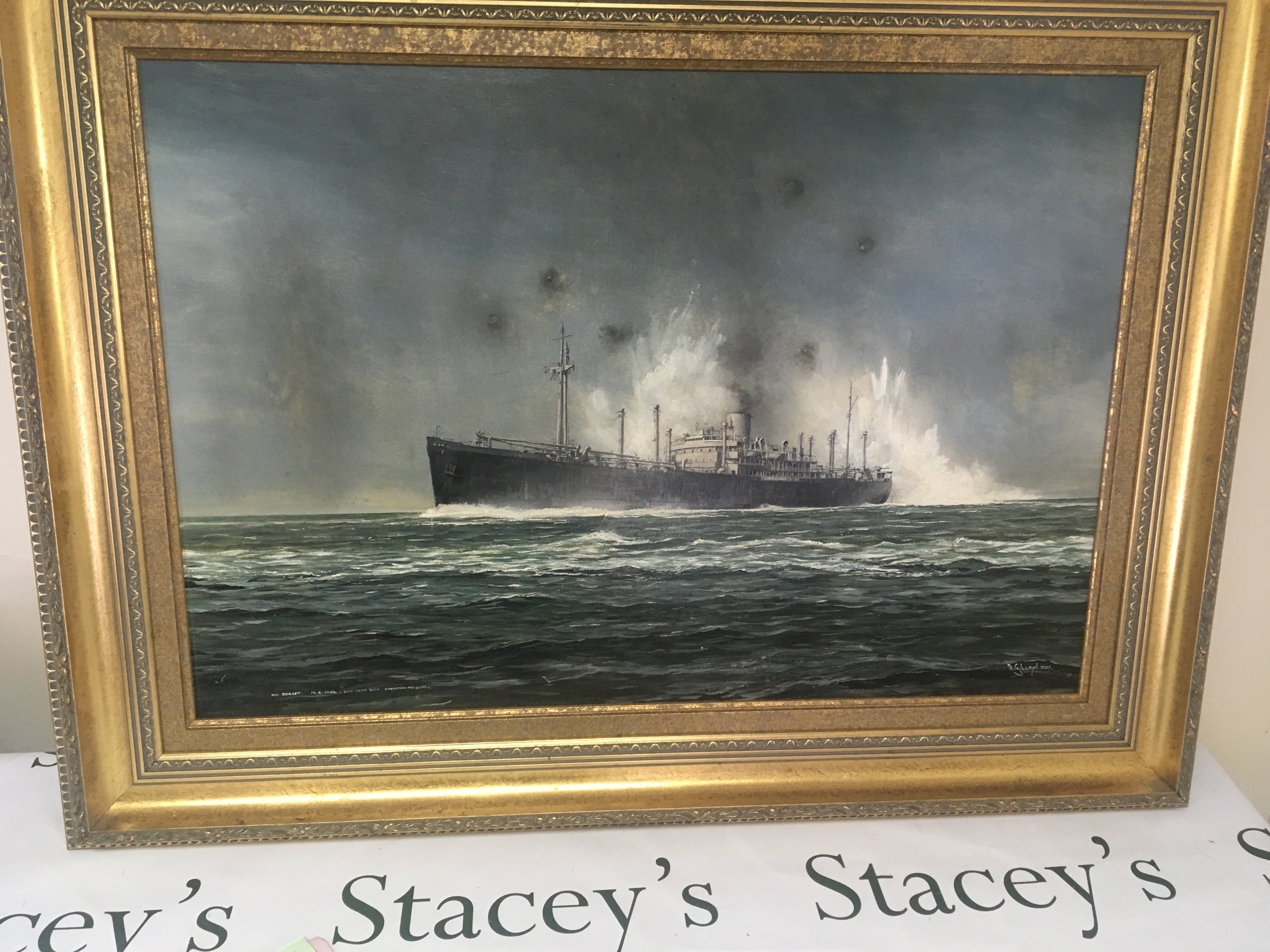 A framed oil painting on board Marine study of SS Dorset of Cape Bon during operation Pedestal. 13.8 1942 a convoy of ships sent to give relief and supplies to Malta which engaged with the enemy and incurred the loss of several merchant ships and Royal Navy ships. The painting signed by the artist Robert G Lloyd. 93x69cm