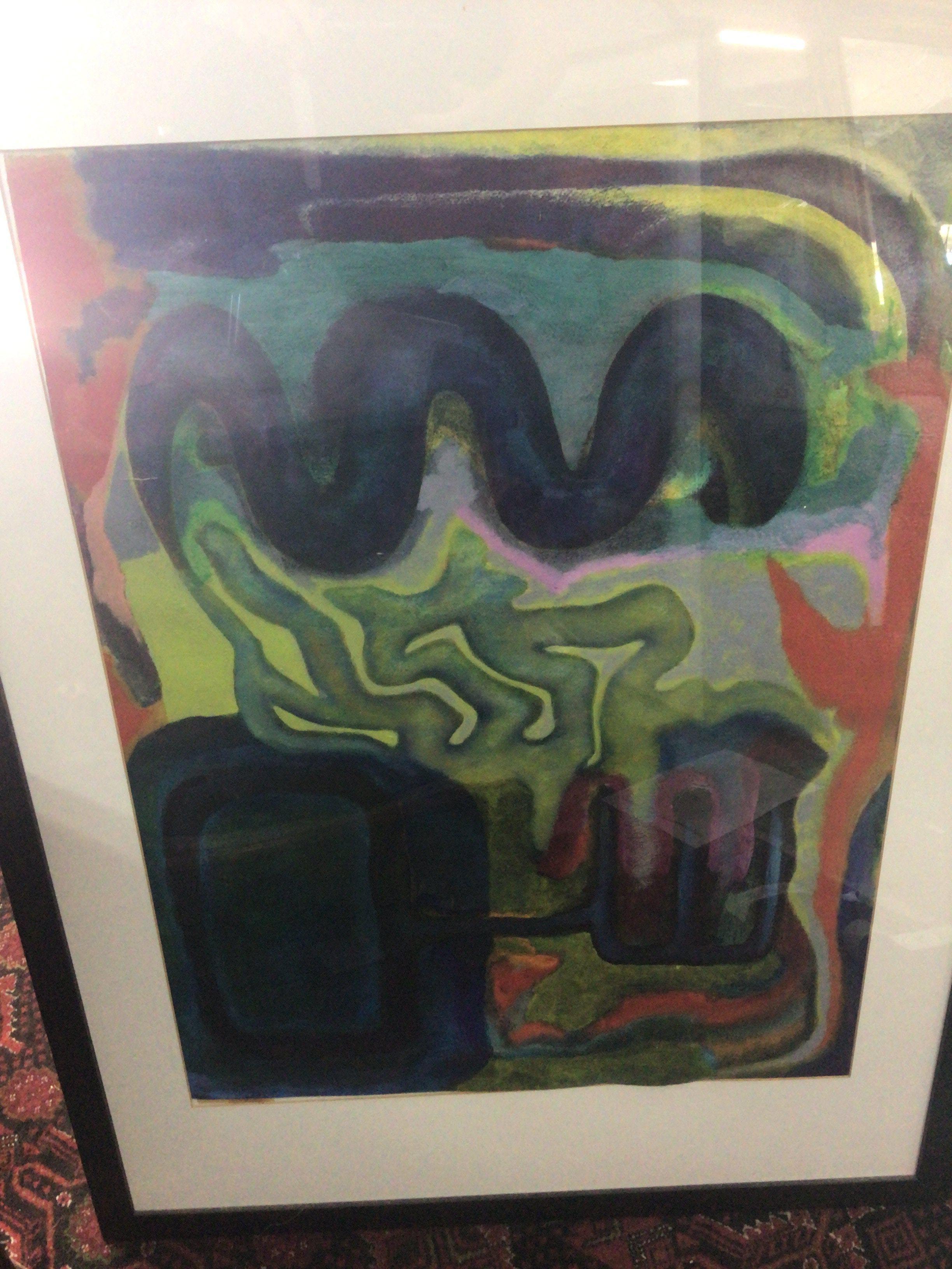 Two framed art works including an abstract painting and a large Howls moving castle anime print. Dimensions 65x106cm and 102x135cm This lot cannot be posted