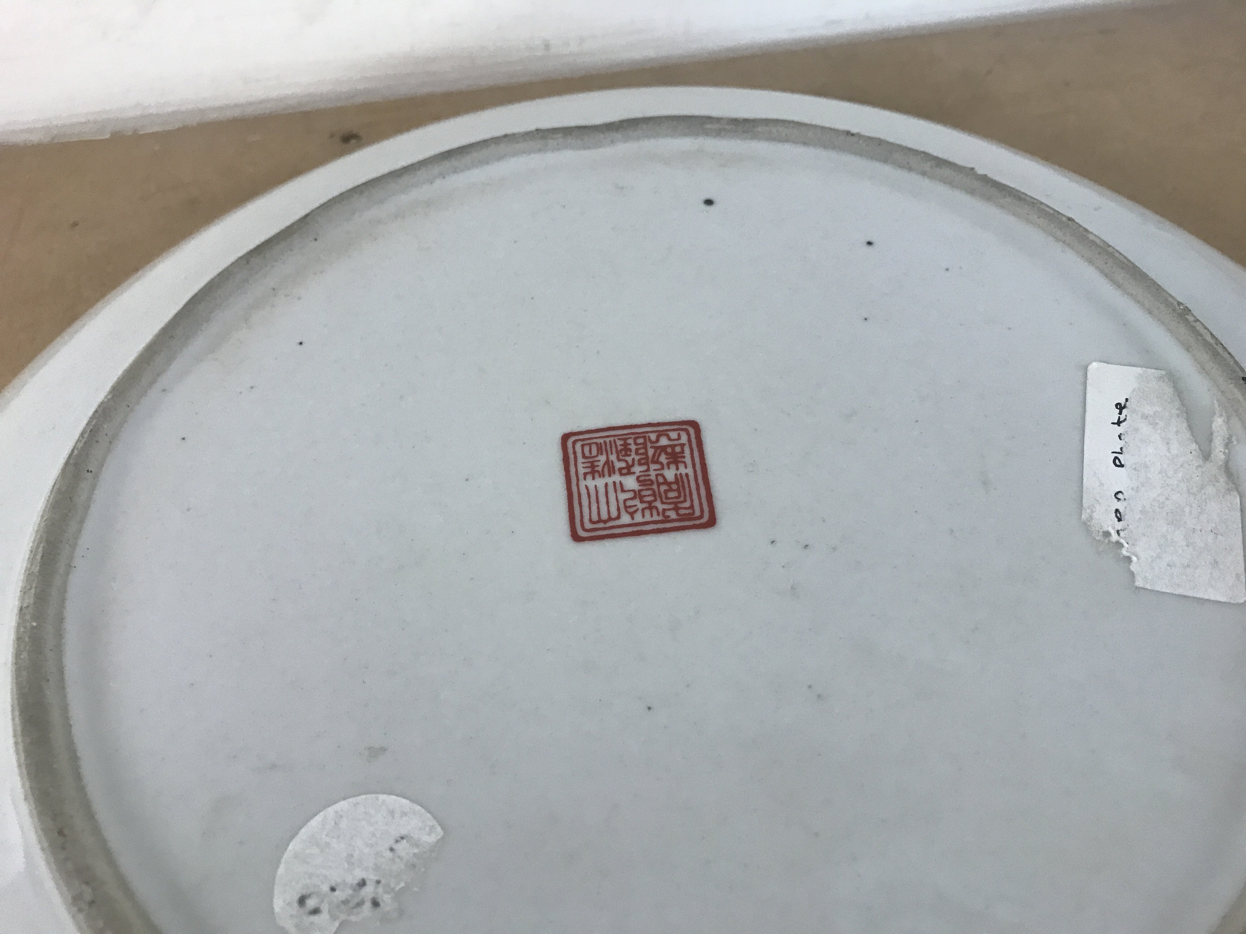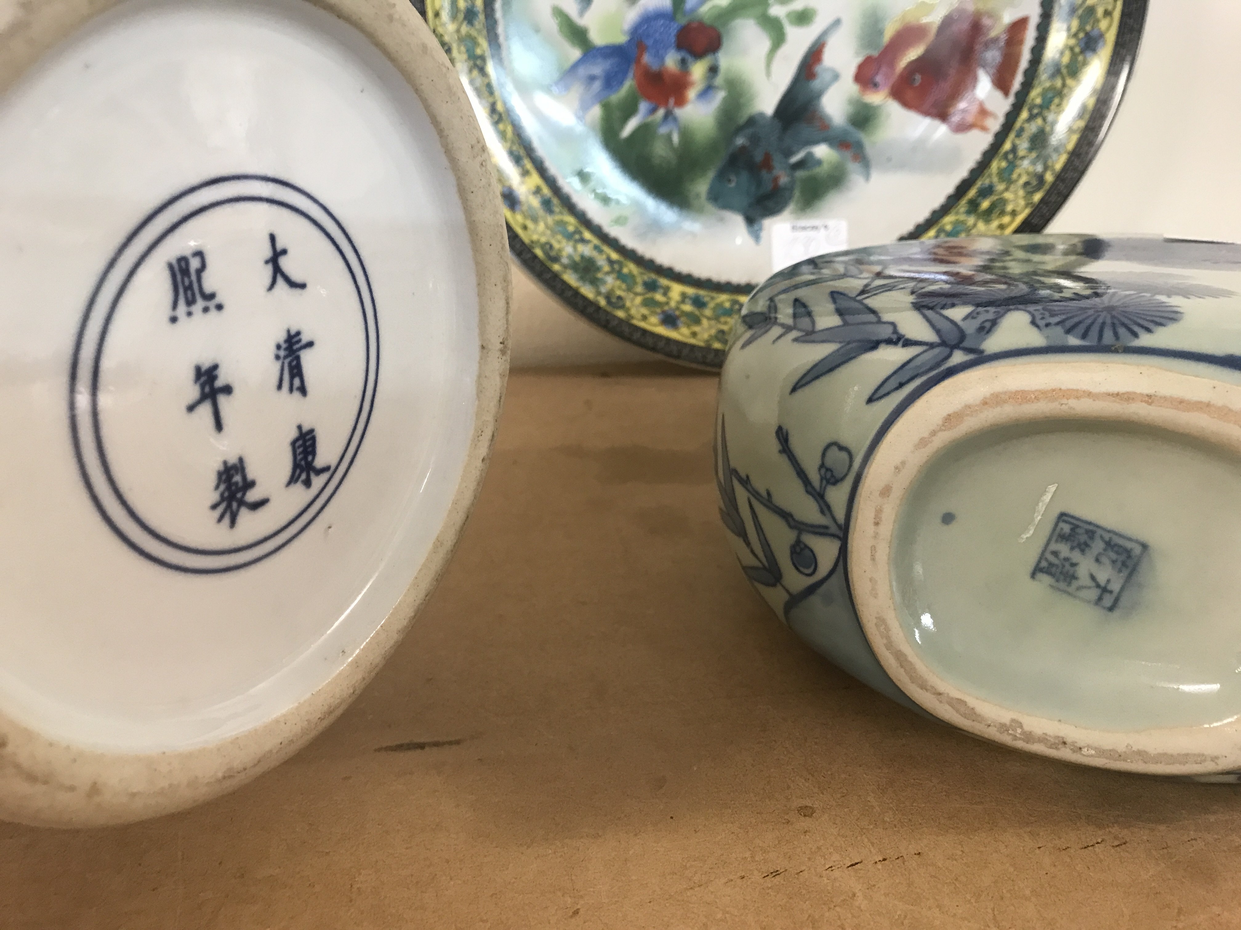 Chinese porcelain including a gold fish platter (34cm wide), a blue and white porcelain vase (25.5cm tall) with floral patterns and a Famille Rose vase (37.5cm tall). This lot cannot be posted- NO RESERVE