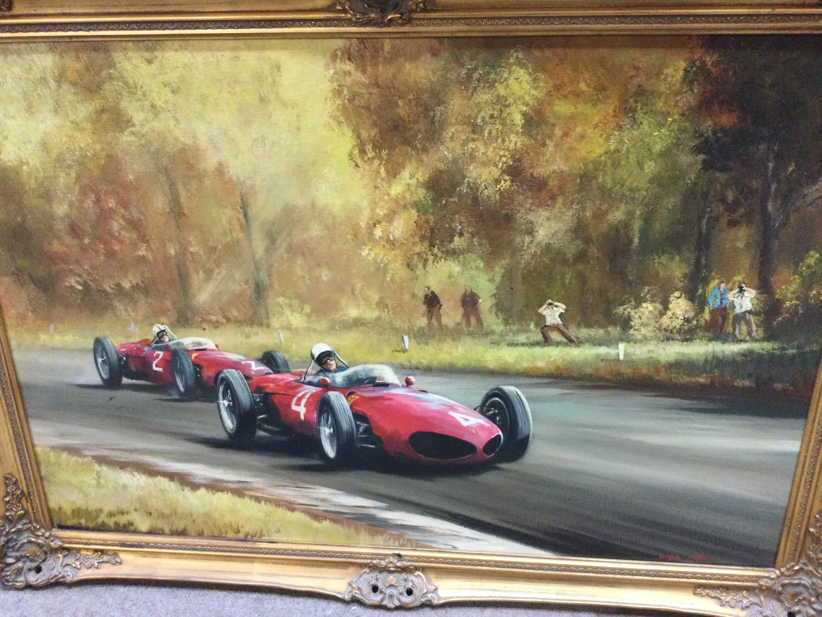 A framed Dion Pears oil painting depicting racing cars . 88 cm x 62 cm .