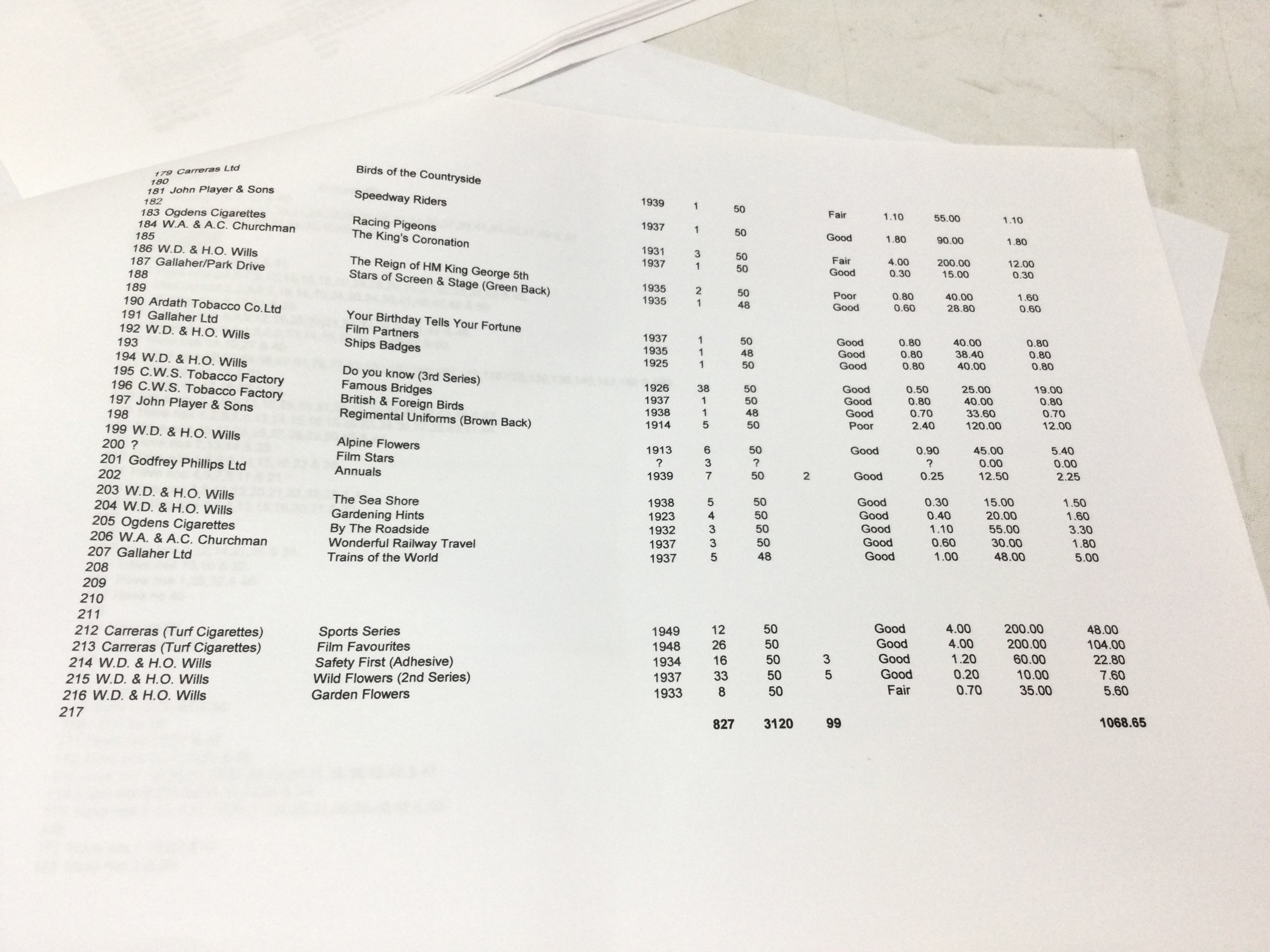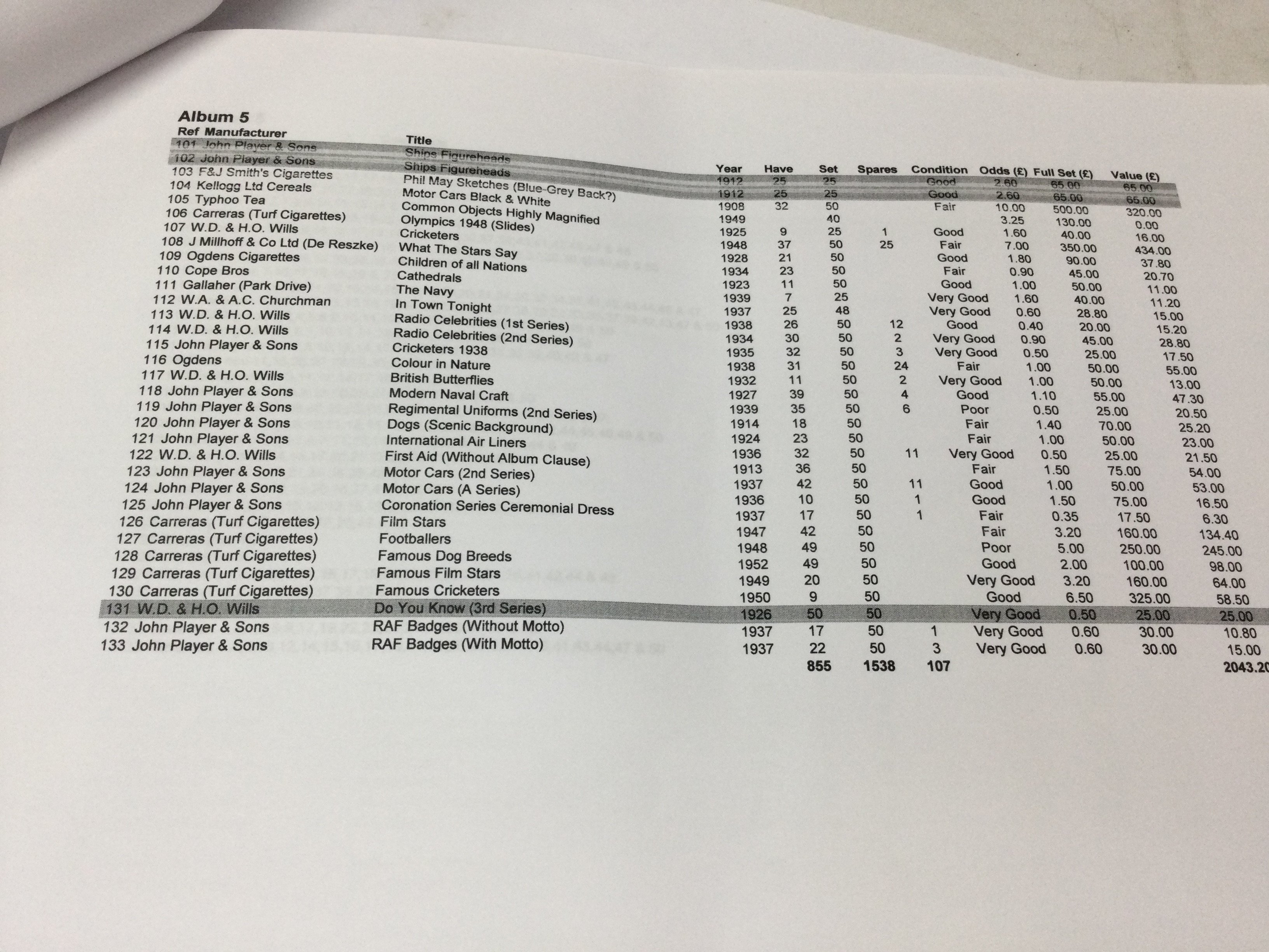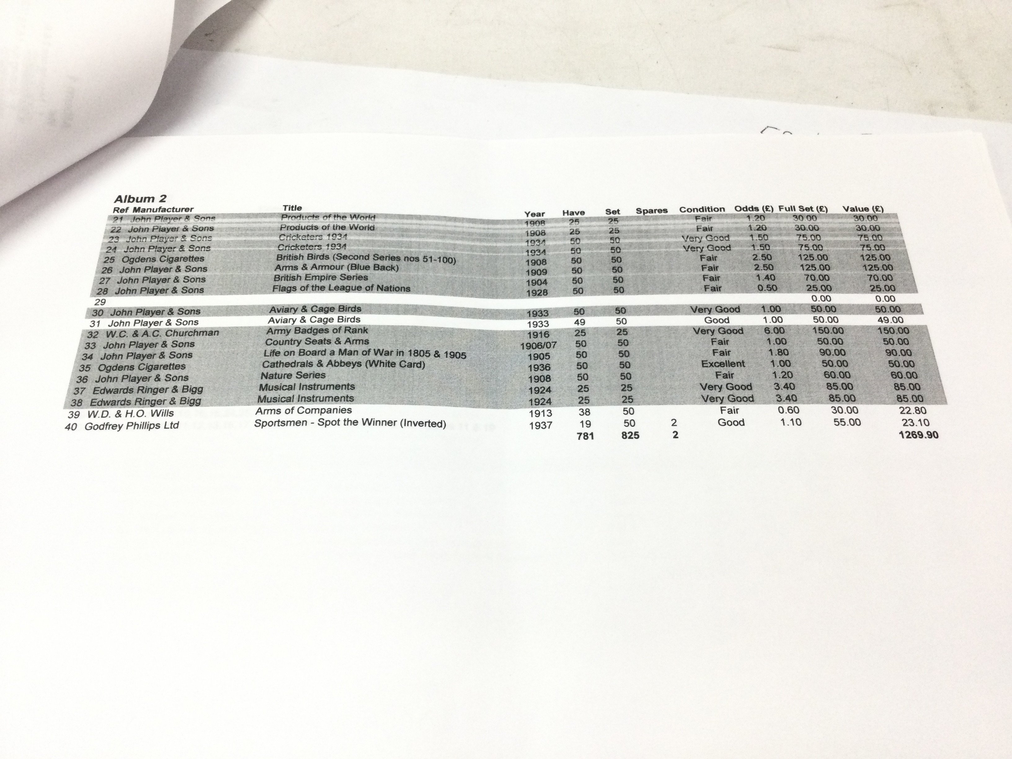 Six albums of cigarette cards comes with a detailed spreadsheet created by vendor of contents (not checked by auctioneers). Postage C
