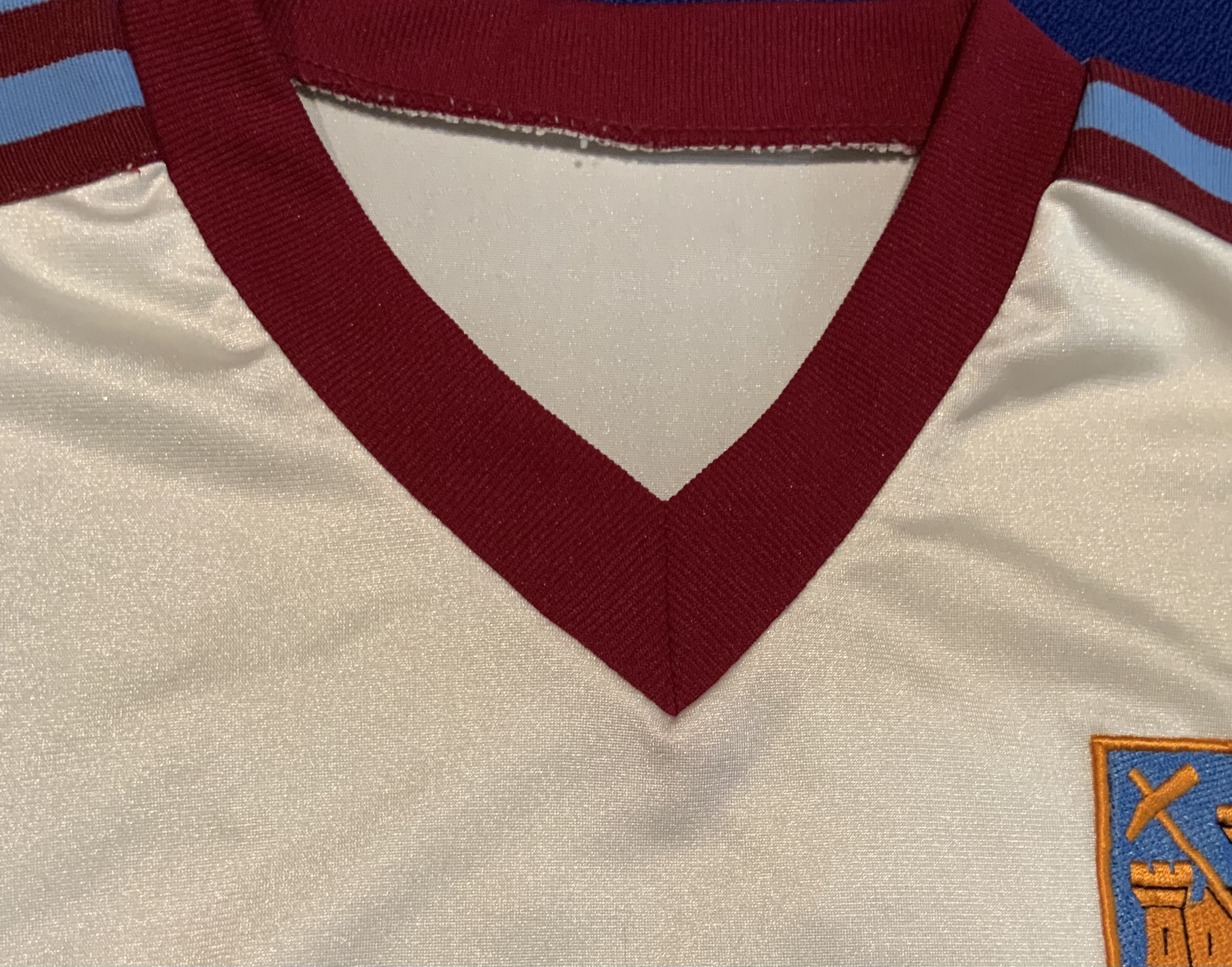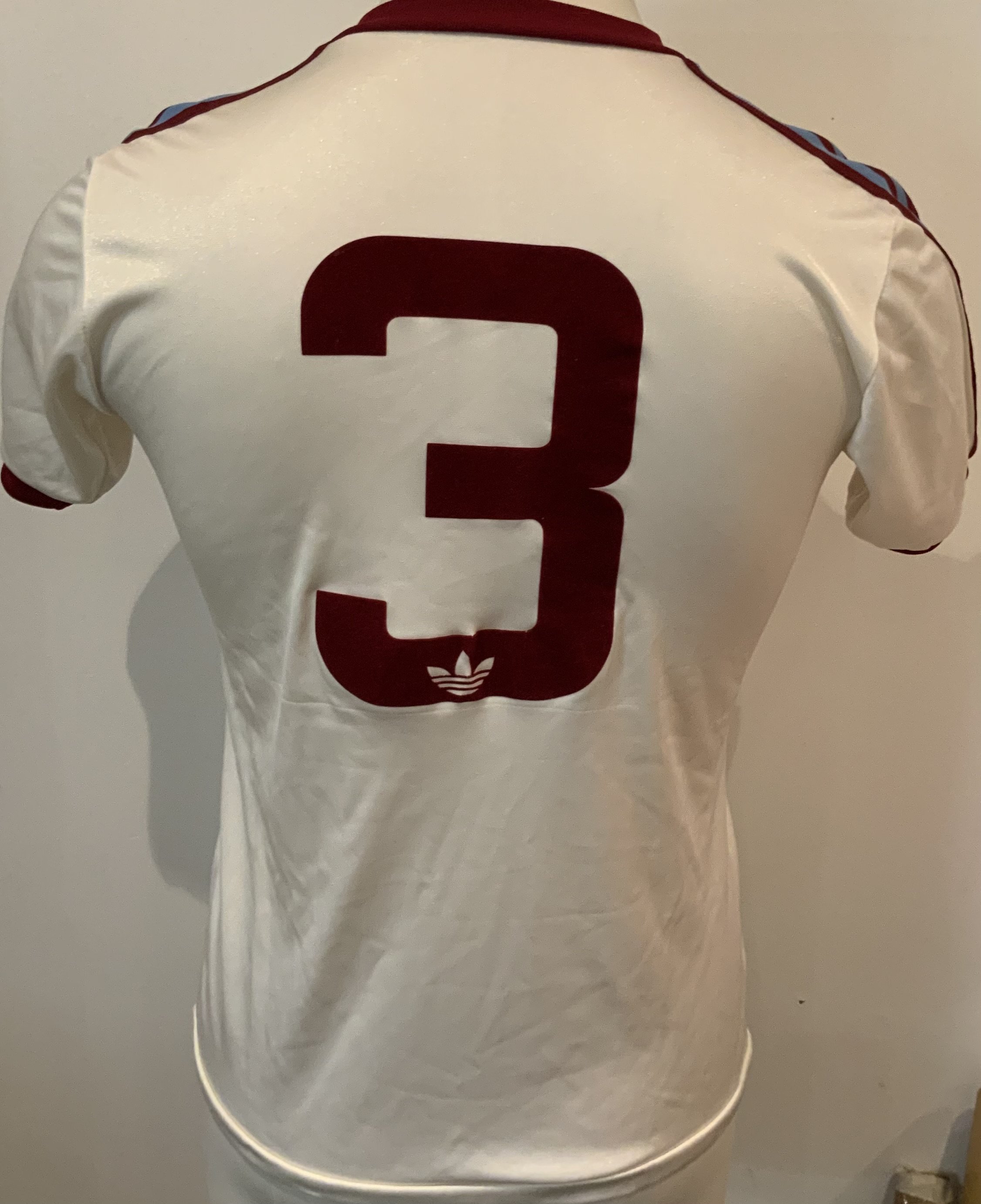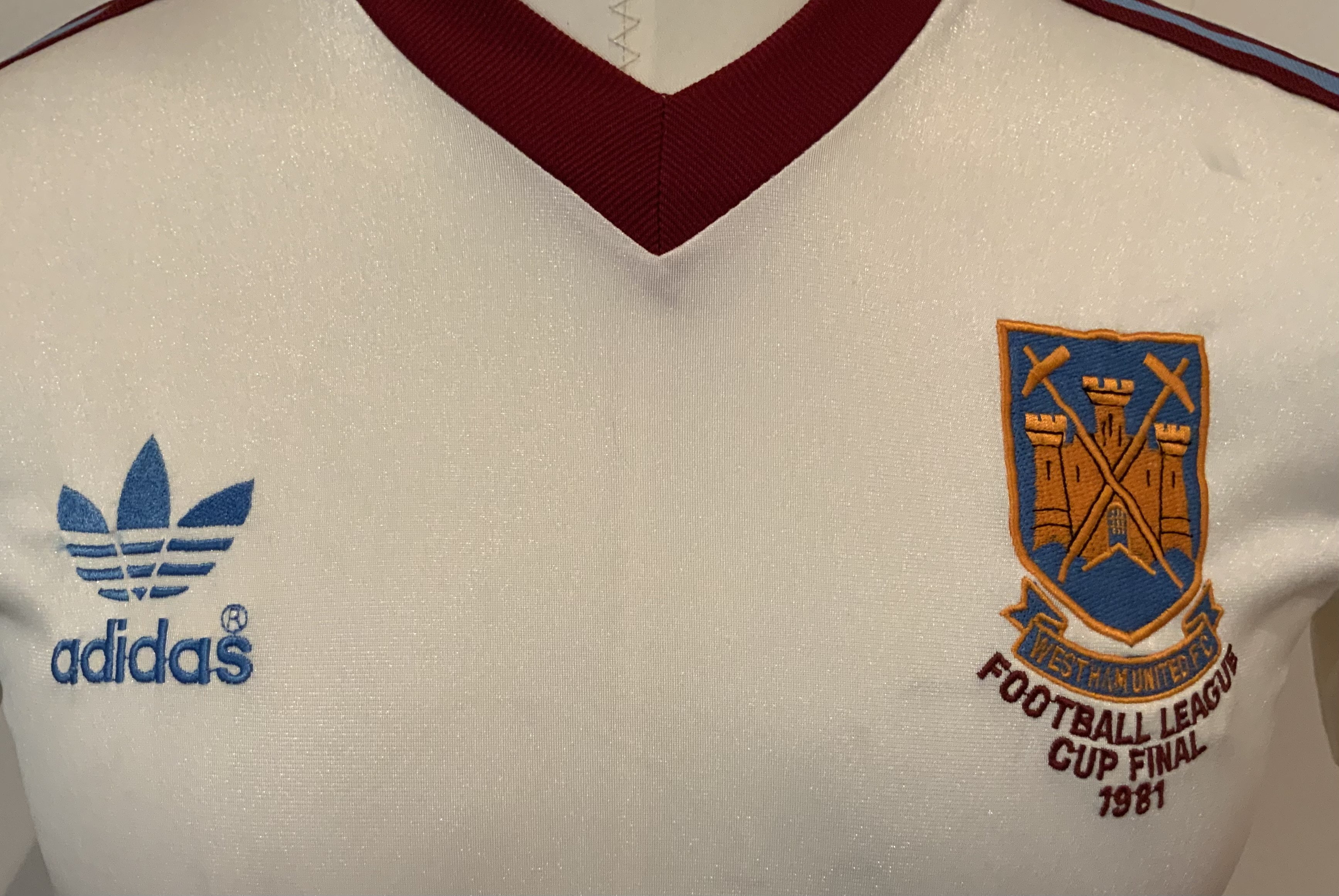 West Ham 1981 League Cup Final Football Shirt: Frank Lampards Adidas number 3 white shirt from the Final at Wembley which was given to Ron Boyce his friend and assistant manager. Ray Stewart scored a penalty to equalise with the last kick of the match after Clive Thomas had controversially allowed the Liverpool opener. In very good condition. No label to collar which we believe was standard for this competition.