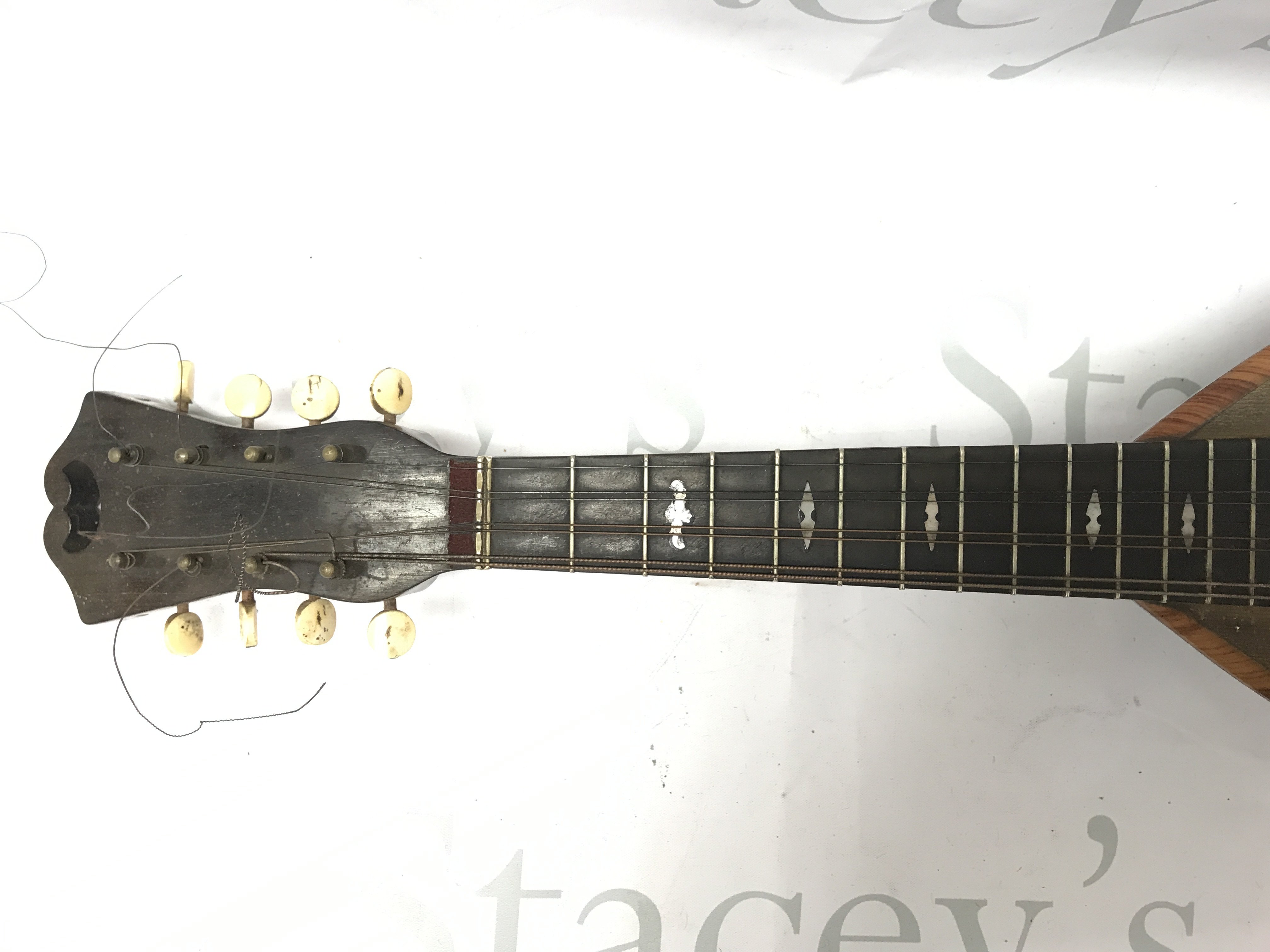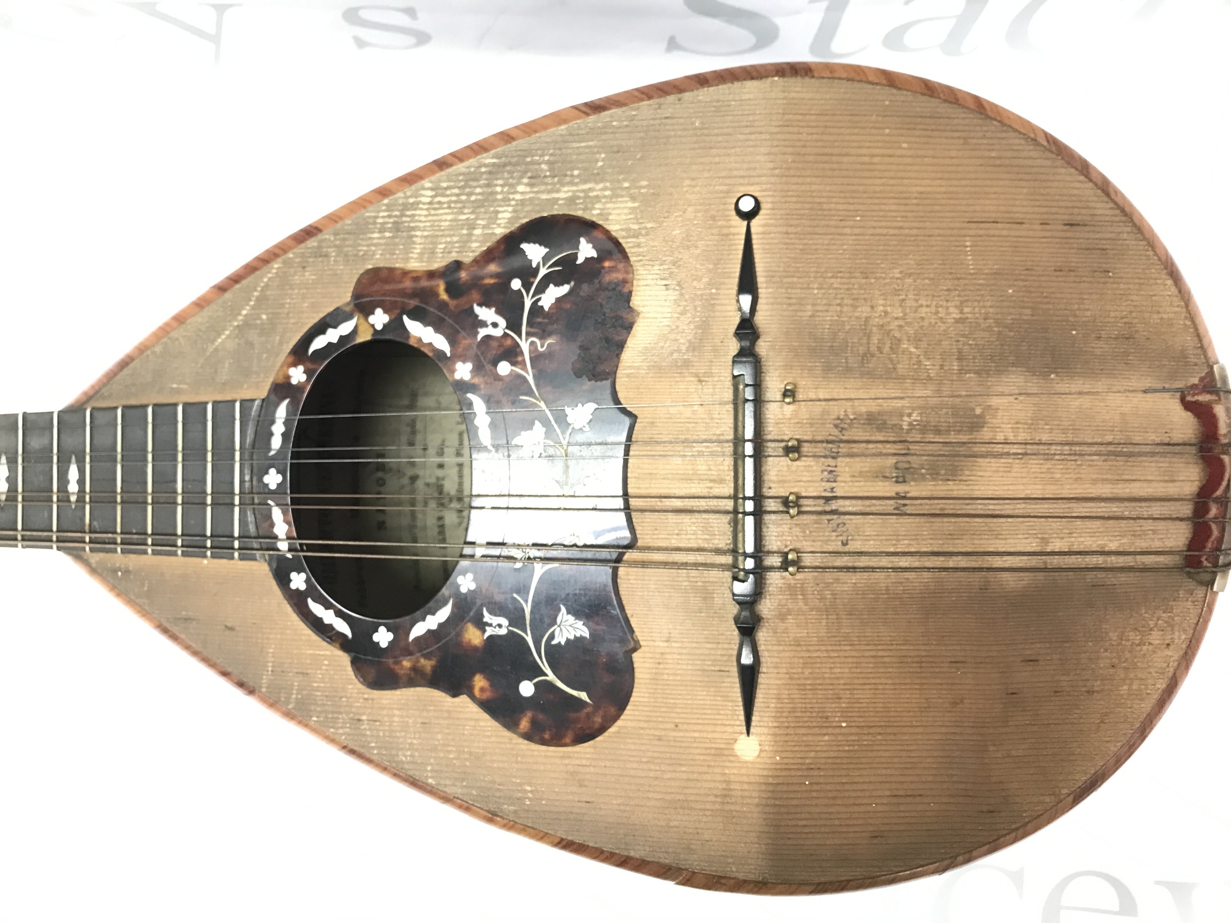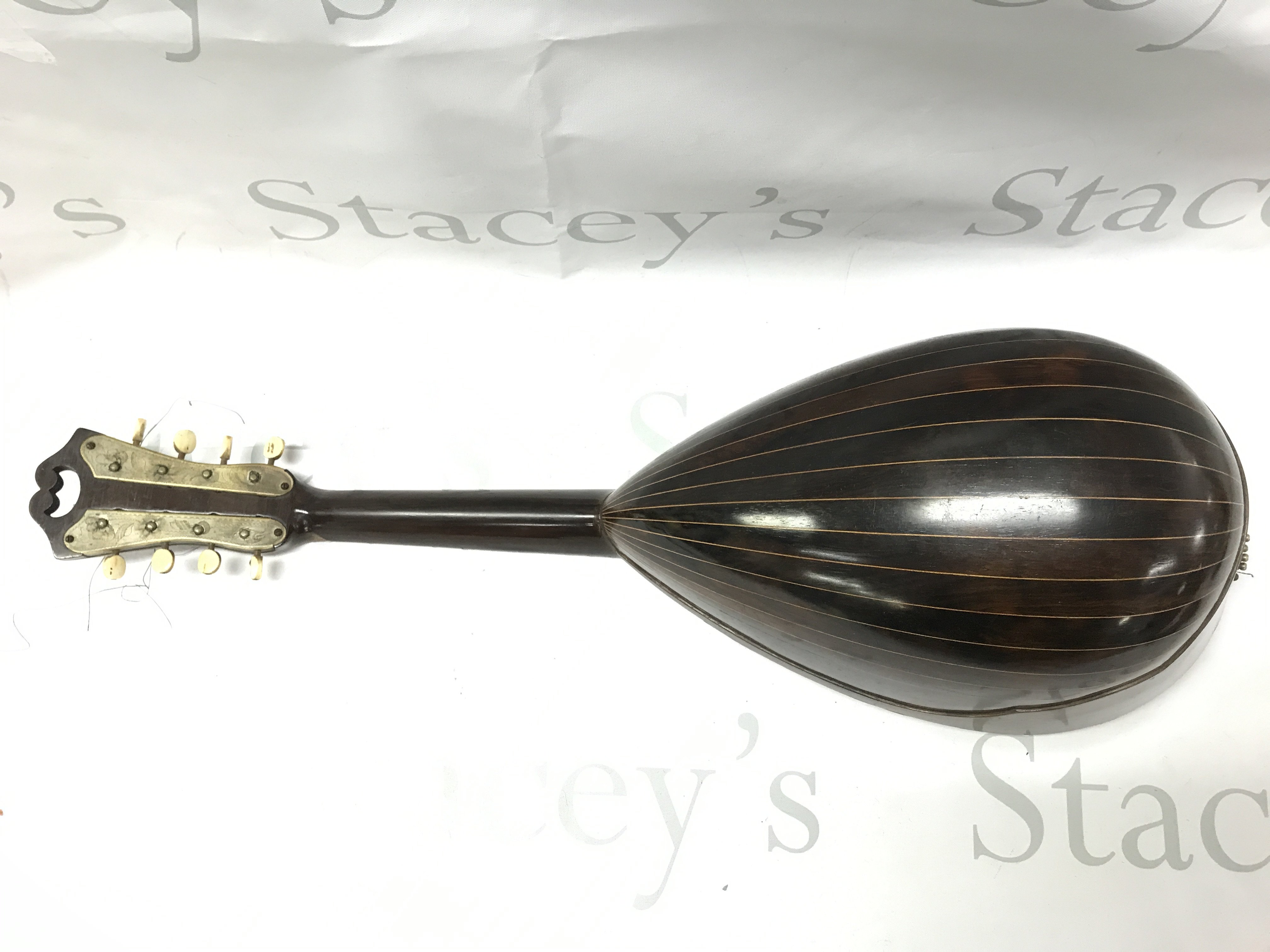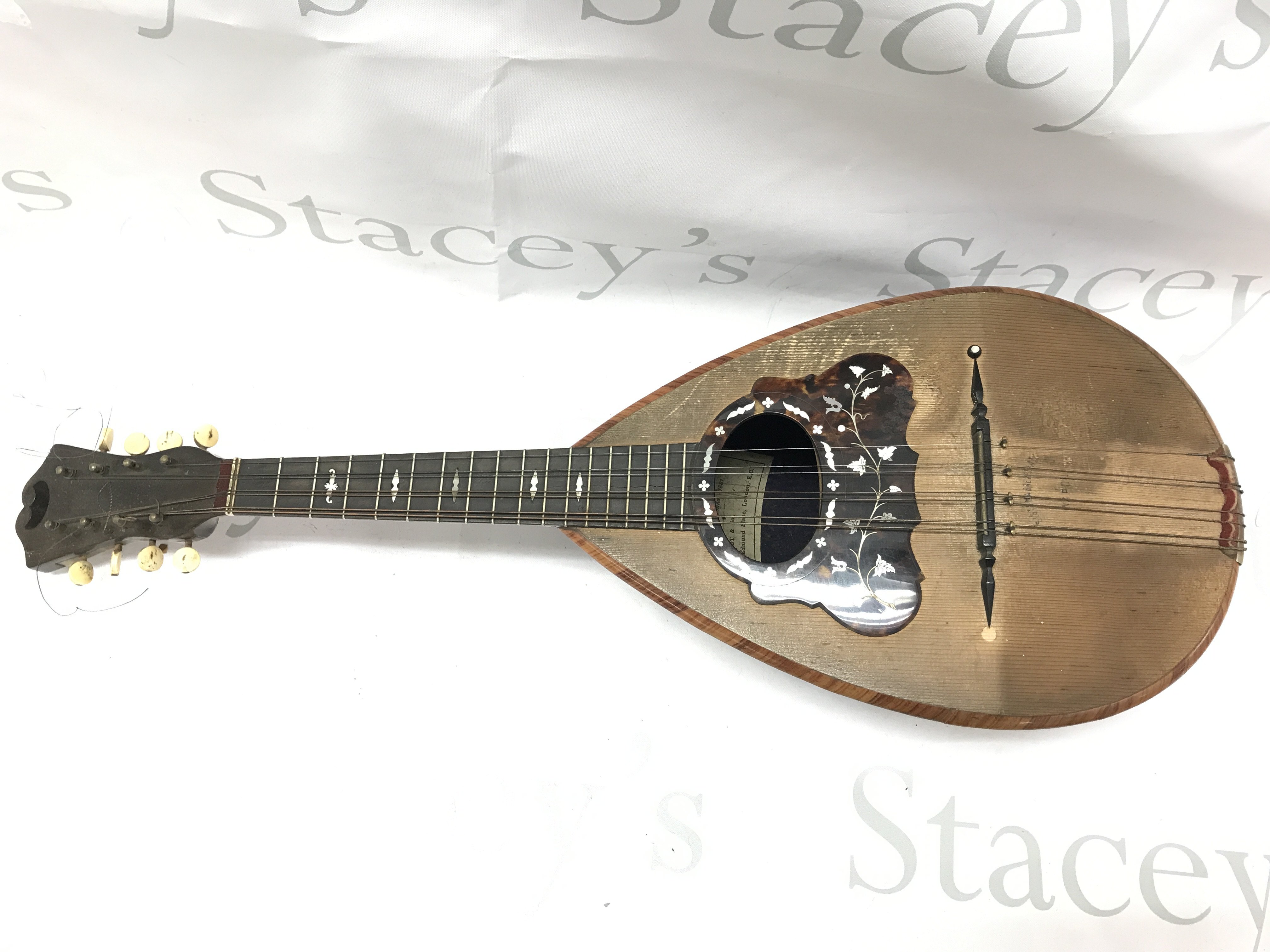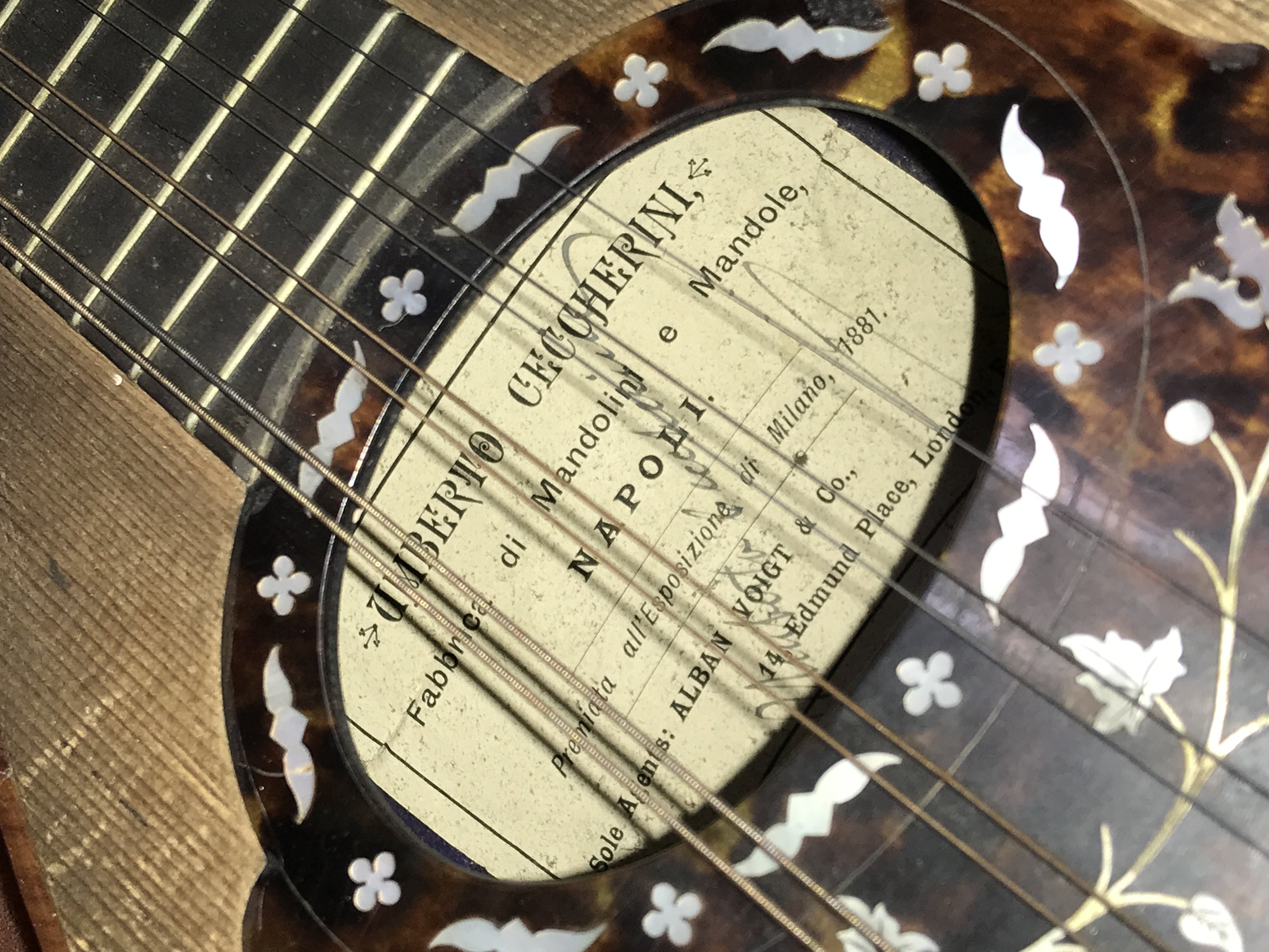 A Neapolitan Mandolin by Umberto Ceccherini, circa 1881 , 62cm long approximately. Label reads umberto ceccherini fabbrica di mandolini e mandole napoli premiate all esposizione di milano 1881 sole agents alban voigt & co 14 edmund place london. Postage category C