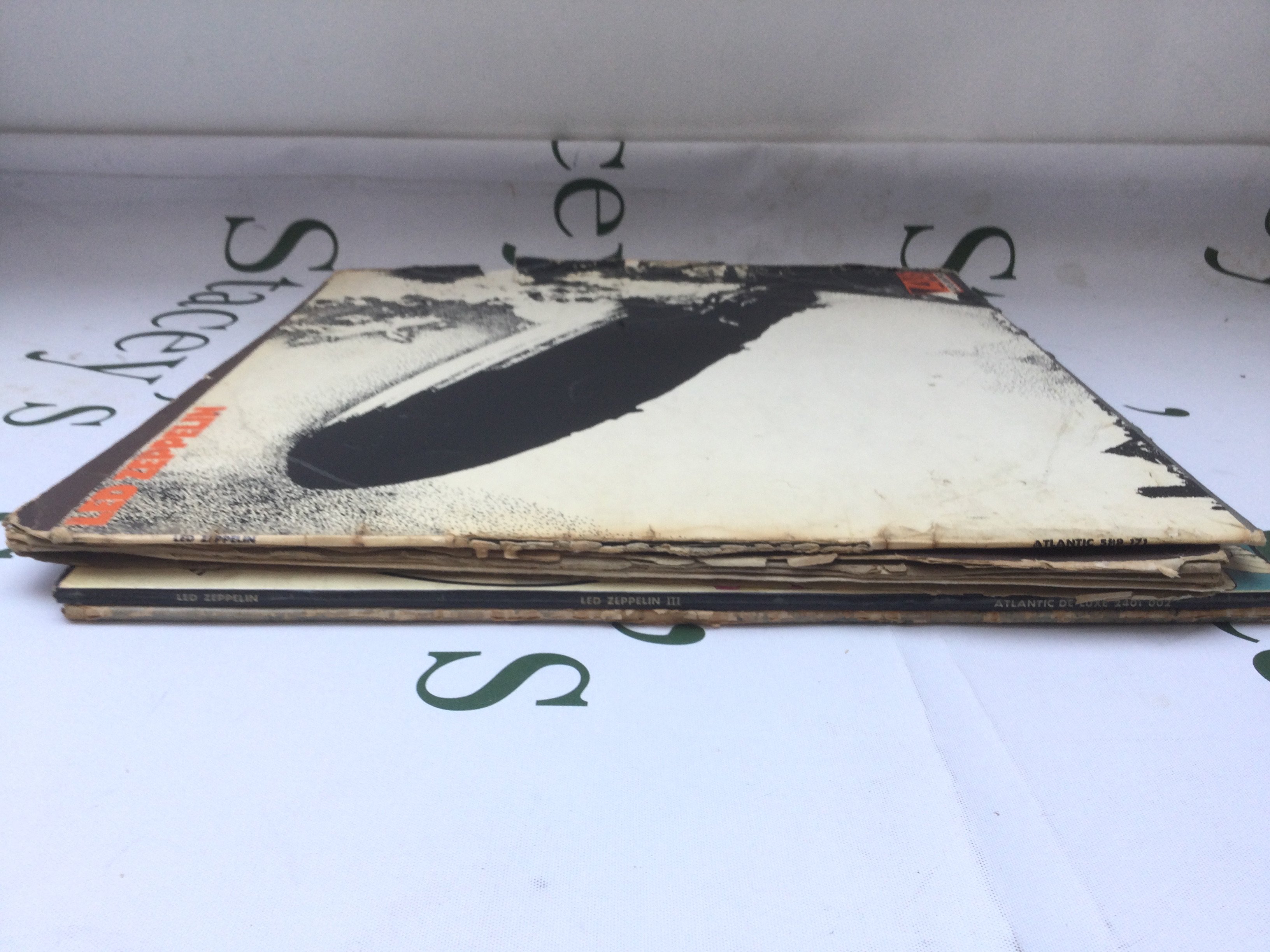 The first four Led Zeppelin LPs on red/plum Atlantic labels. All have outer cover and inner sleeve issues. Led Zeppelin 1, 2 & 3 all have a feelable scratch on Side A.