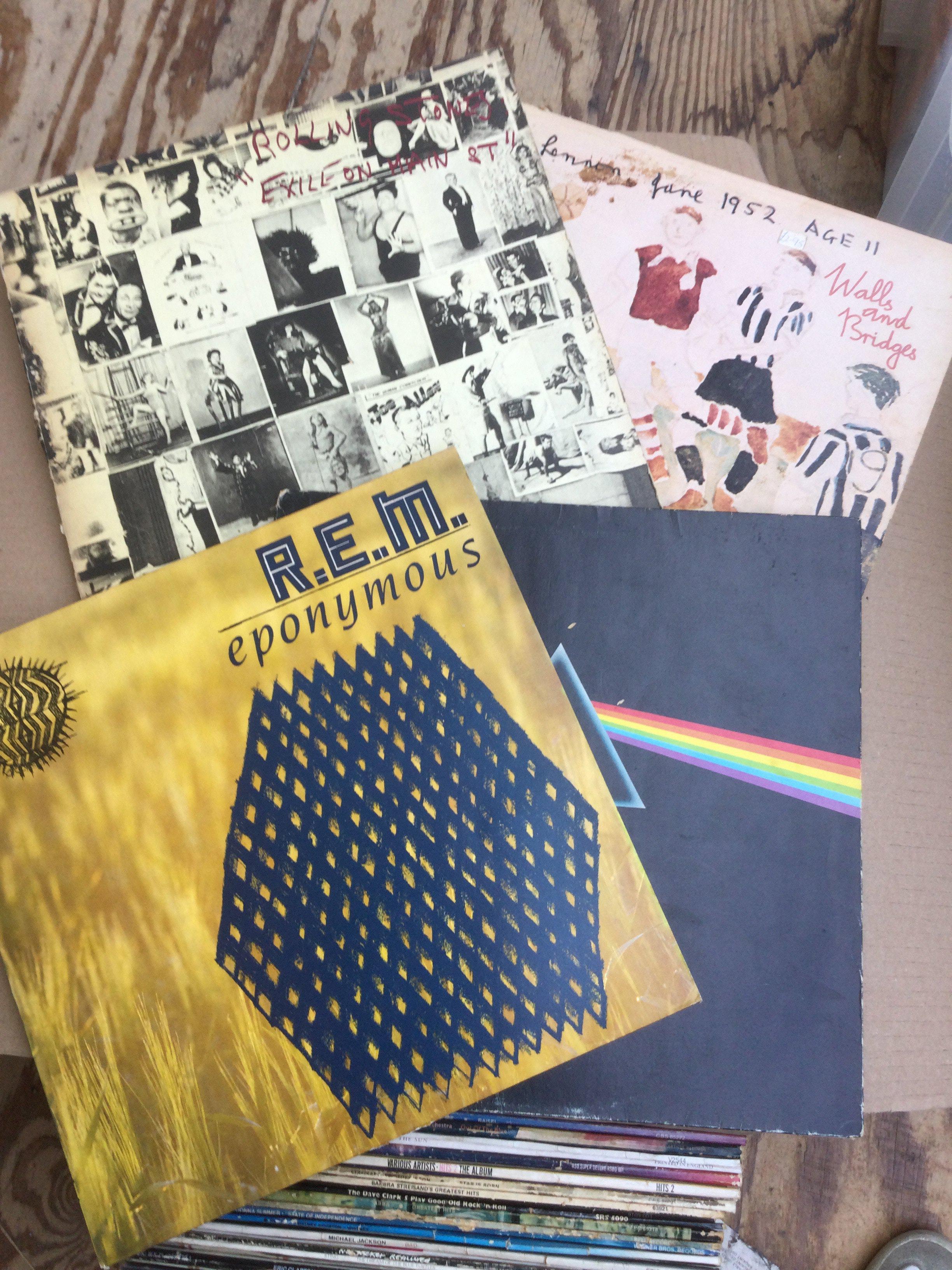 A box and a bag of LPs and 12" singles by various artists including Pink Floyd, The Rolling Stones, REM and many more.