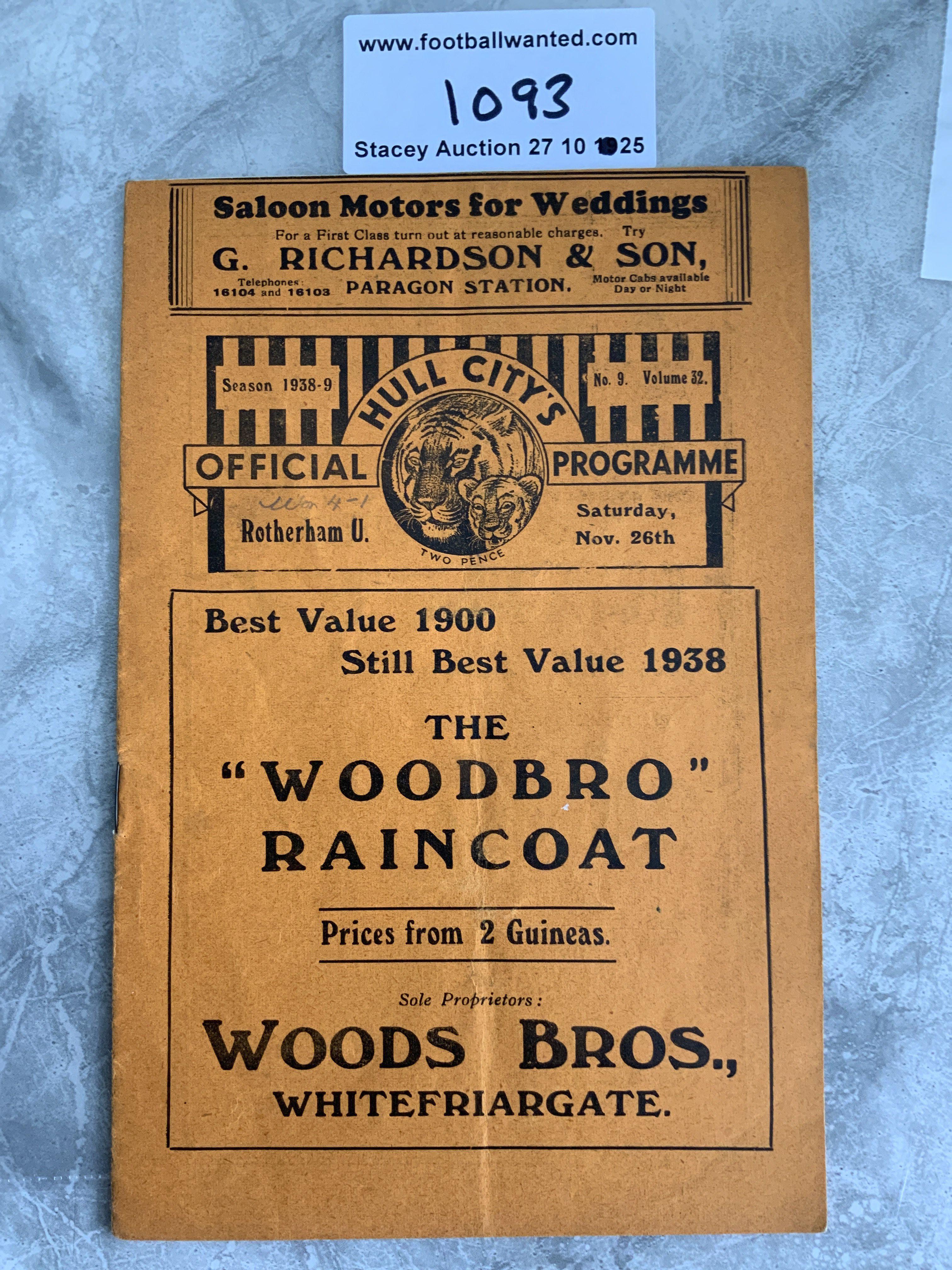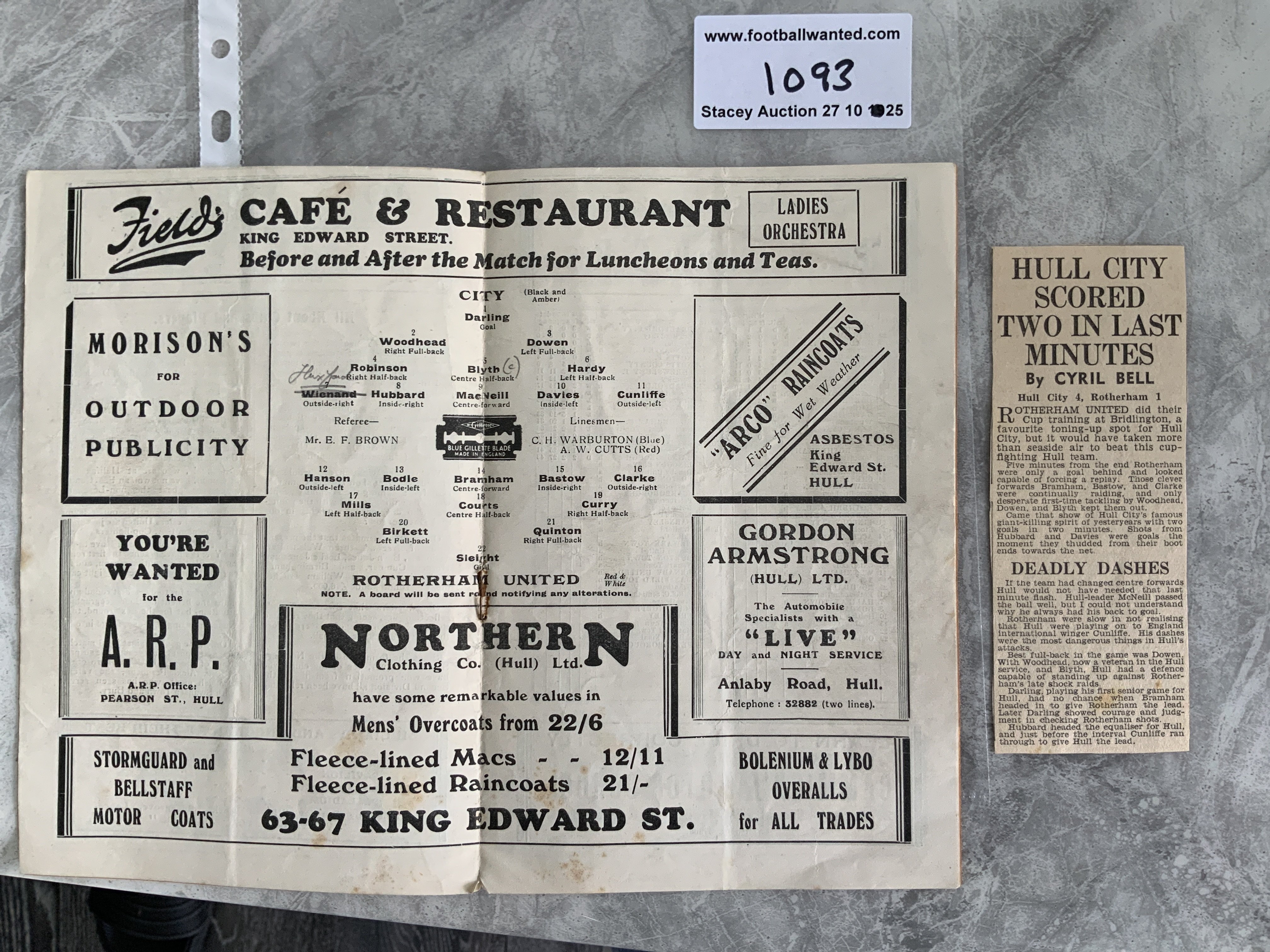 1938 - 1939 Hull City v Rotherham Football Programme: Excellent condition first team programme with one pencilled team change and score. C/W match report cutting.