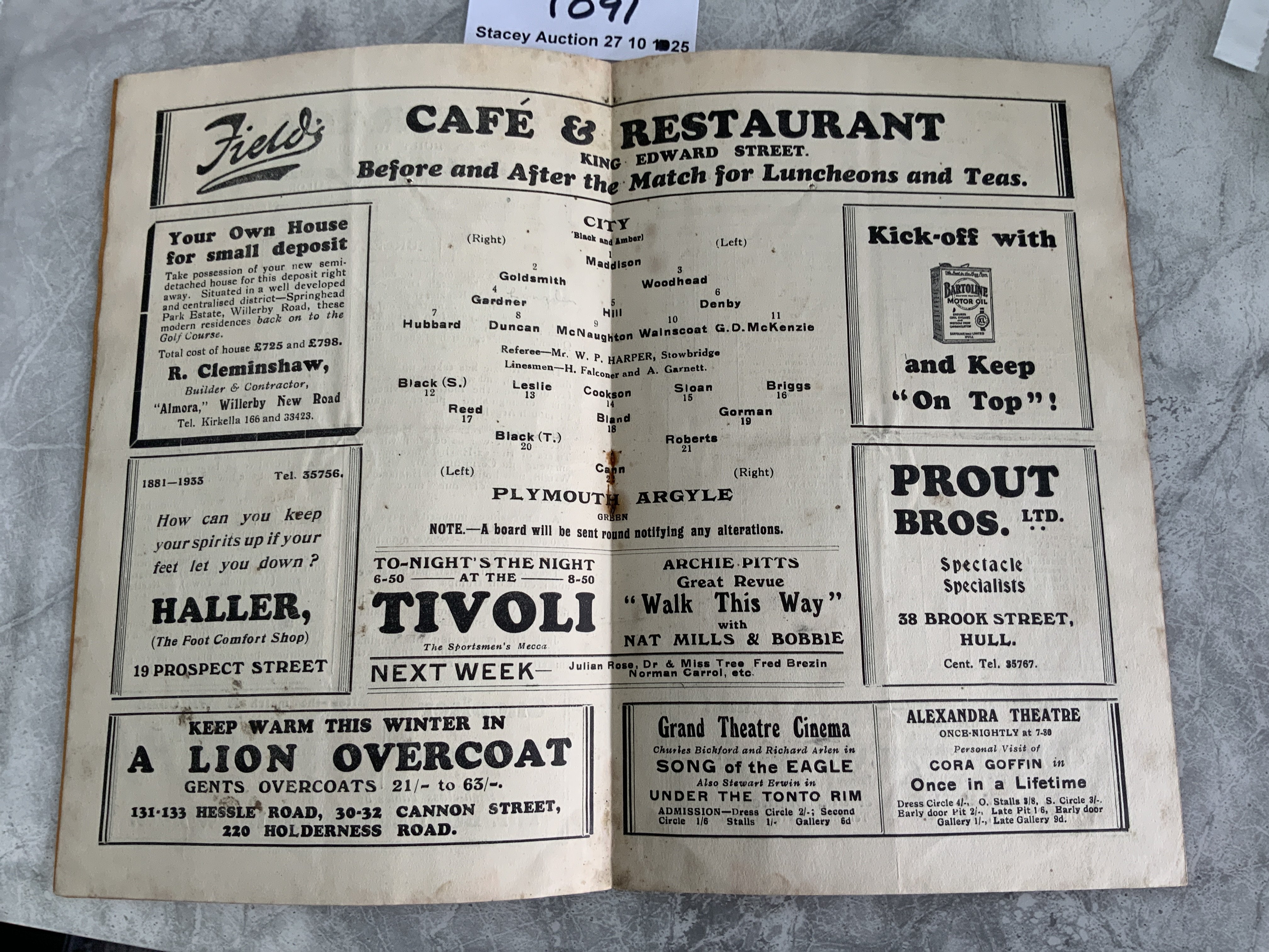 1933 - 1934 Hull City v Plymouth Argyle Football Programme: Excellent condition first team programme with no team changes. Staple removed not rotted away.