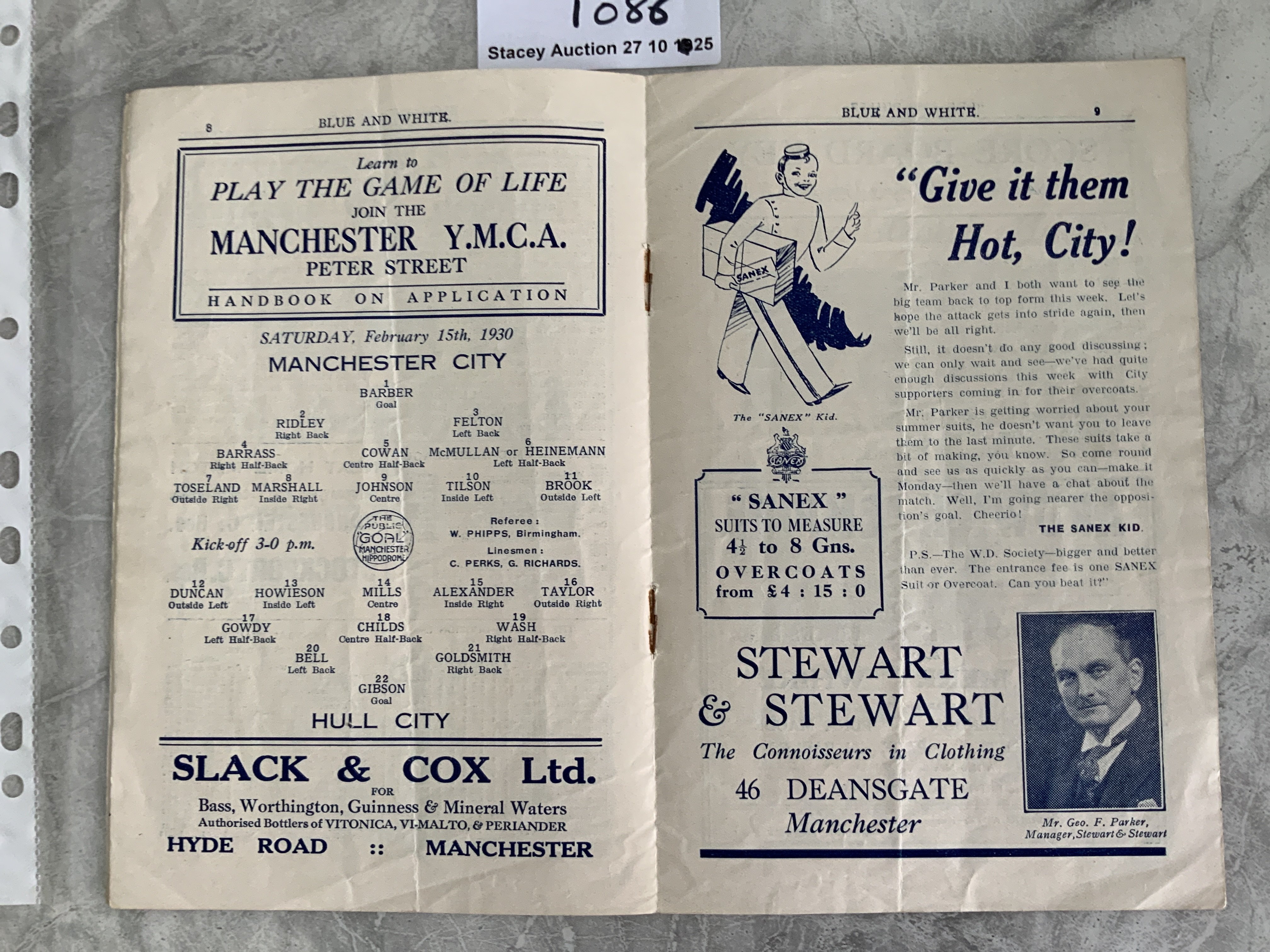 1929 - 1930 Manchester City v Hull City FA Cup Football Programme: Fair/good condition first team programme with no team changes. Fold and small tear to spine.