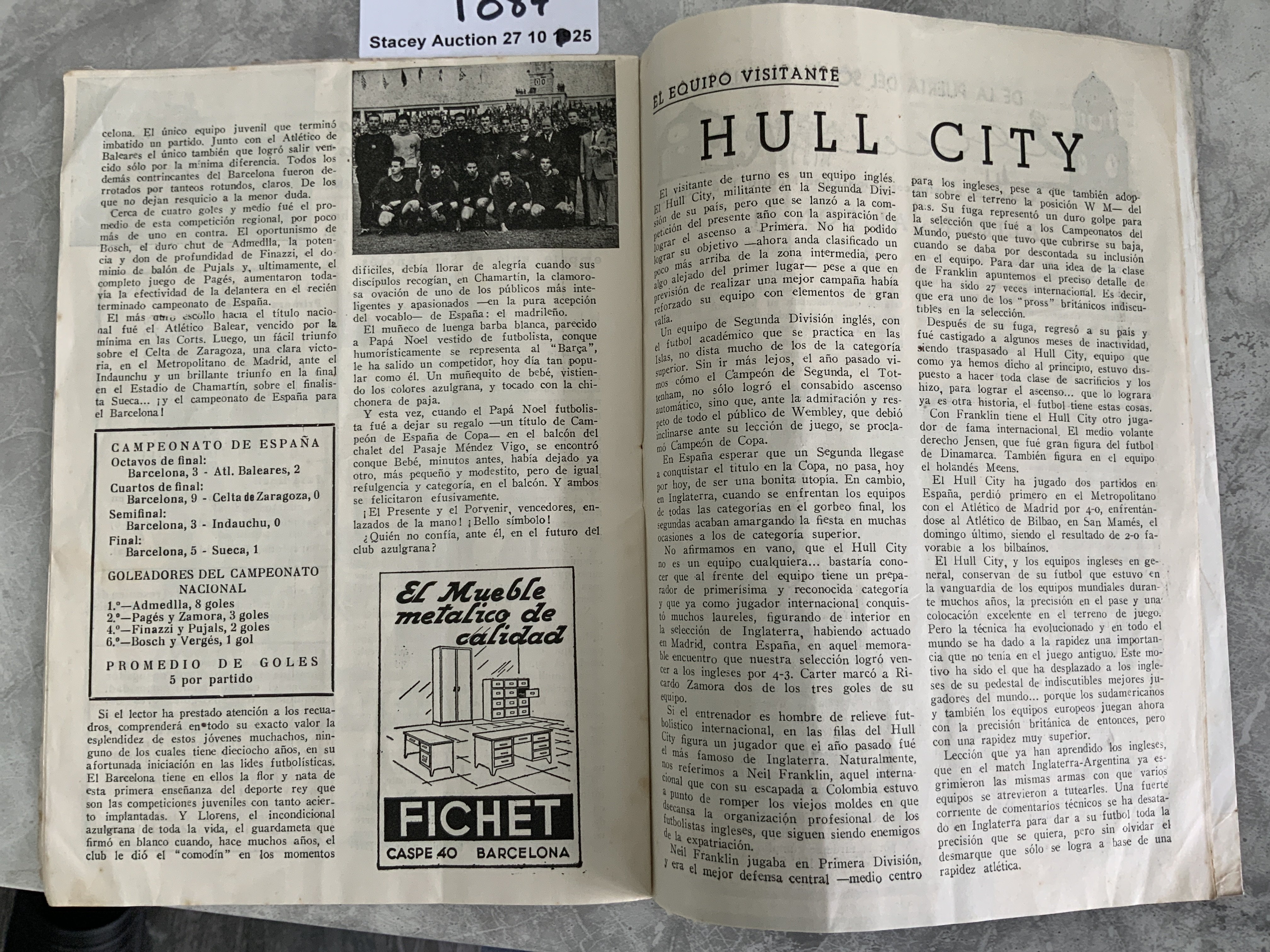 1951 Barcelona v Hull City Football Programme: Fair condition programme with no team changes. Piece missing from front cover border. Hull travelled to Spain straight after their Festival of Britain match.
