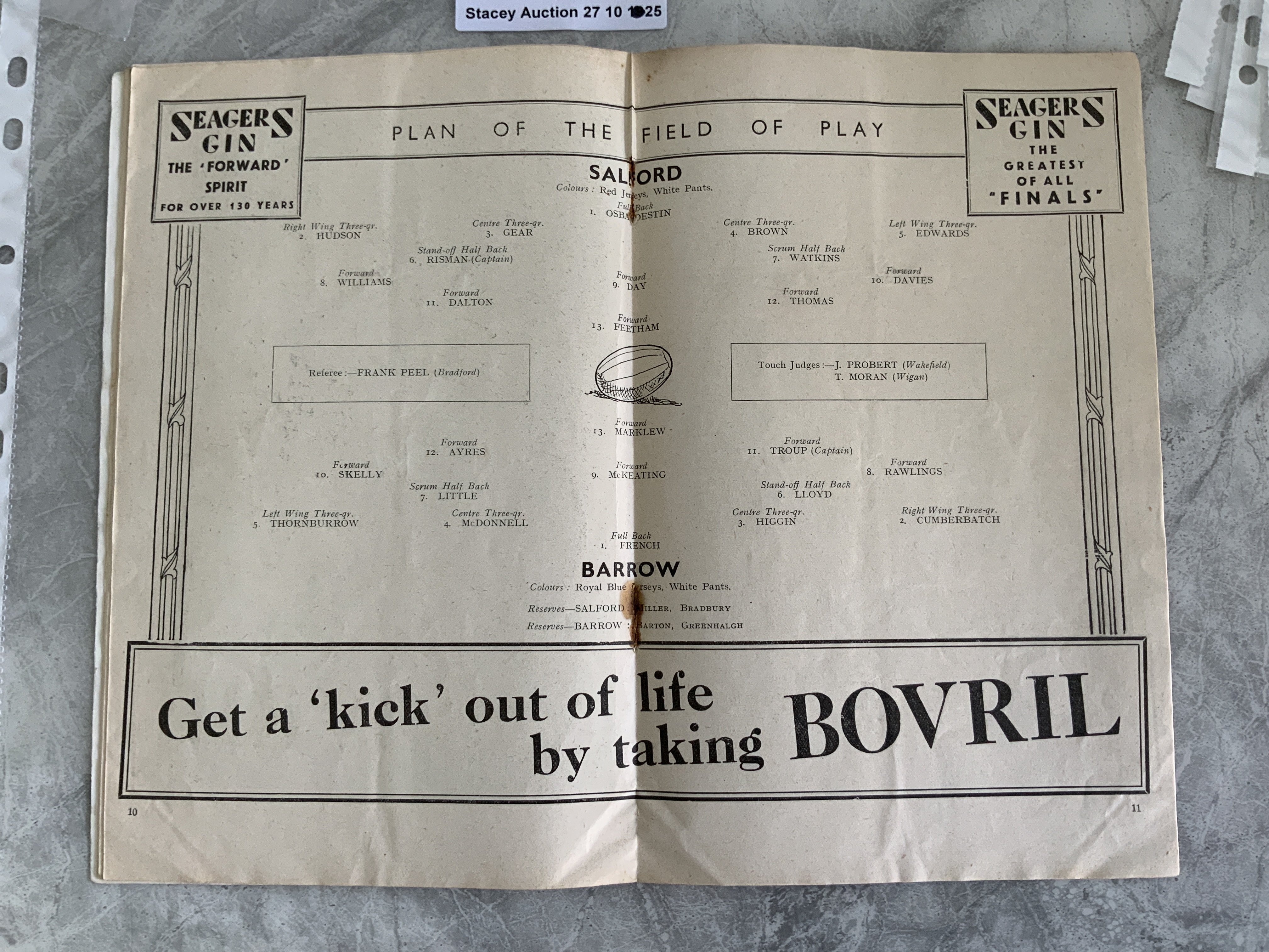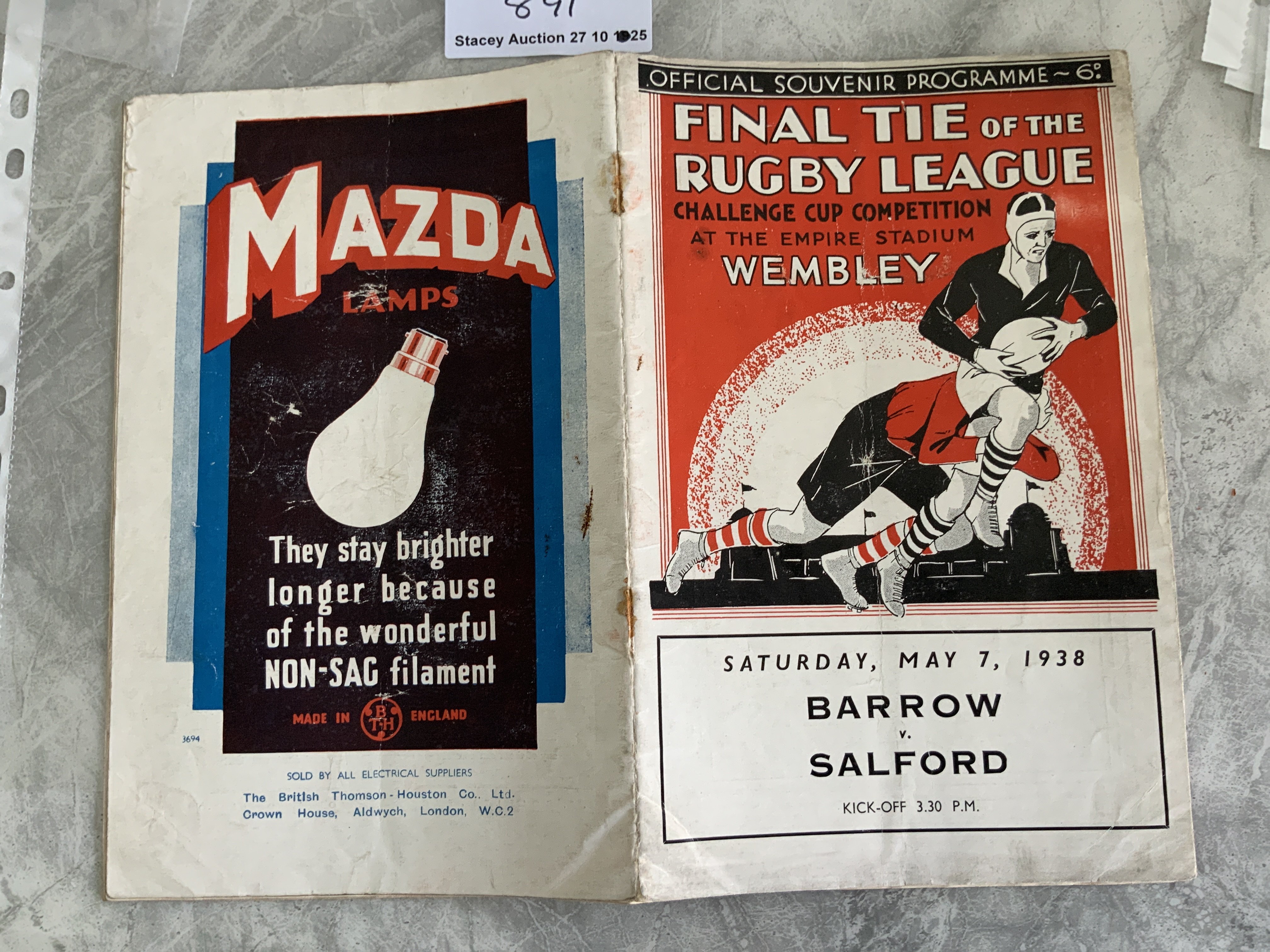 1938 Rugby League Cup Final Football Programme: Salford v Barrow played at Wembley in good condition with no team changes. Similar style to FA Cup final programme of same season. Ex rusty staples have left a hole where they used to be.