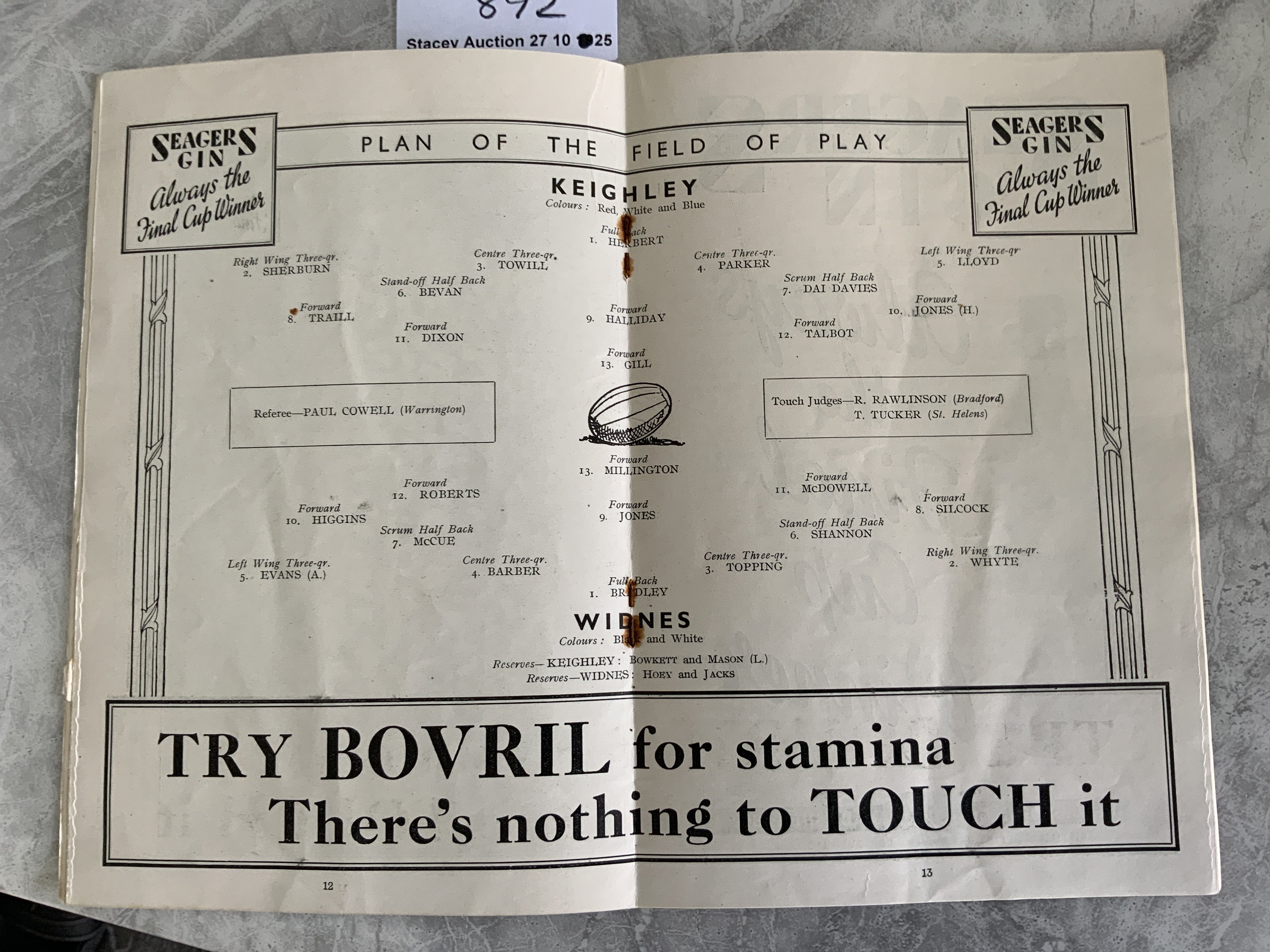 1937 Rugby League Cup Final Football Programme: Keighley v Widnes played at Wembley in good condition with no team changes. Similar style to FA Cup final programme of same season. Rusty staples holding firm.