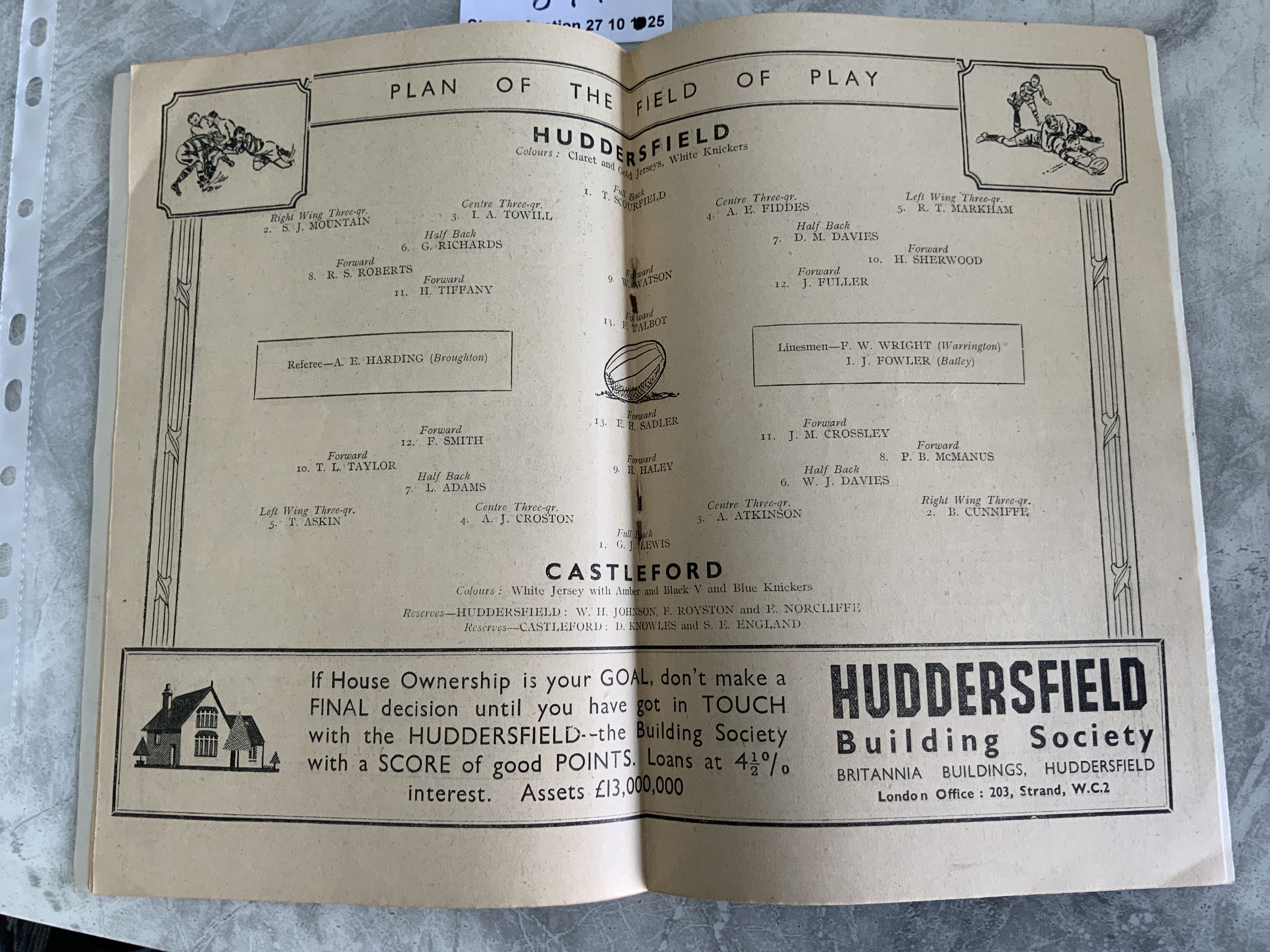 1935 Rugby League Cup Final Football Programme: Huddersfield v Castleford played at Wembley in very good condition with no team changes. Similar style to FA Cup final programme of same season. Ex rusty staples have left a hole where they used to be. Rare to find without fold on this special edition card cover that was used for jubilee year.