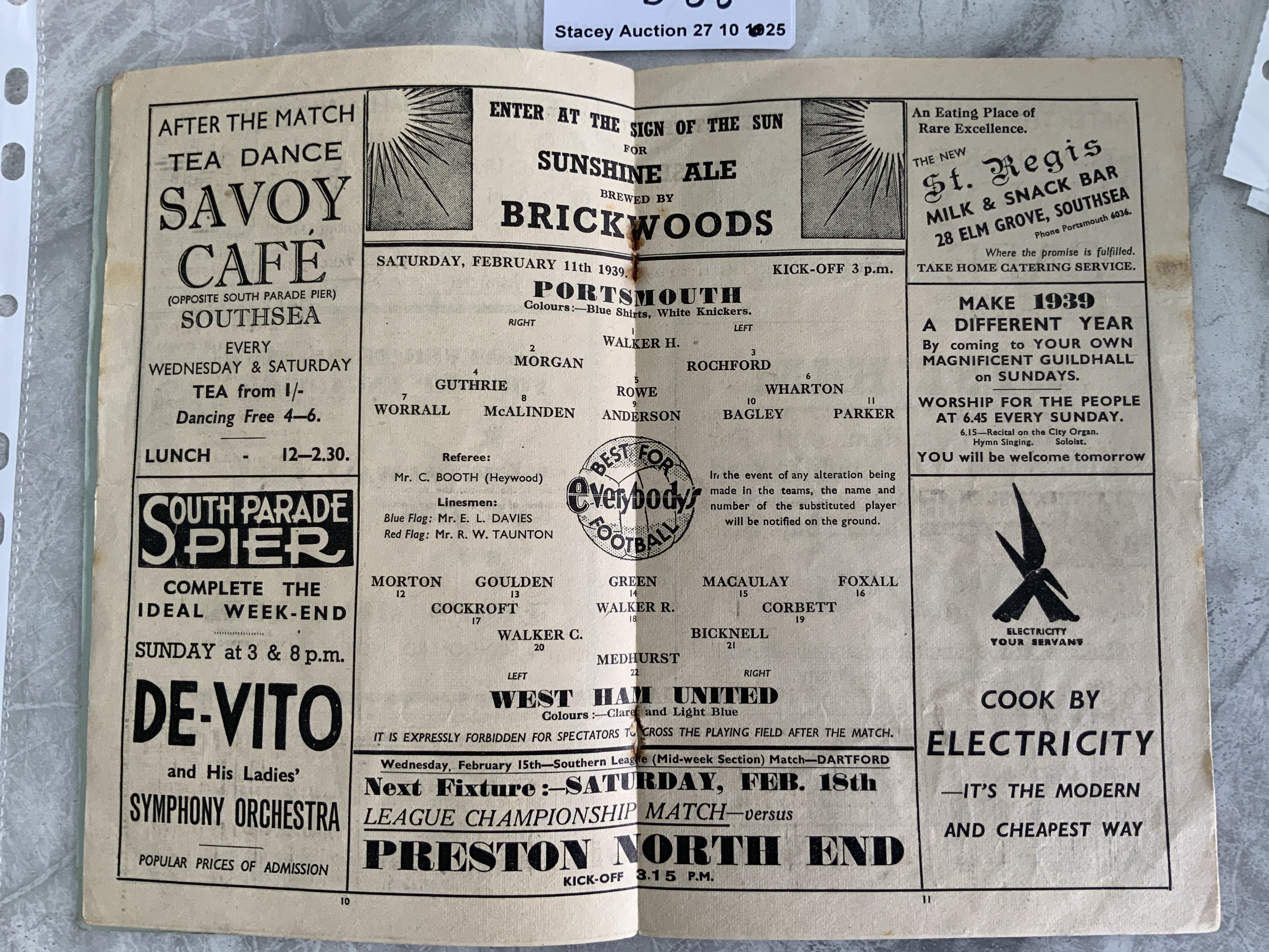 38/39 Portsmouth v West Ham FA Cup Football Programme: Fair condition with no team changes. Staples missing and some wear. Portsmouth went on to win the FA Cup.