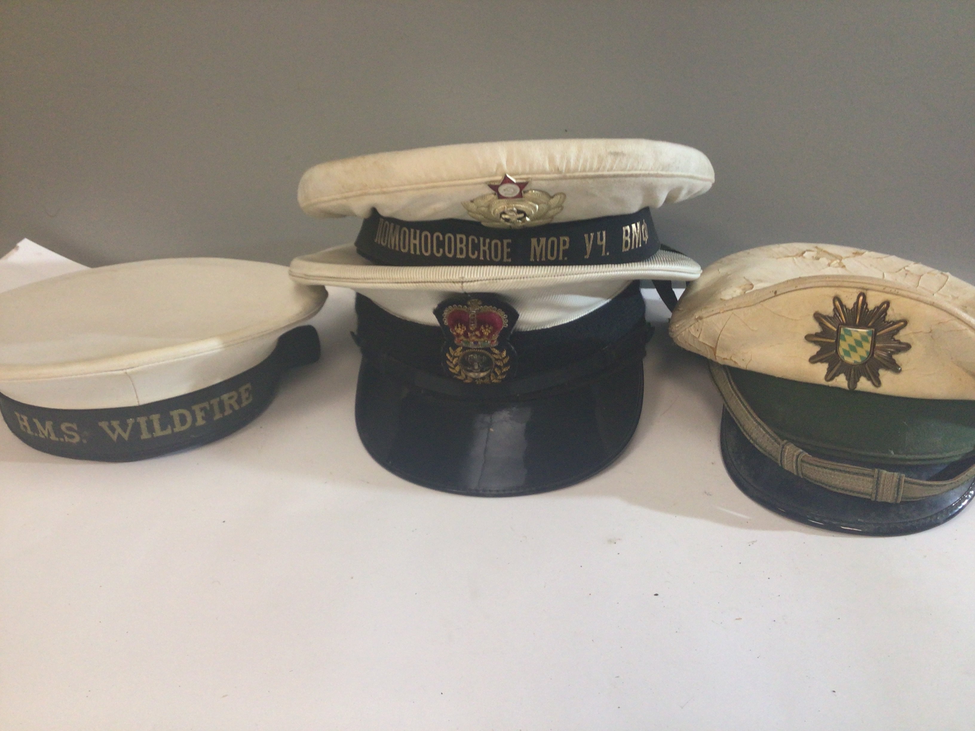 A collection of cloth Caps. HMS Wildfire RAF German Police Russian Navy (5)